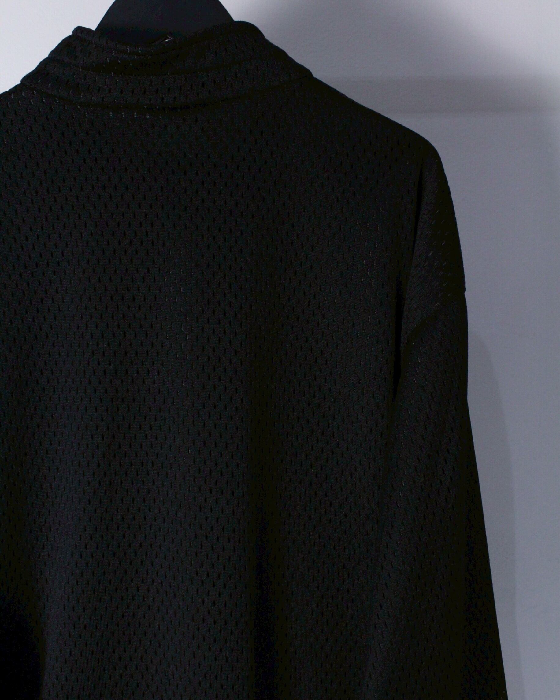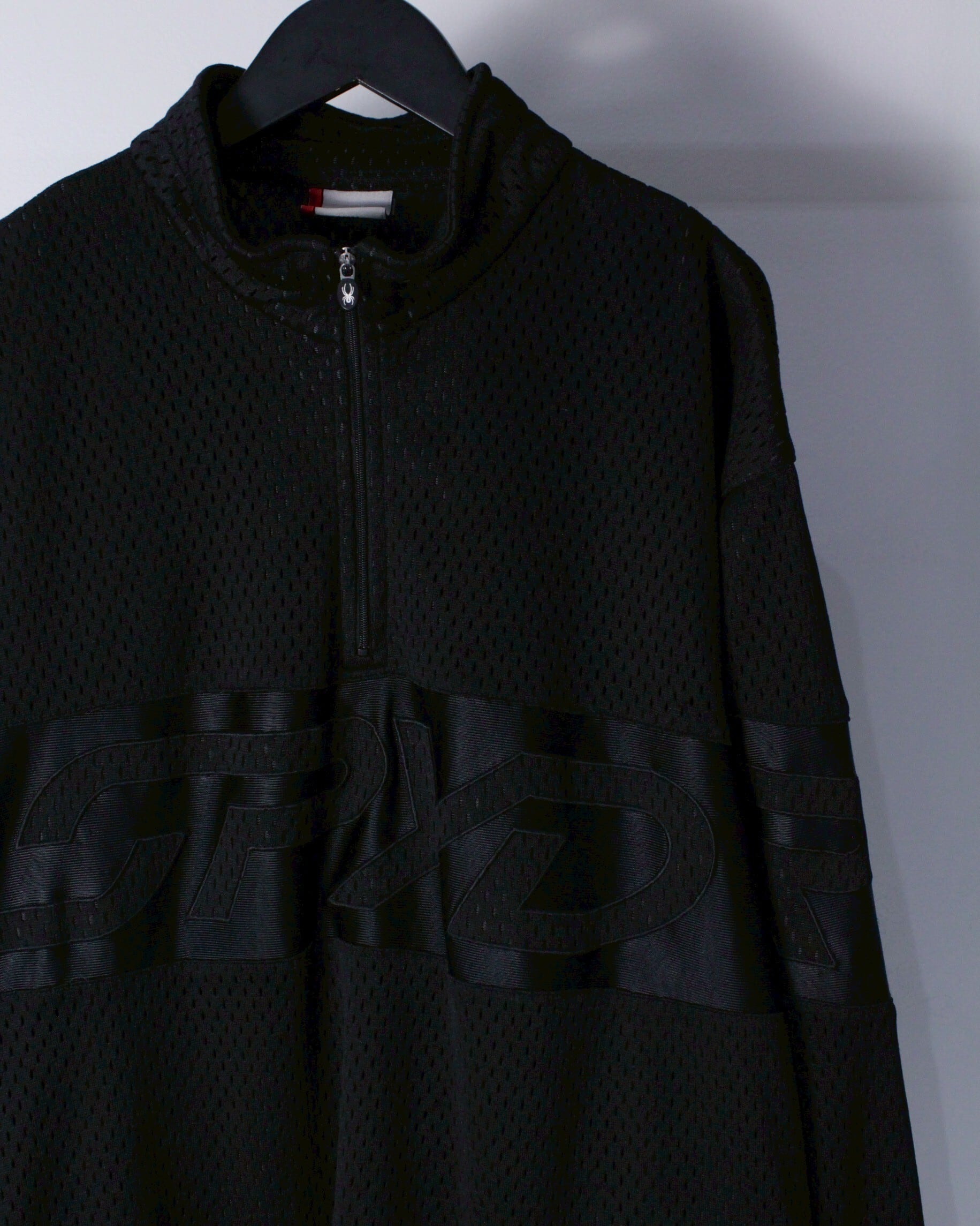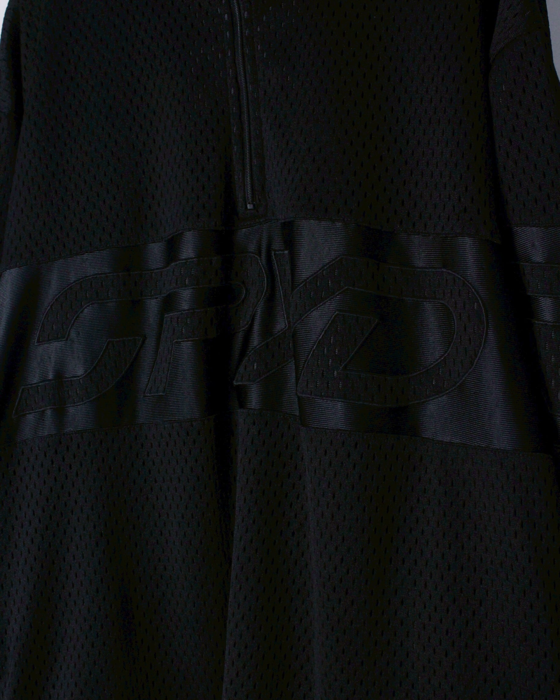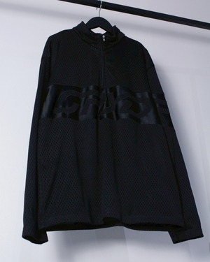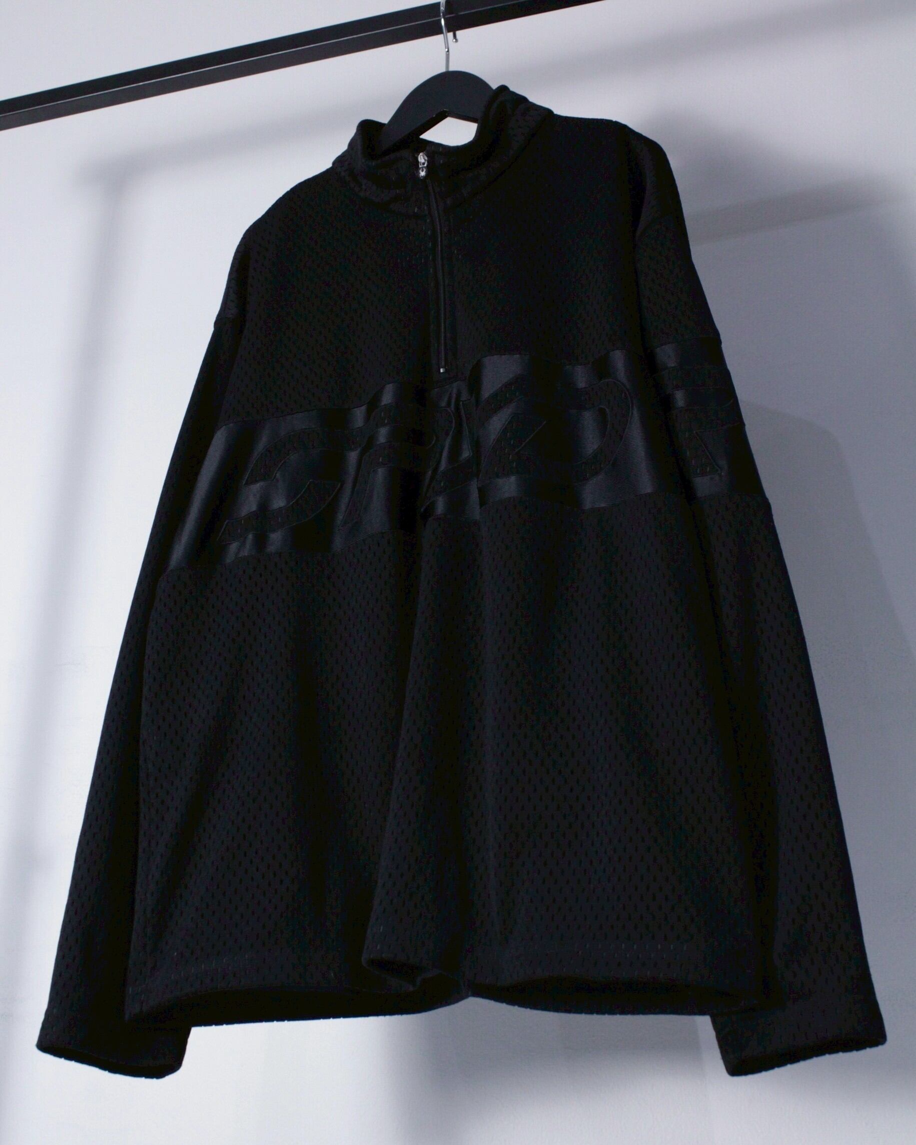 ブラックのメッシュ生地をボディのベースとし、フロントにブランドロゴの切り替えを施したハーフジッププルオーバー。
