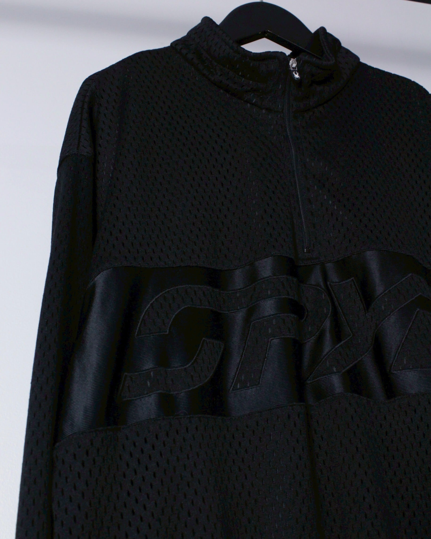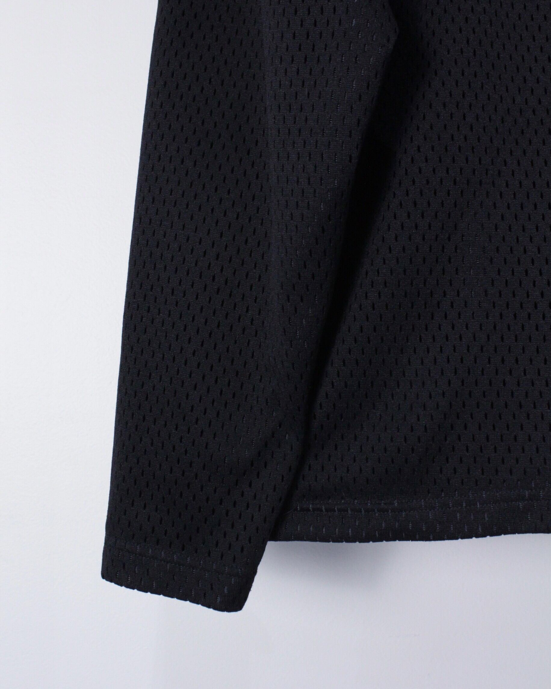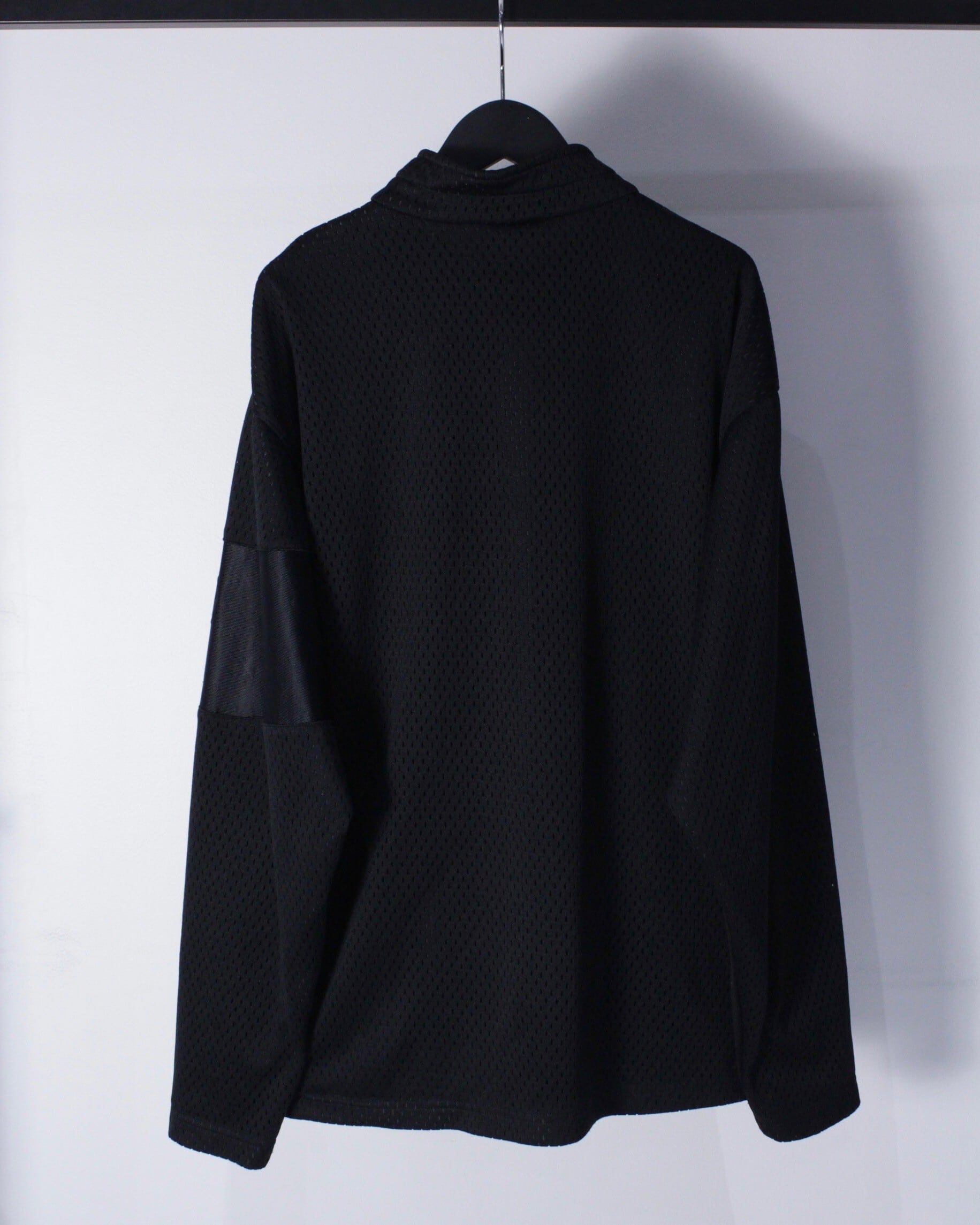 ブラックのメッシュ生地をボディのベースとし、フロントにブランドロゴの切り替えを施したハーフジッププルオーバー。
