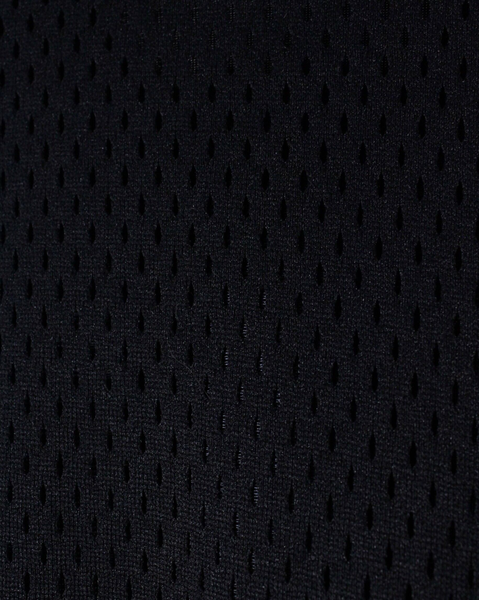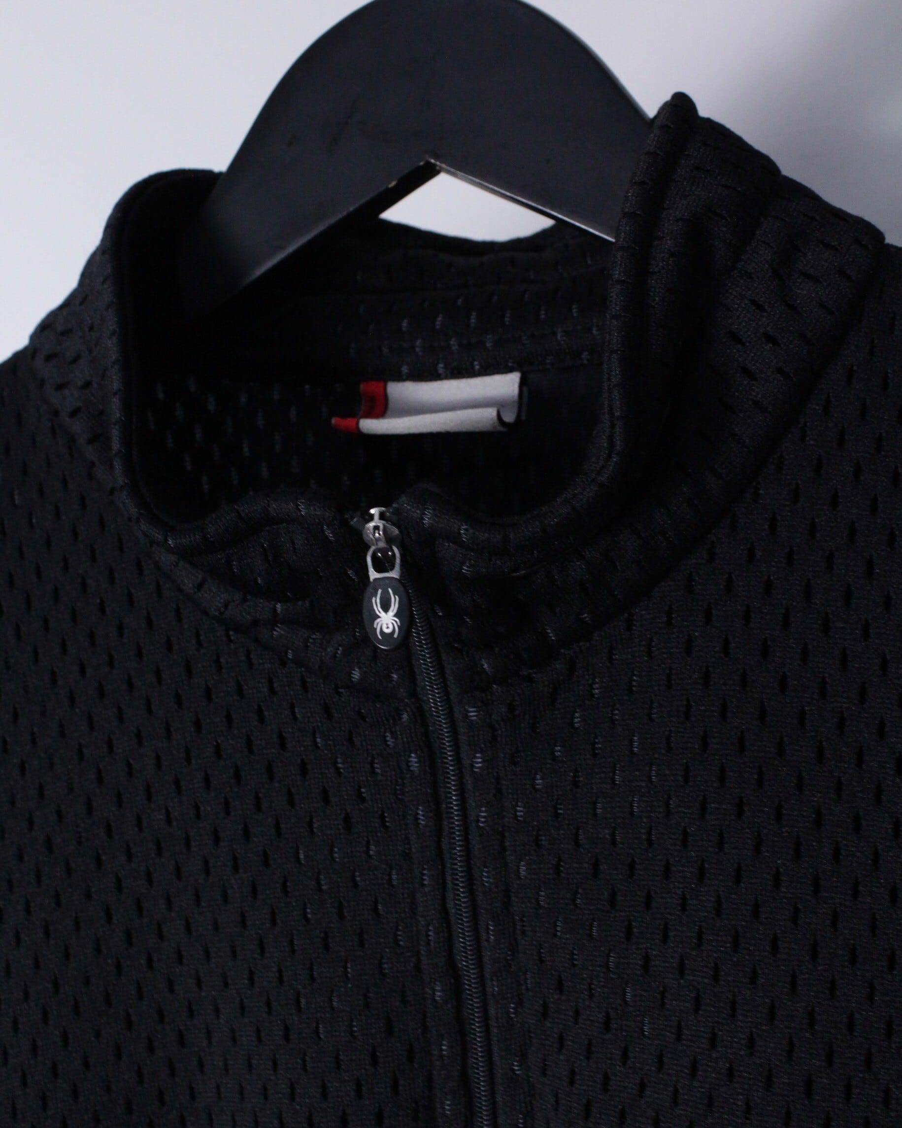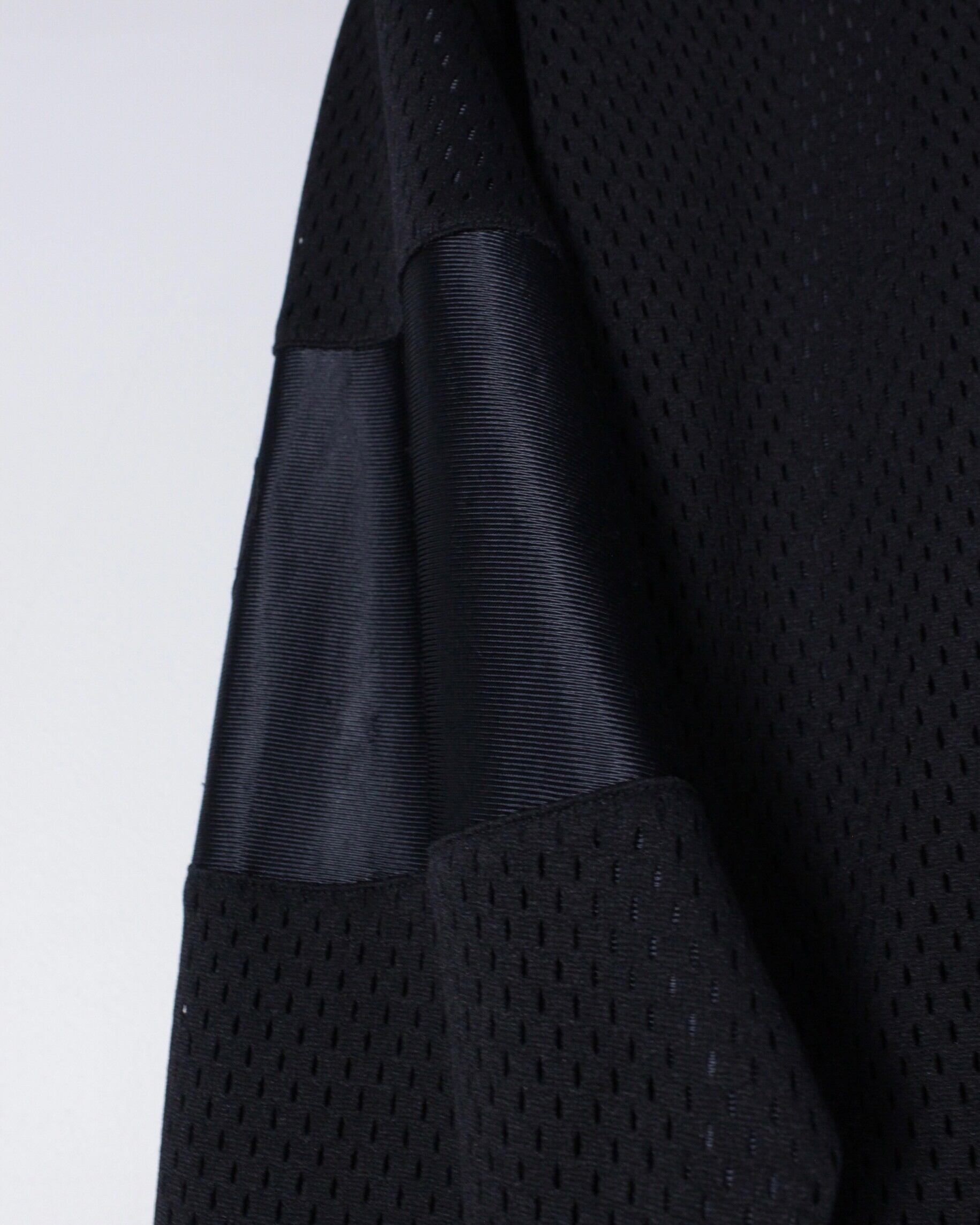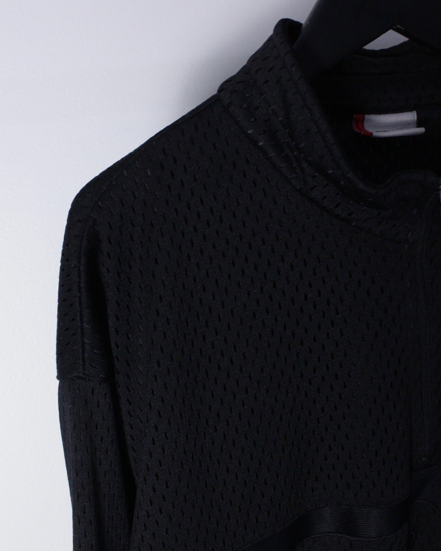 ブラックのメッシュ生地をボディのベースとし、フロントにブランドロゴの切り替えを施したハーフジッププルオーバー。