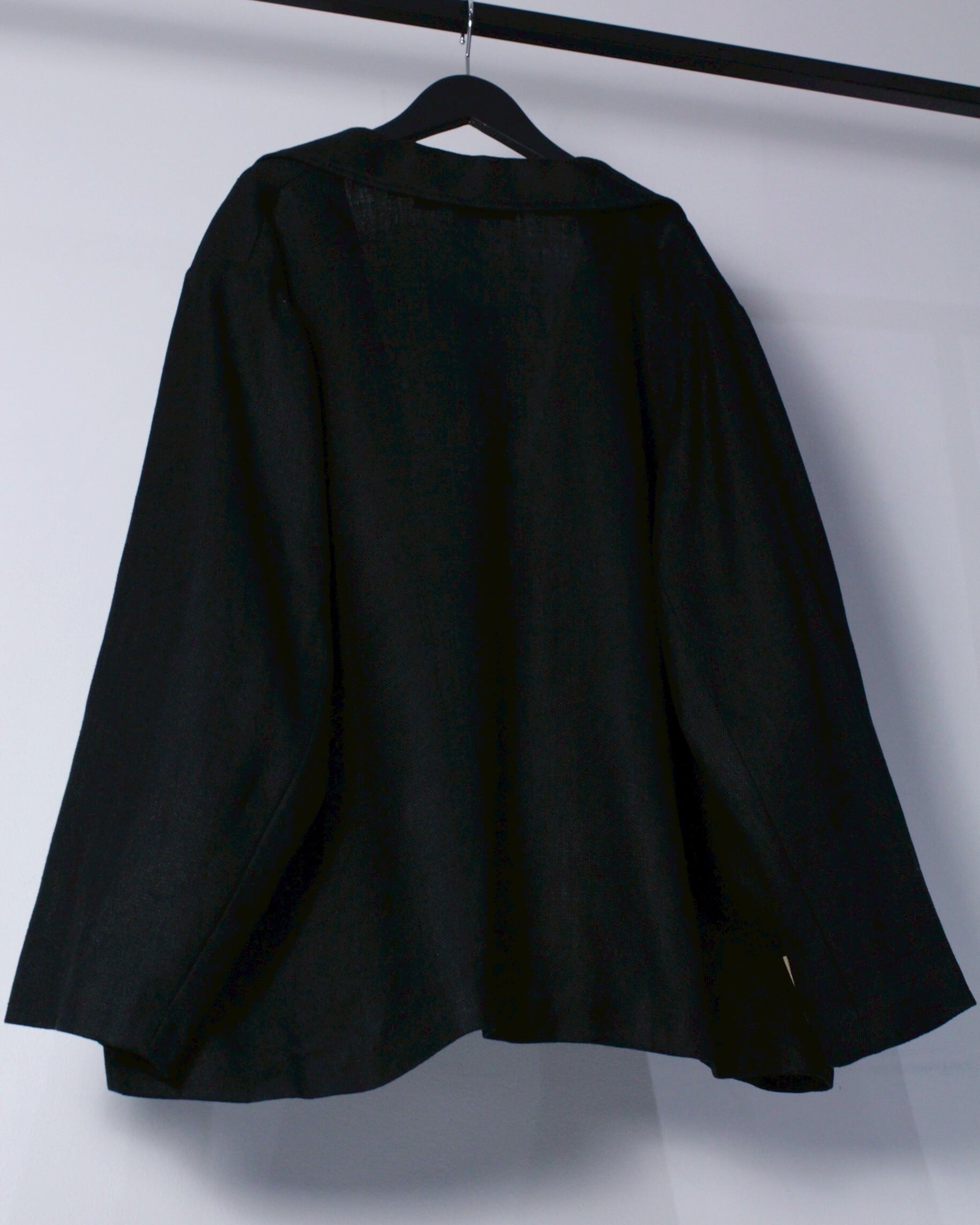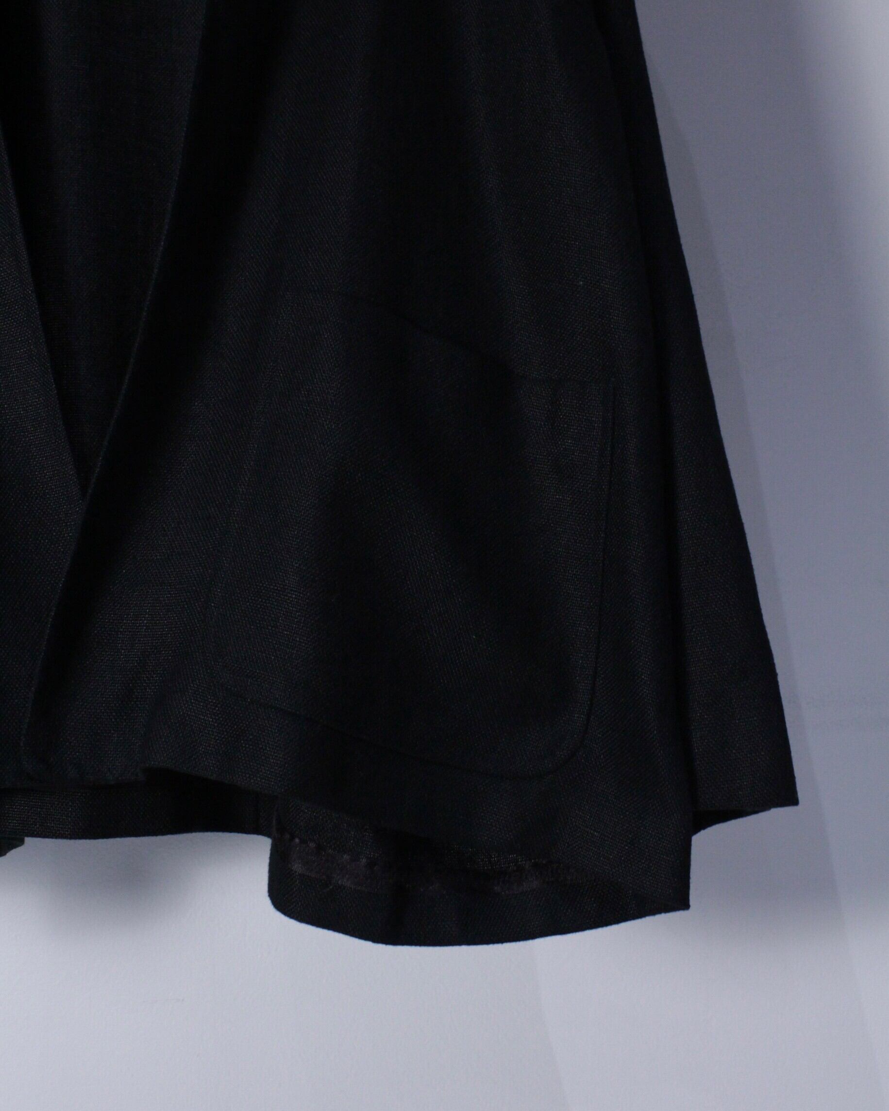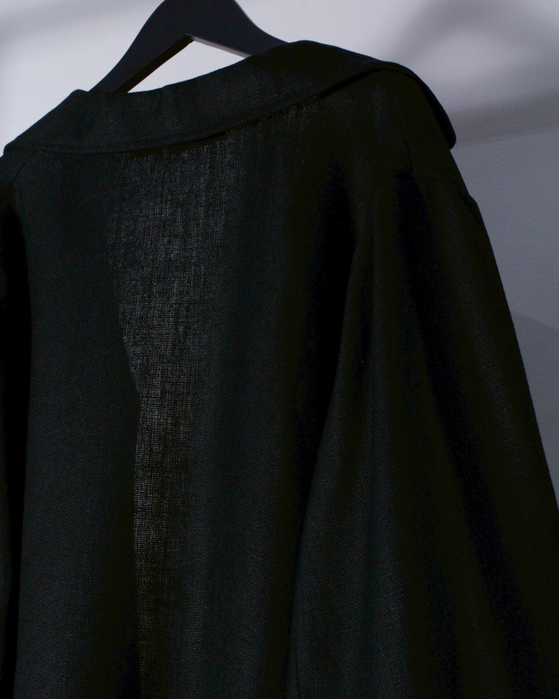 ハリ、コシのある上質なブラックリネンを用いたボタンレス仕様ののカバーオールジャケット。