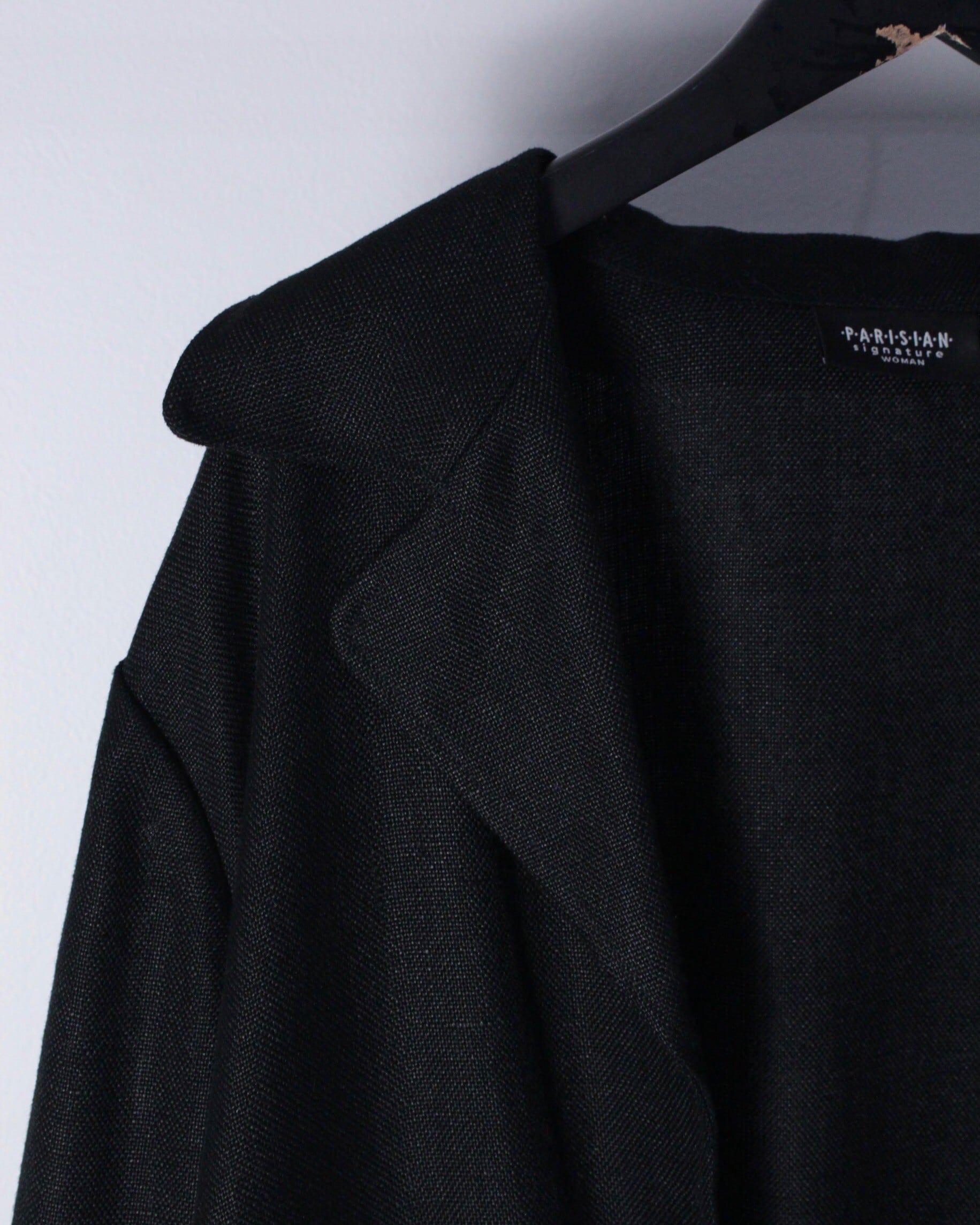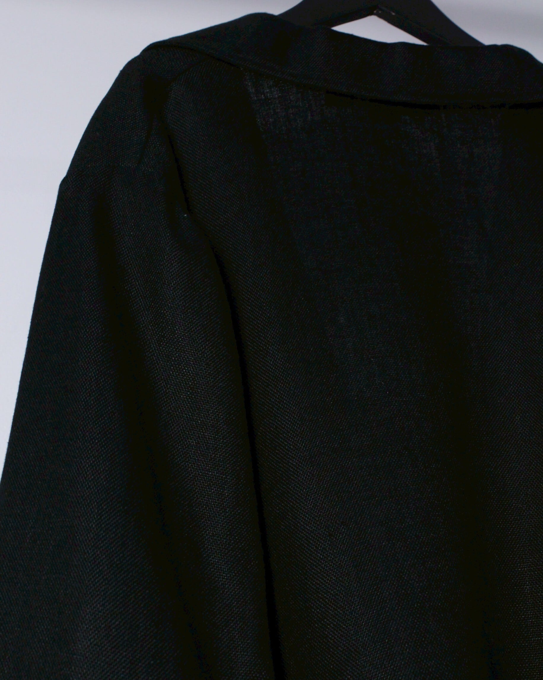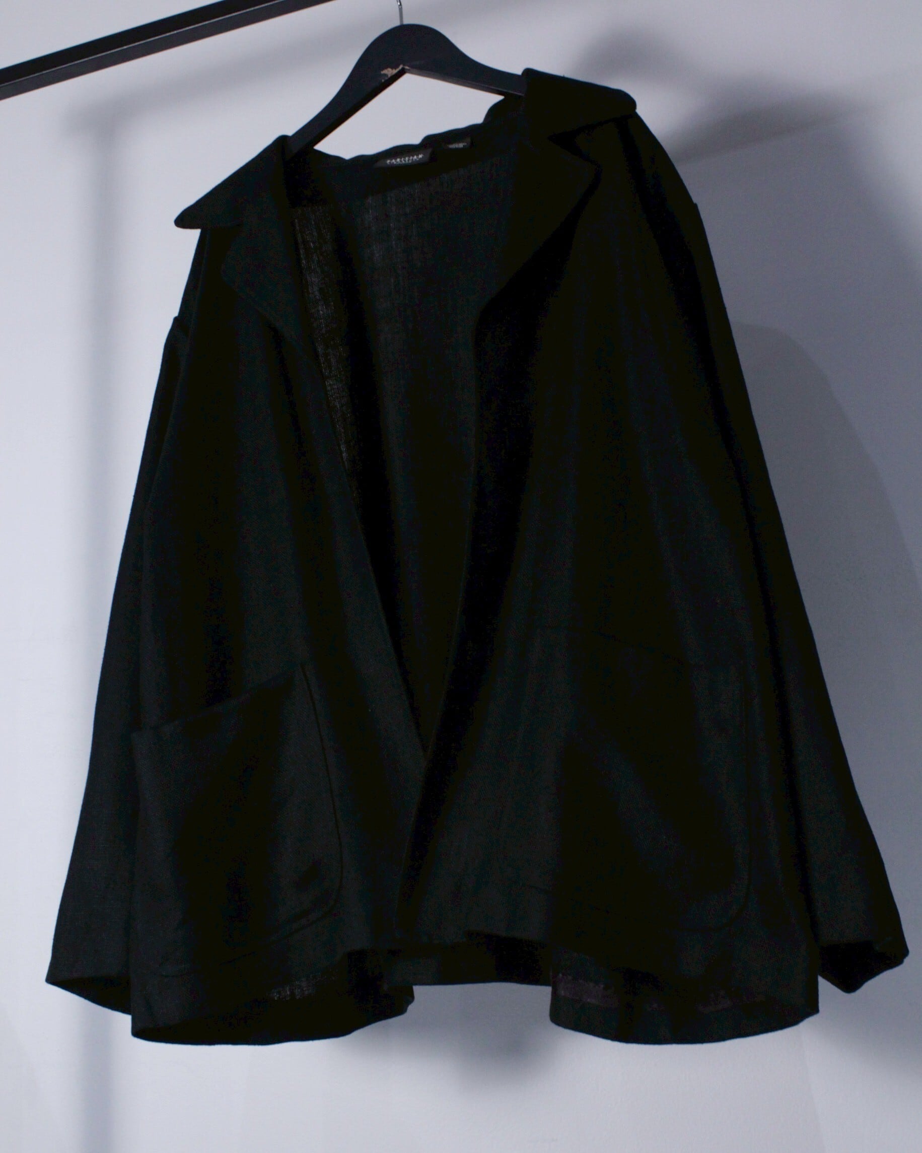 ハリ、コシのある上質なブラックリネンを用いたボタンレス仕様ののカバーオールジャケット。