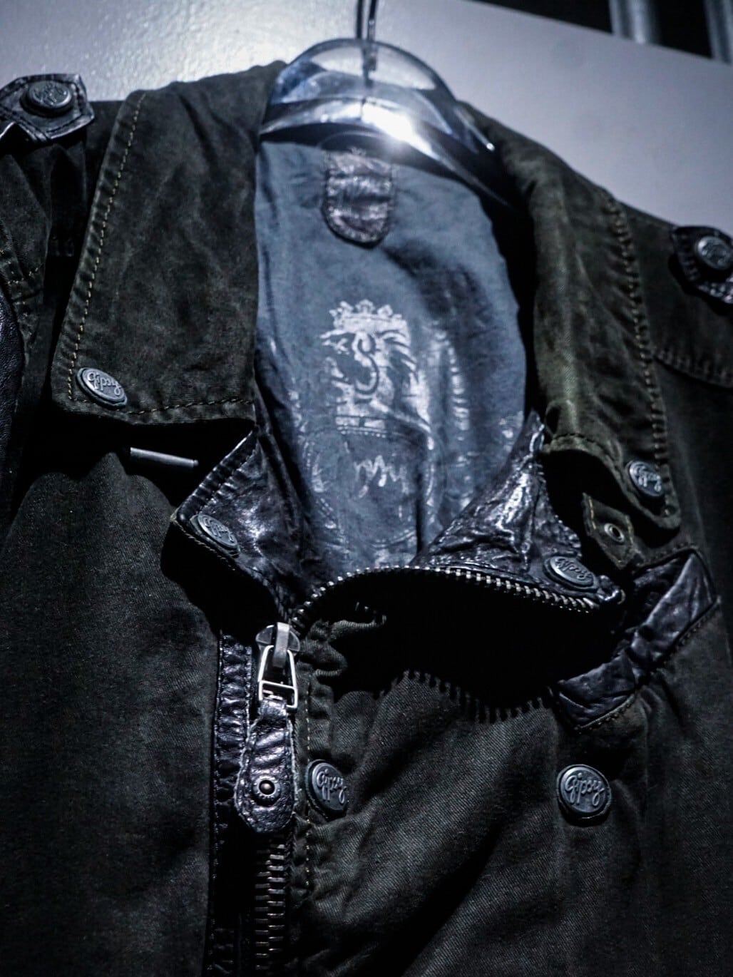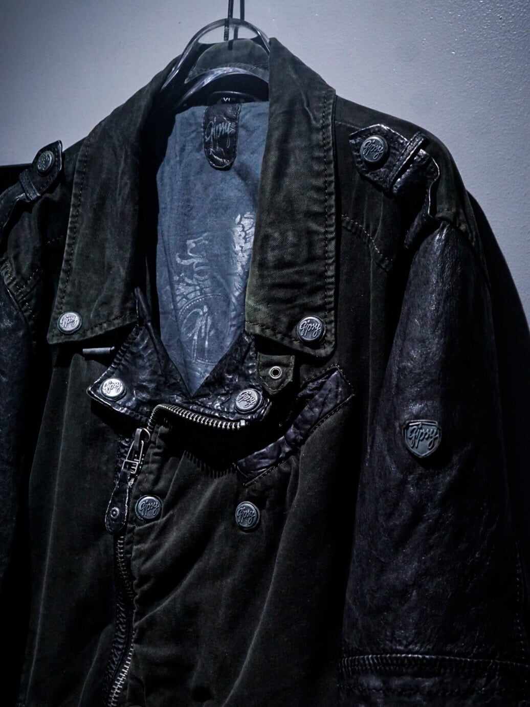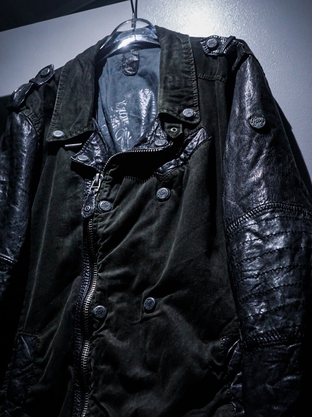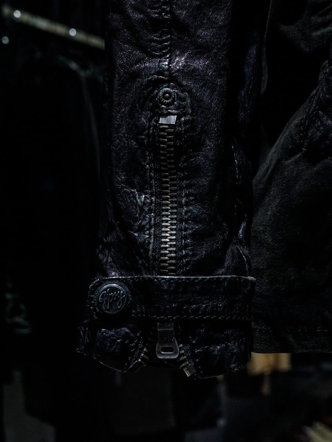 襟に施されたストラップにエポレット、袖口のジップ等々ダブルライダースならではの重厚感のあるギミック使いに、異素材の掛け合わせが生み出すコントラスト。非常にイケてますね、、、