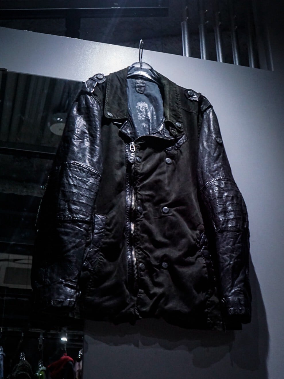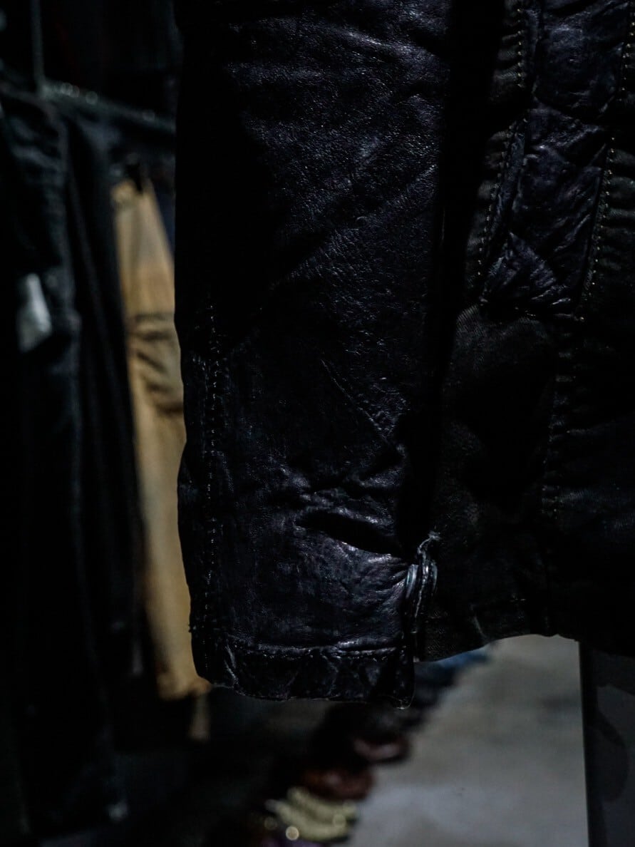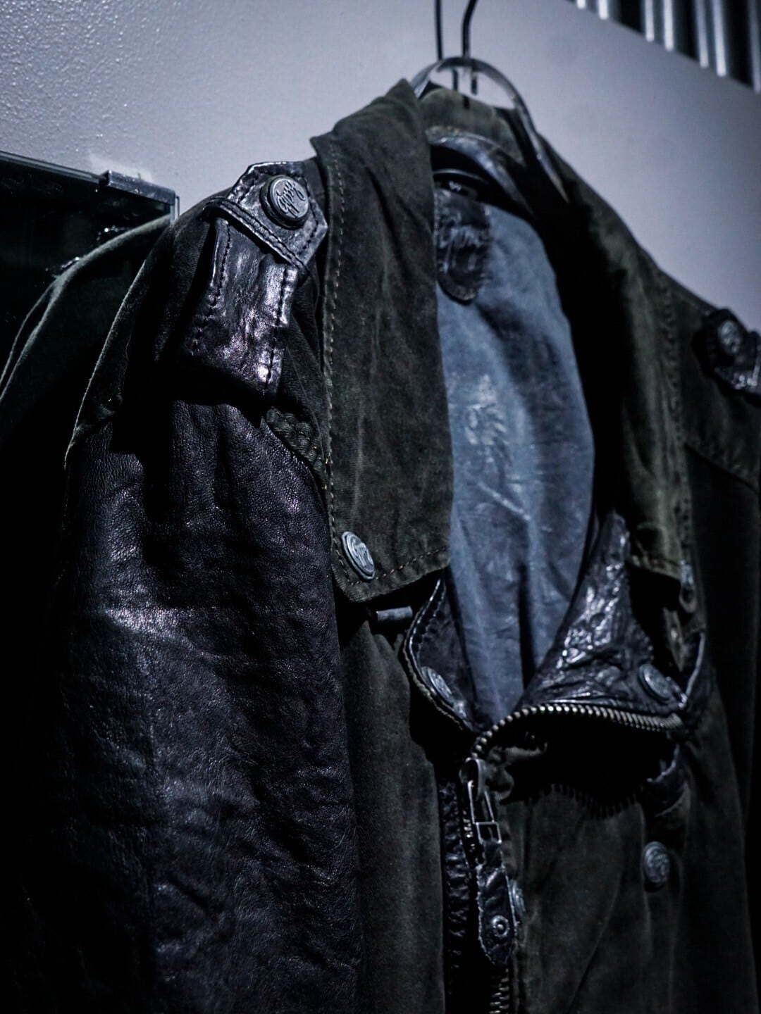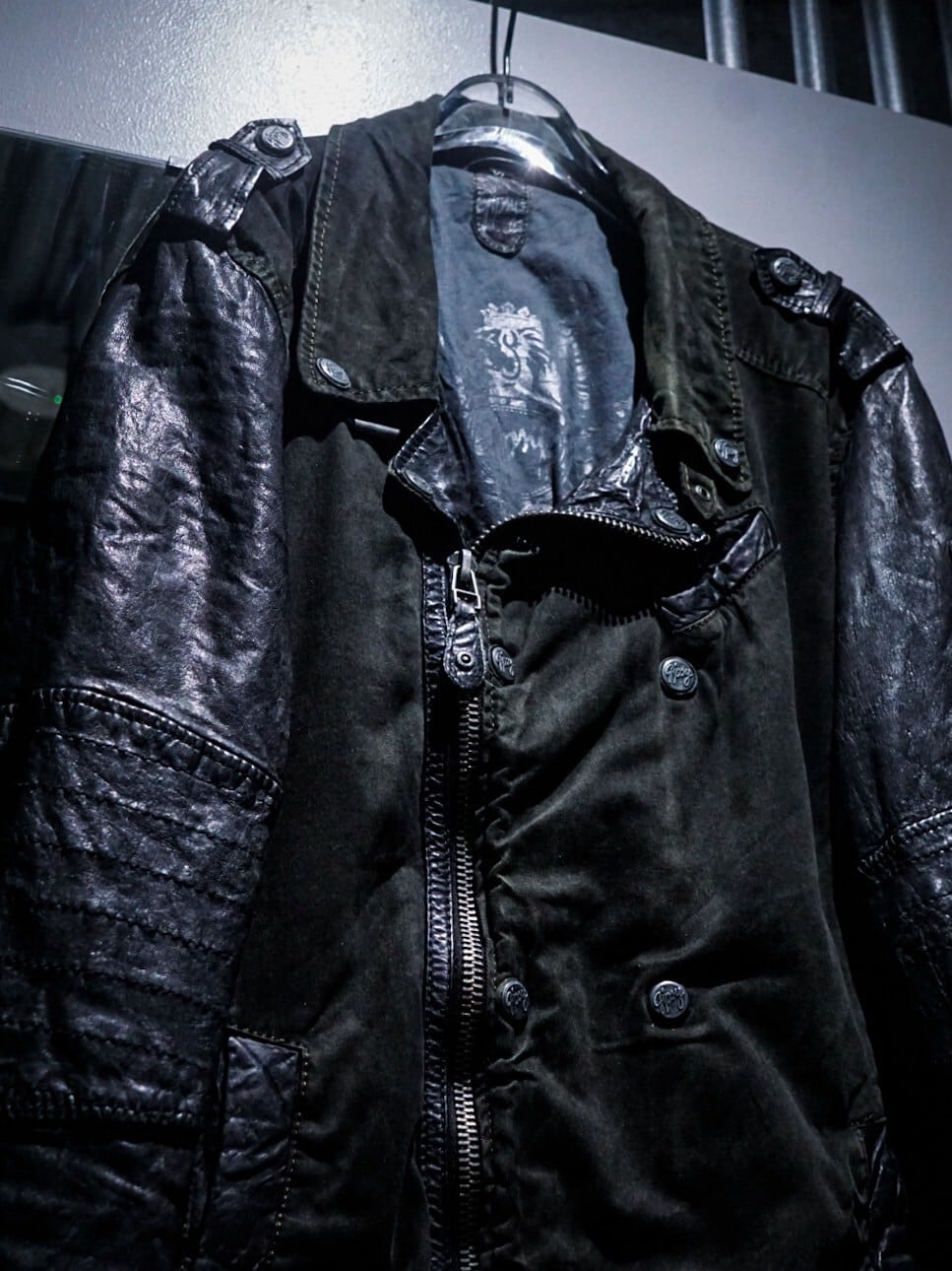 襟に施されたストラップにエポレット、袖口のジップ等々ダブルライダースならではの重厚感のあるギミック使いに、異素材の掛け合わせが生み出すコントラスト。非常にイケてますね、、、