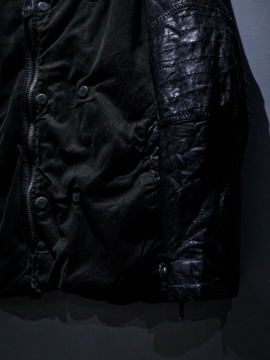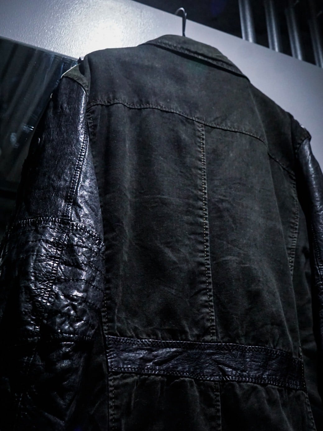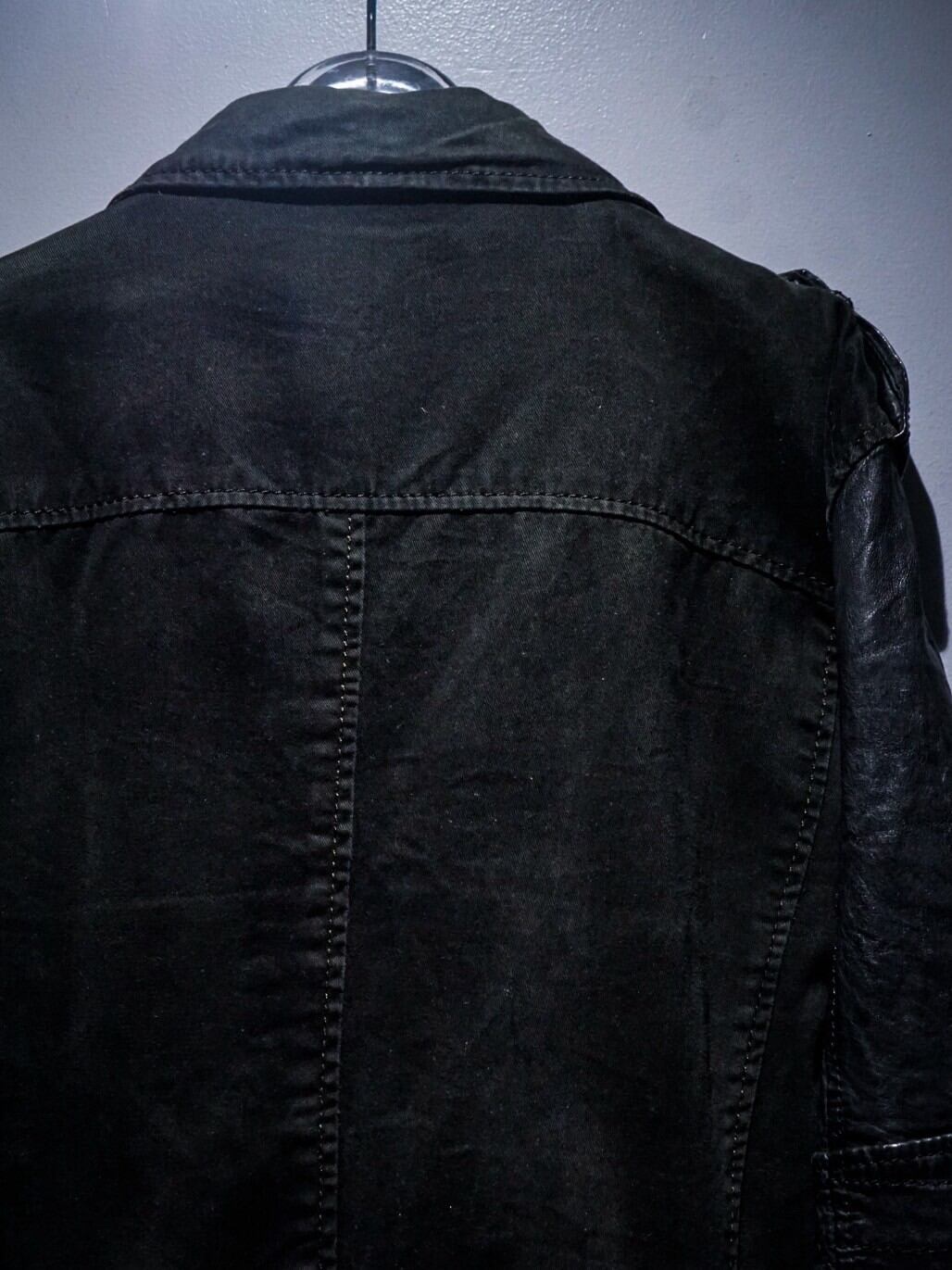 ダブルライダースやピーコートを思わせるディテール使い。ムラのある染めによって仕上げられた、柔らかなコットンボディをベースに、アームやポケット等、随所を上質なブラックレザーで切り替えた、モードな雰囲気を漂わせるジャケット。