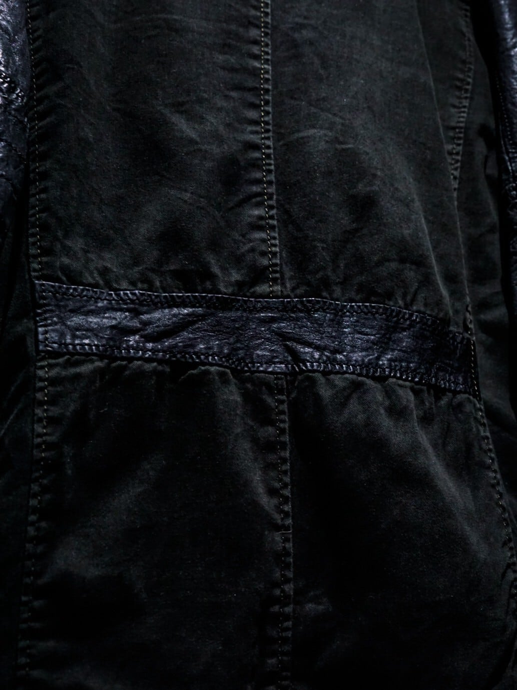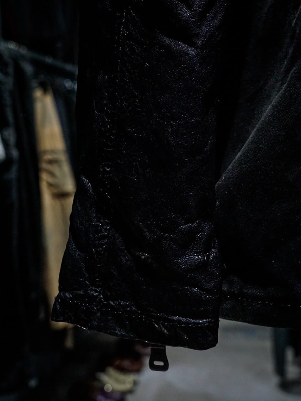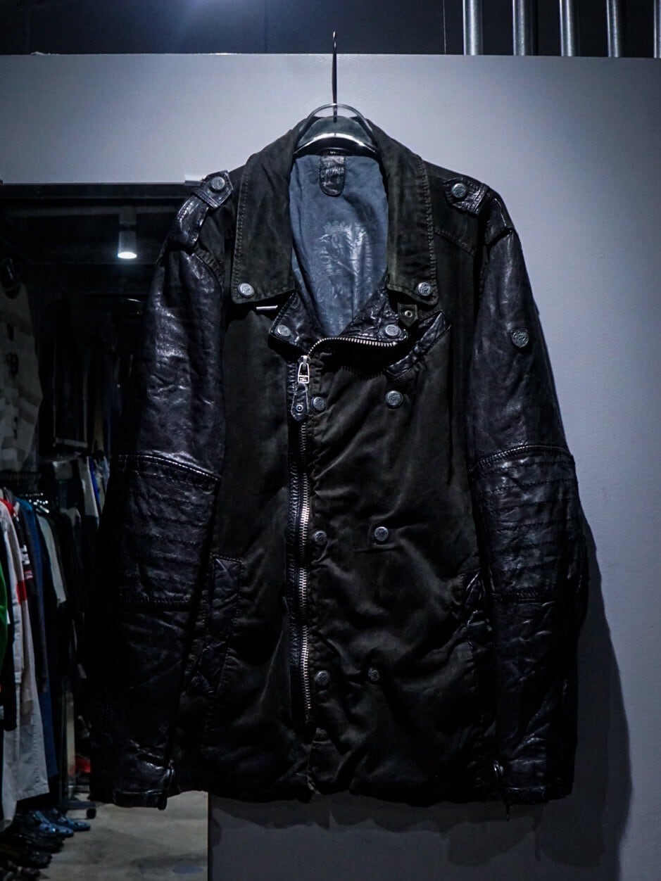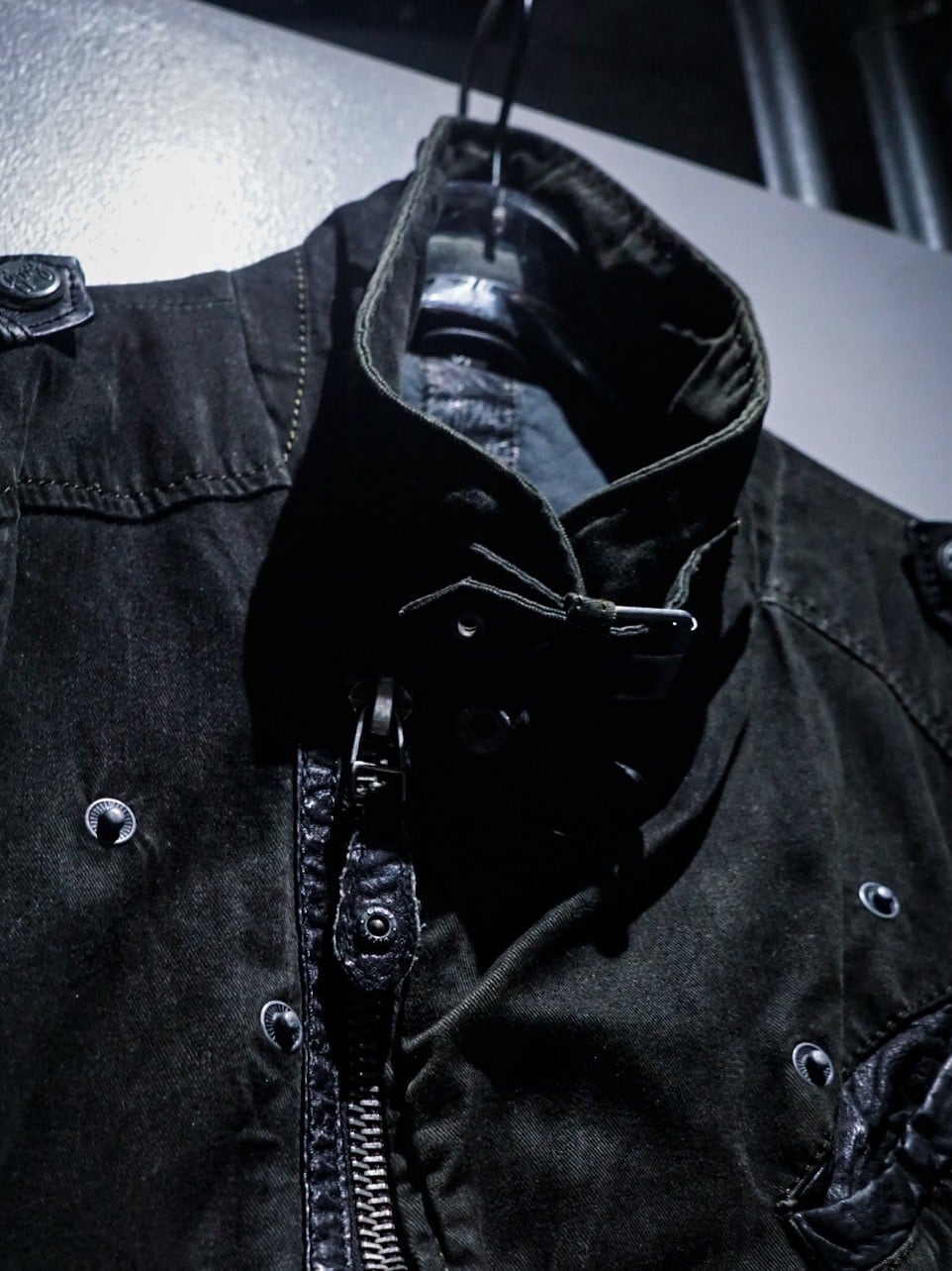 ダブルライダースやピーコートを思わせるディテール使い。ムラのある染めによって仕上げられた、柔らかなコットンボディをベースに、アームやポケット等、随所を上質なブラックレザーで切り替えた、モードな雰囲気を漂わせるジャケット。