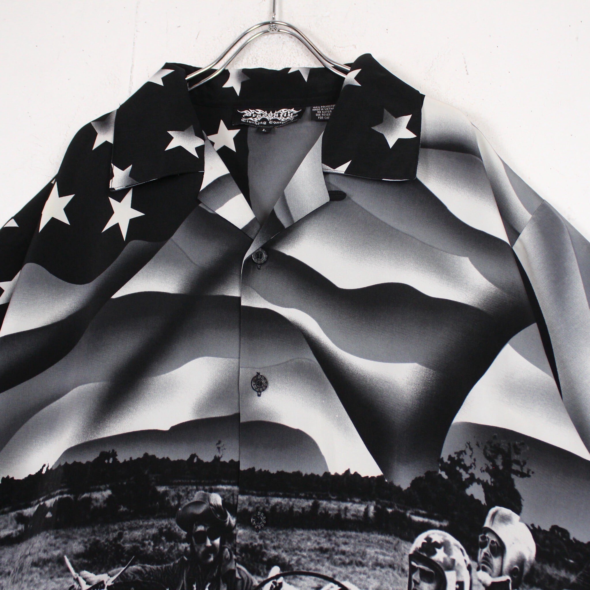 サラリと滑らかなボディに、チョッパーズバイクに乗るバイカー達の姿を落とし込んだ半袖オープンカラーシャツ。