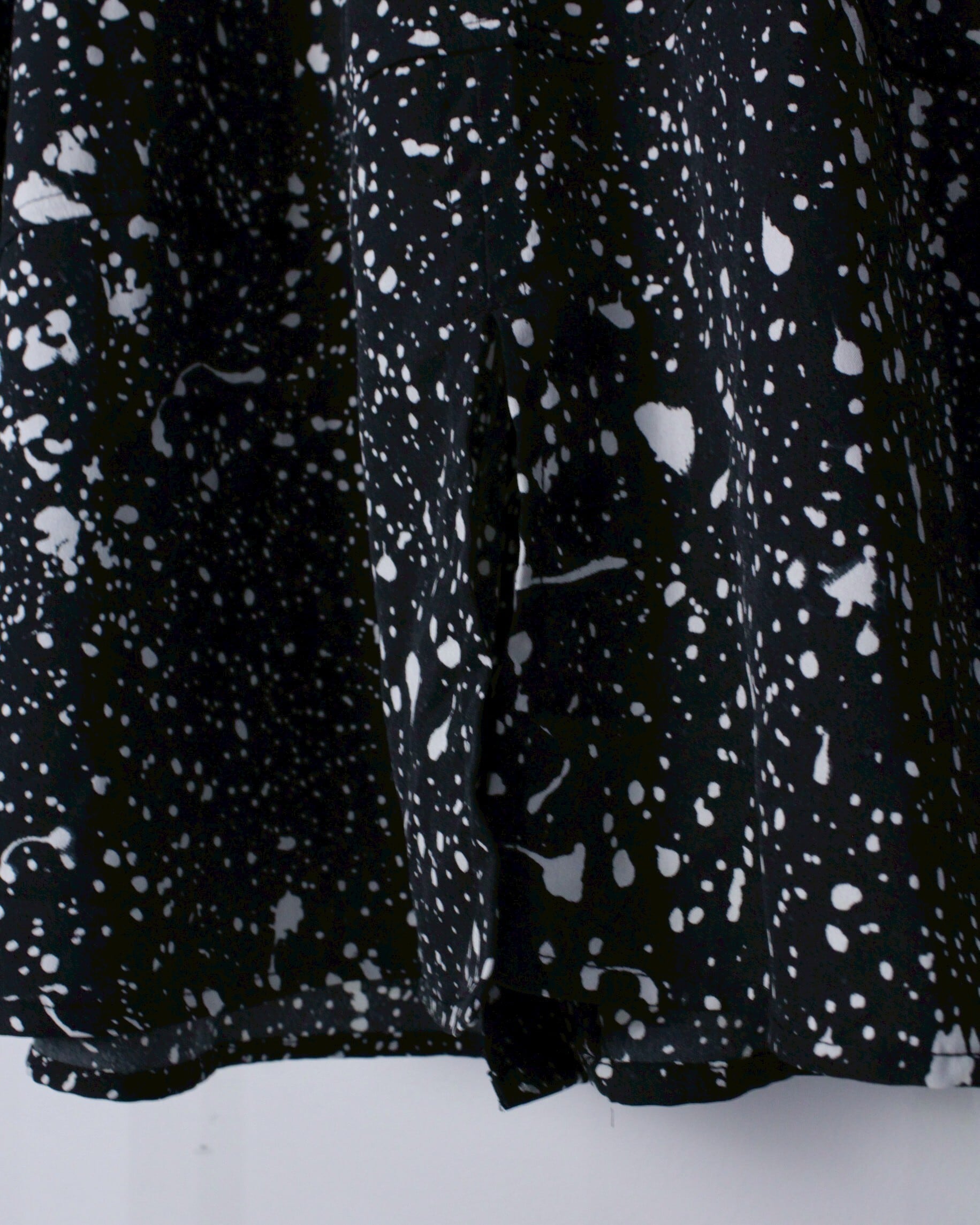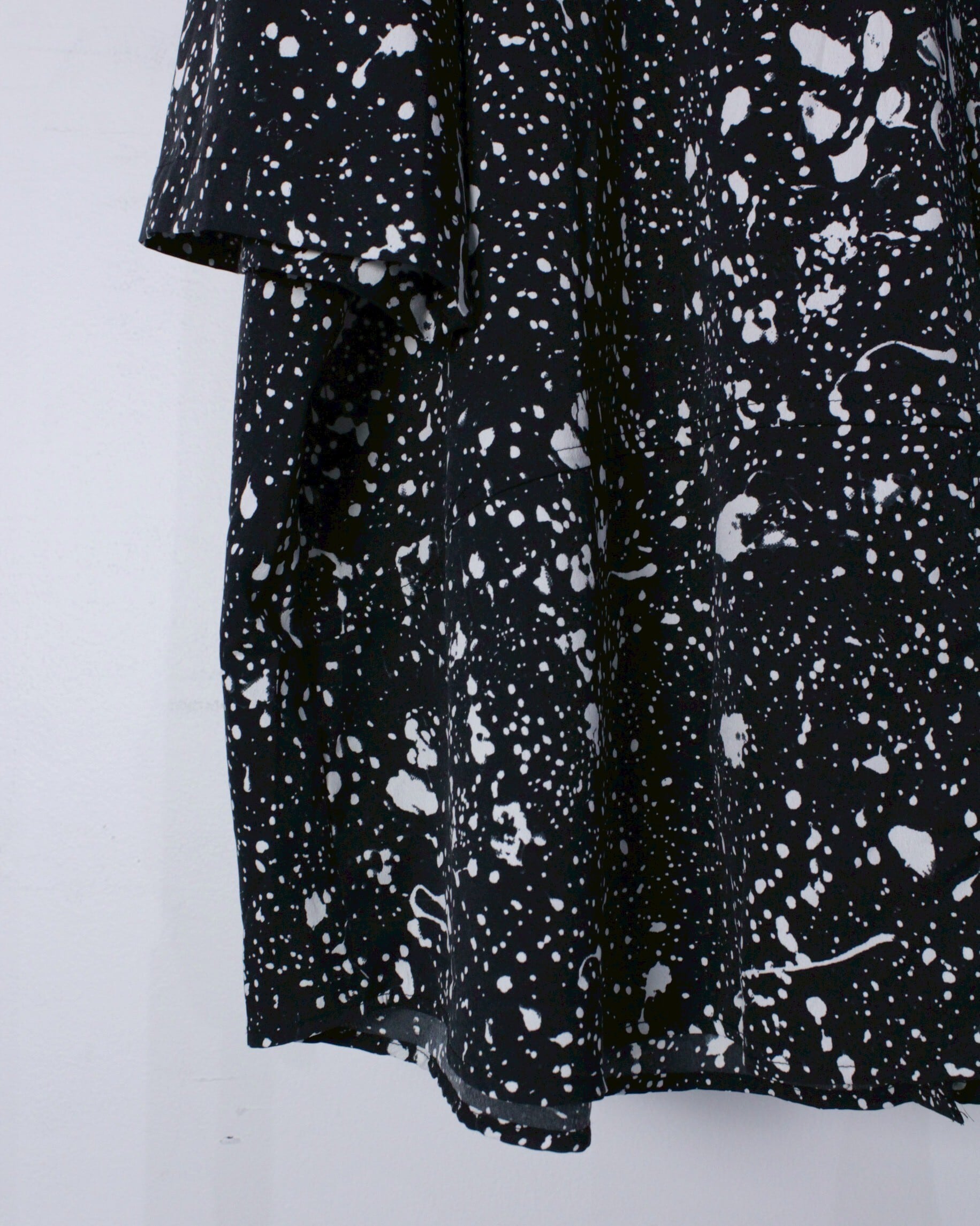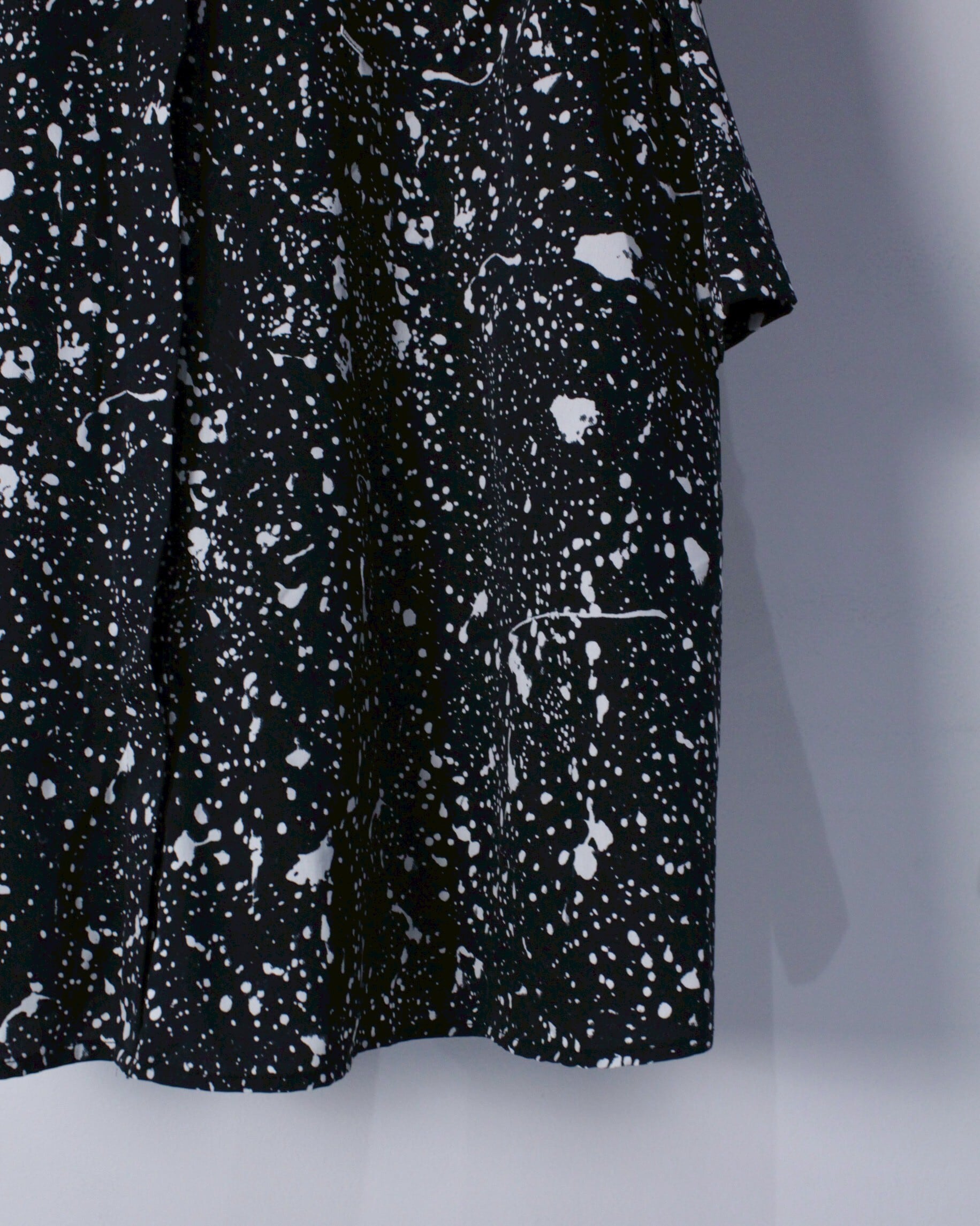 ツルッと滑らかなポリ素材のボディに、白をペイント風にまだらに散らした半袖シャツ。