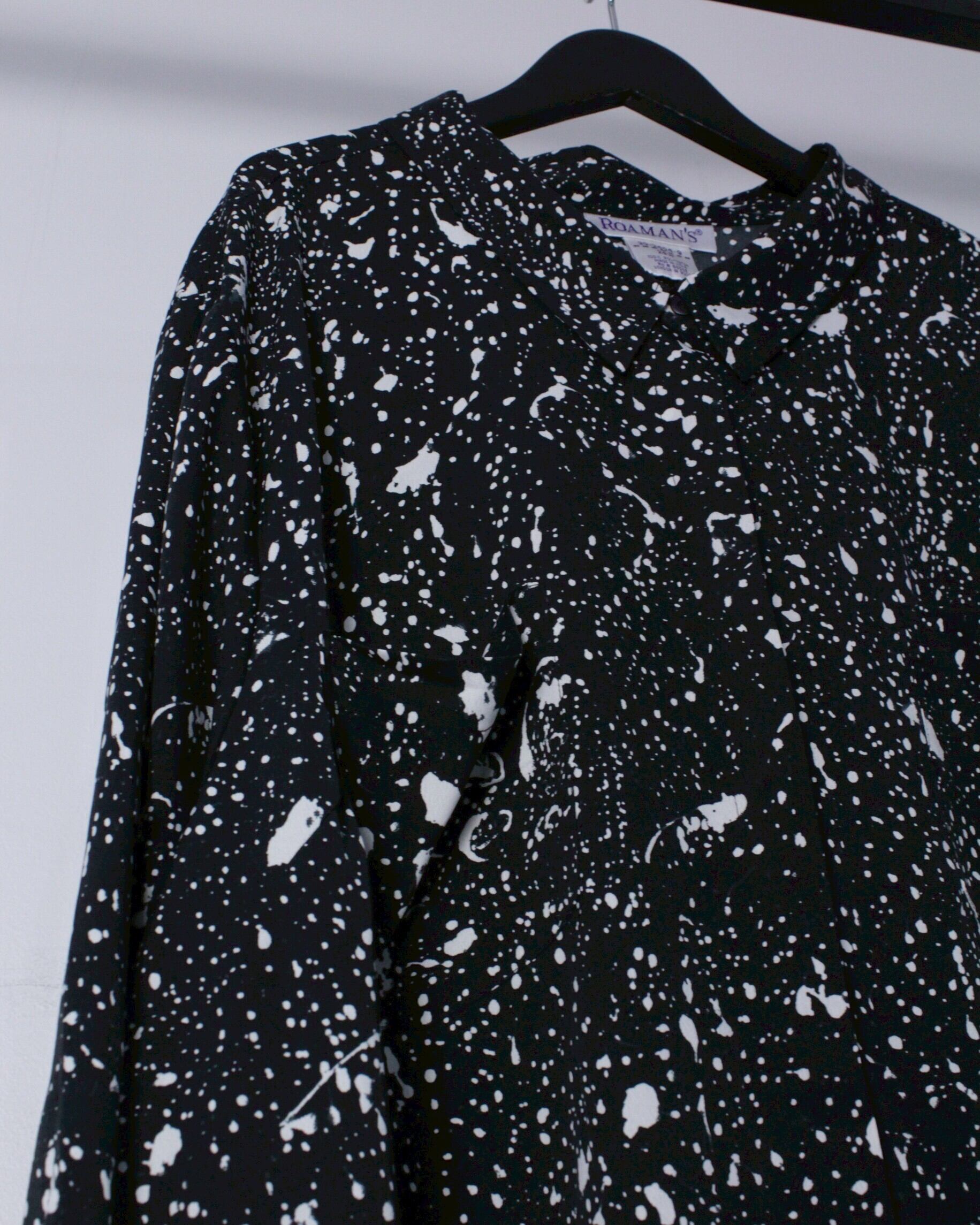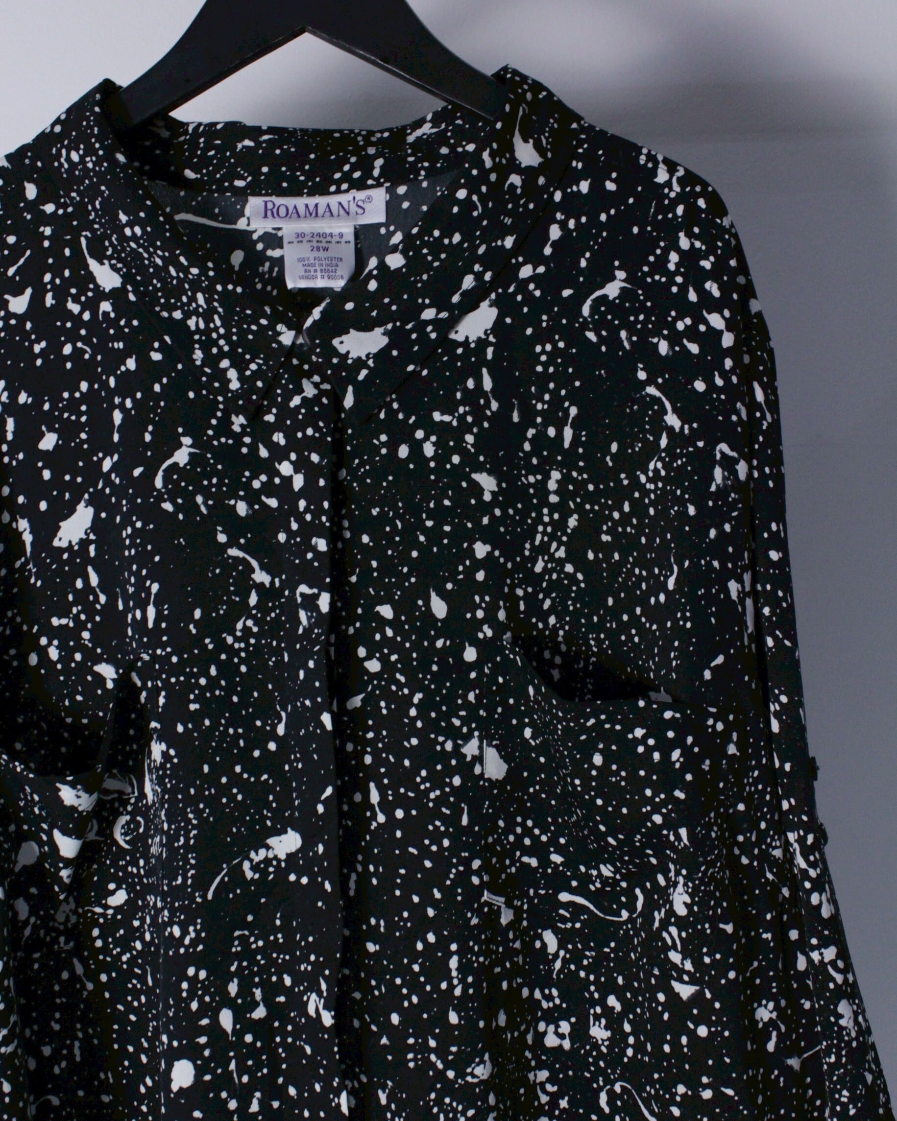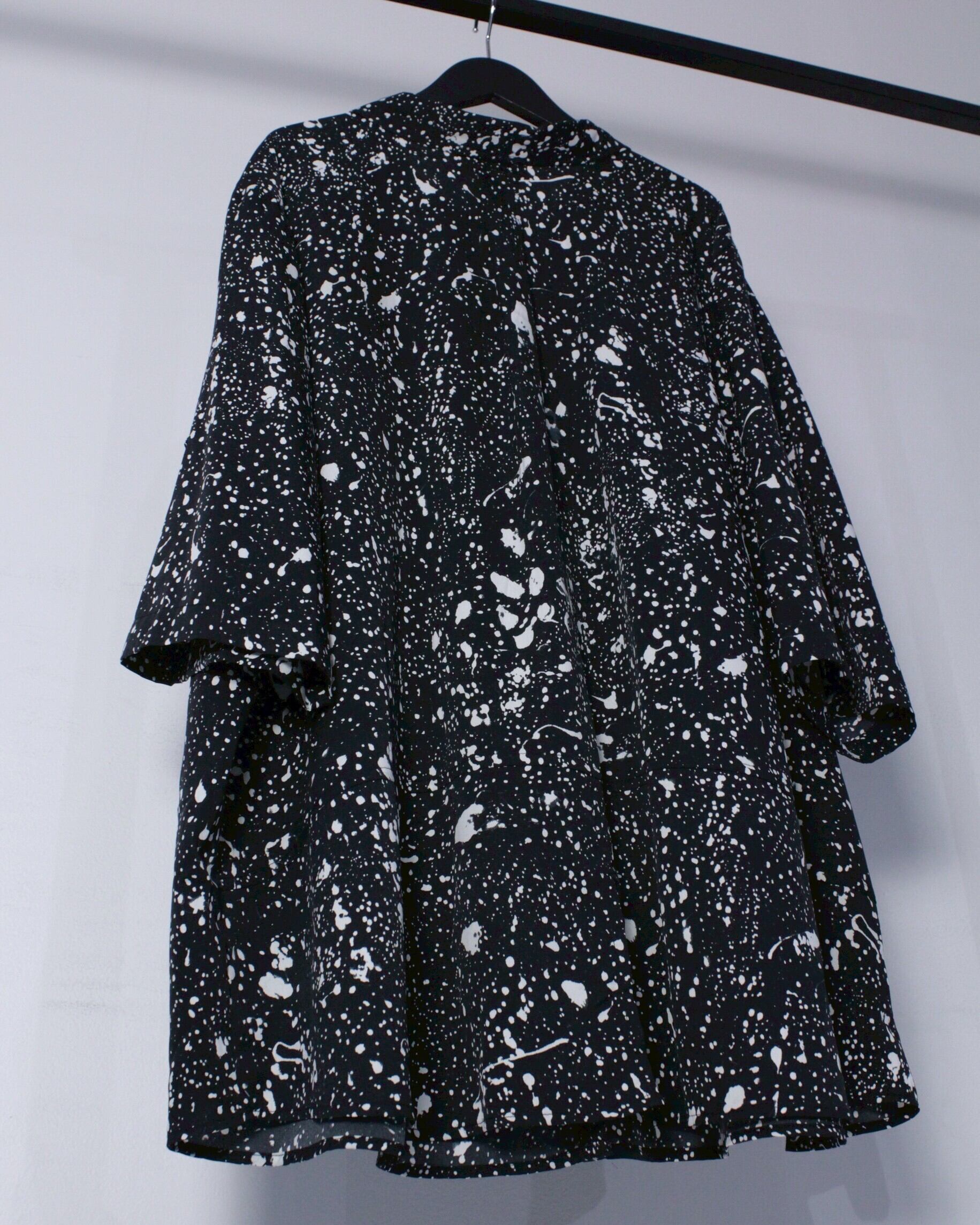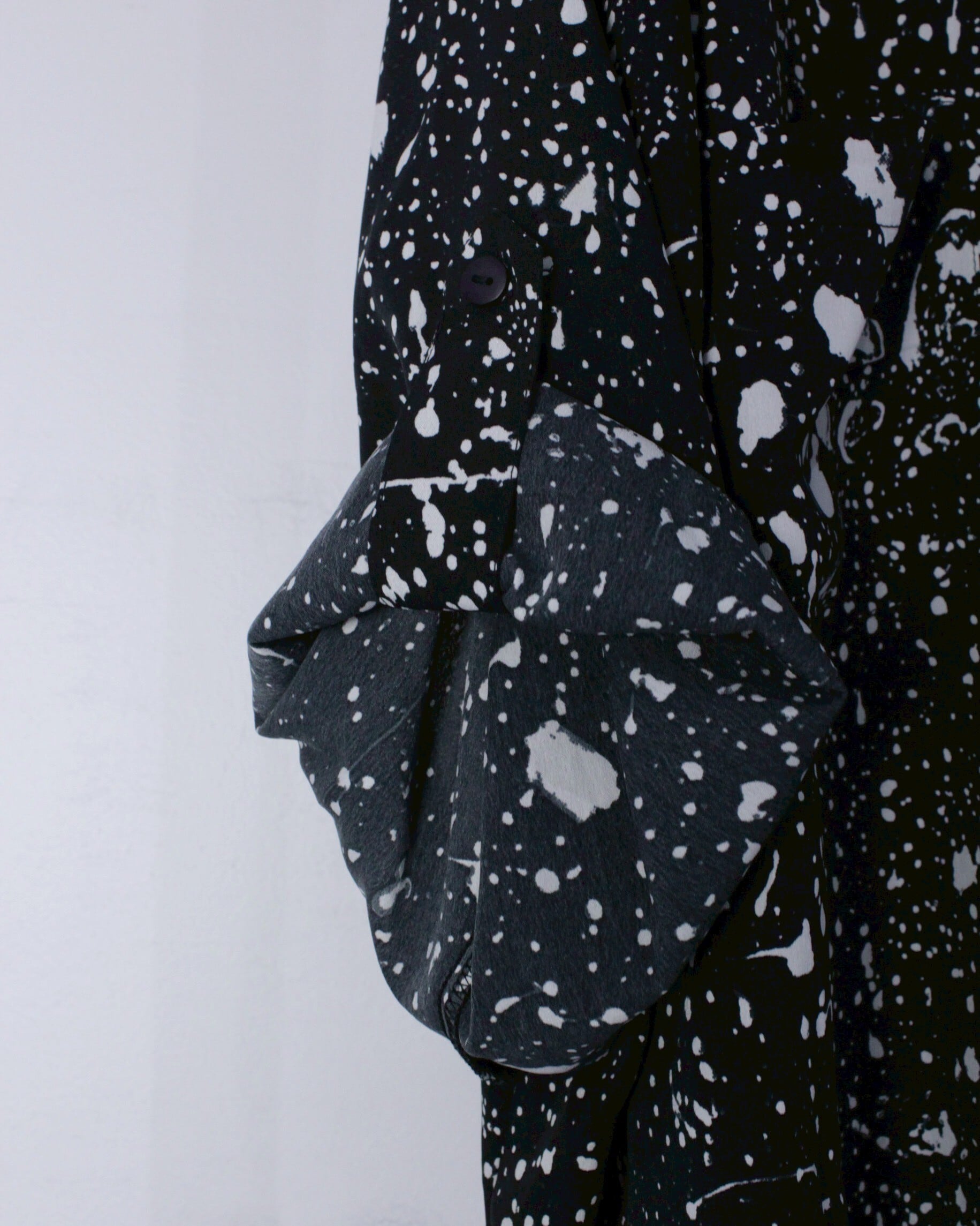 ツルッと滑らかなポリ素材のボディに、白をペイント風にまだらに散らした半袖シャツ。