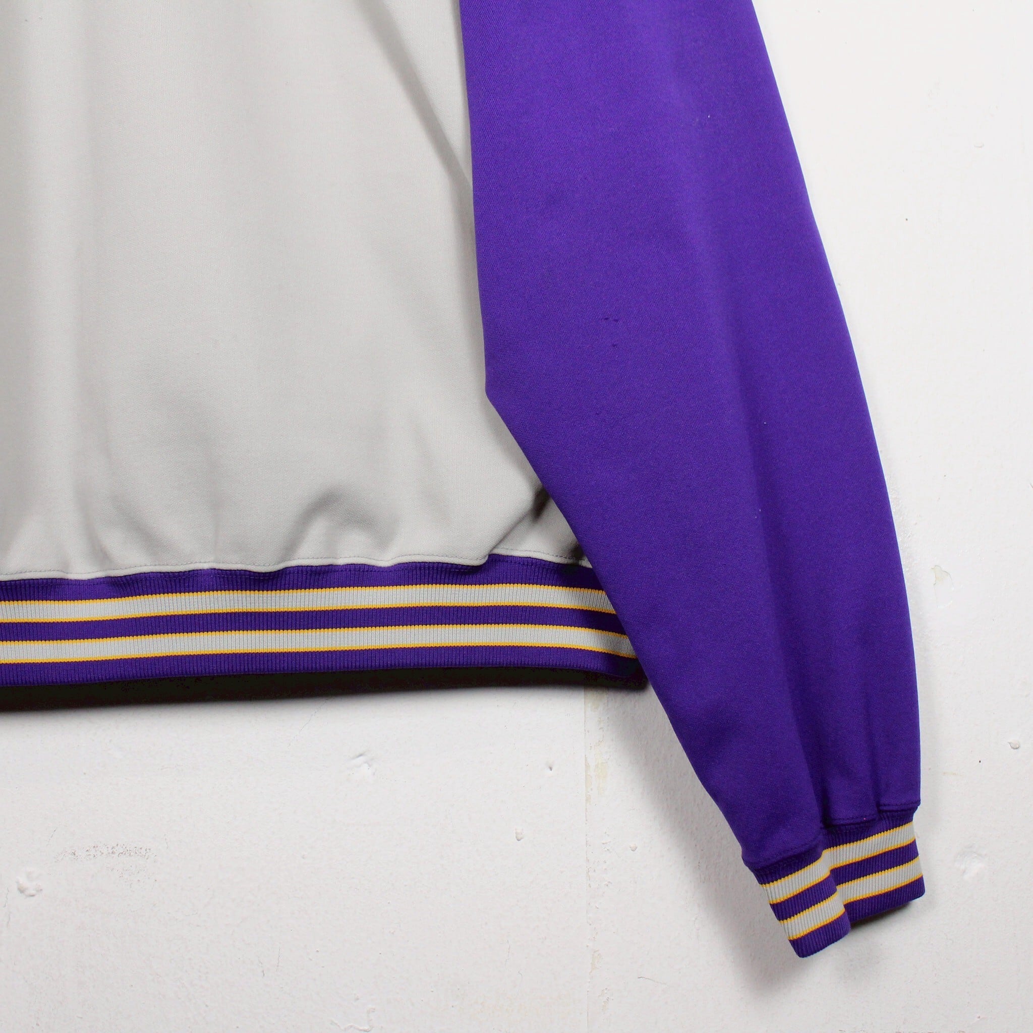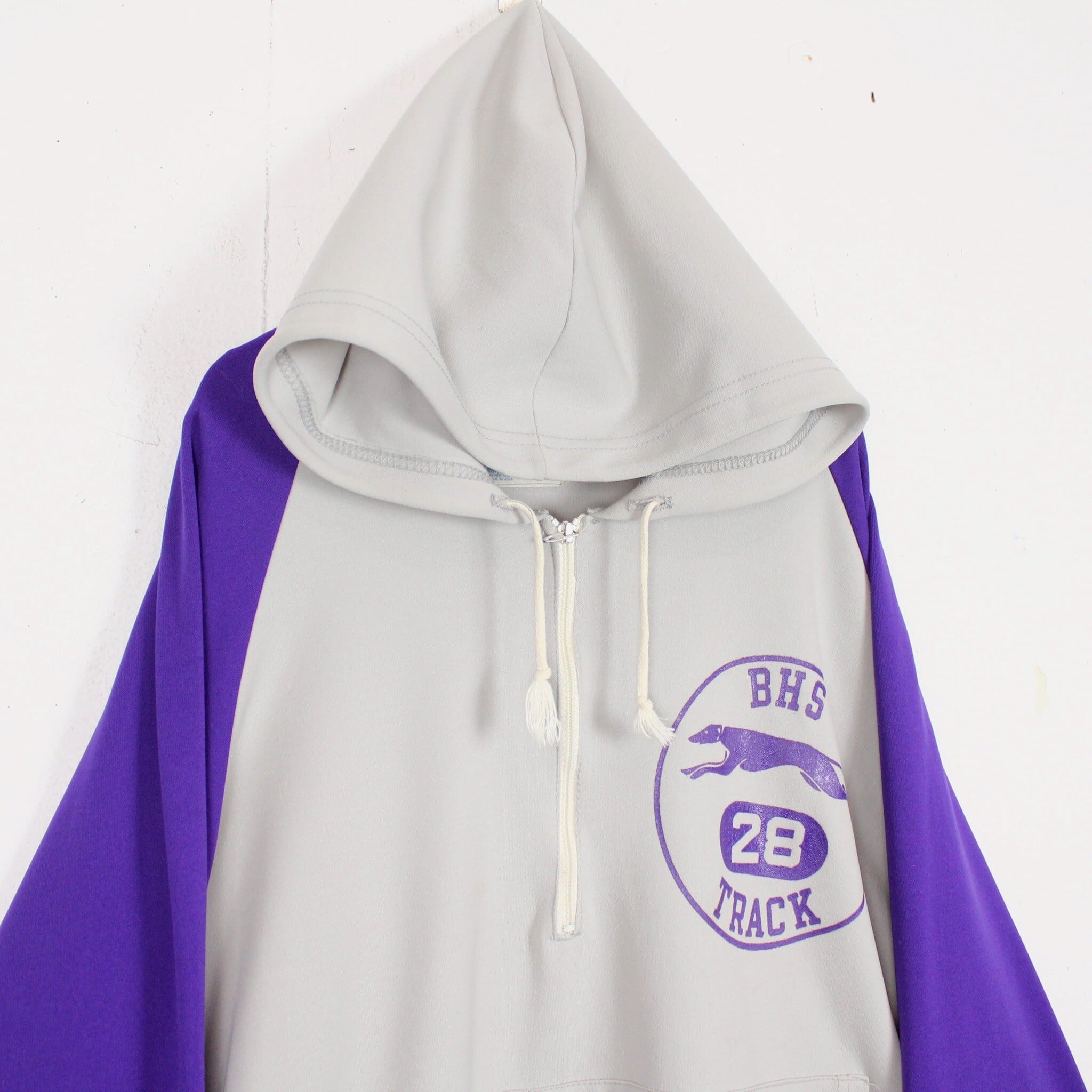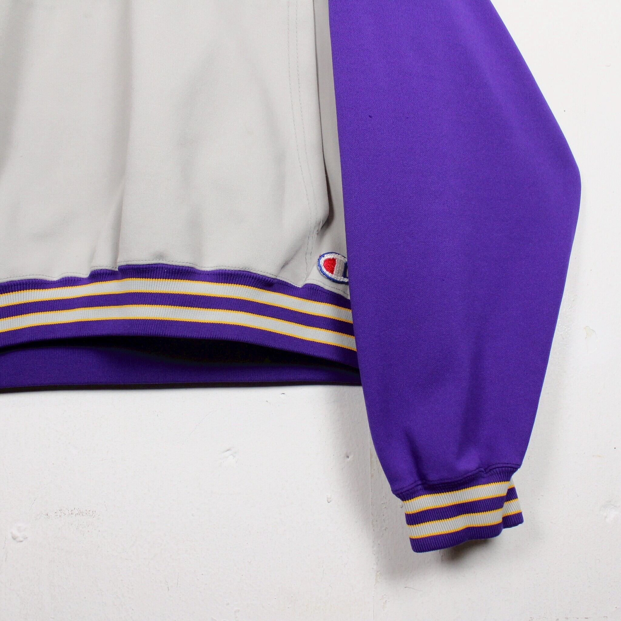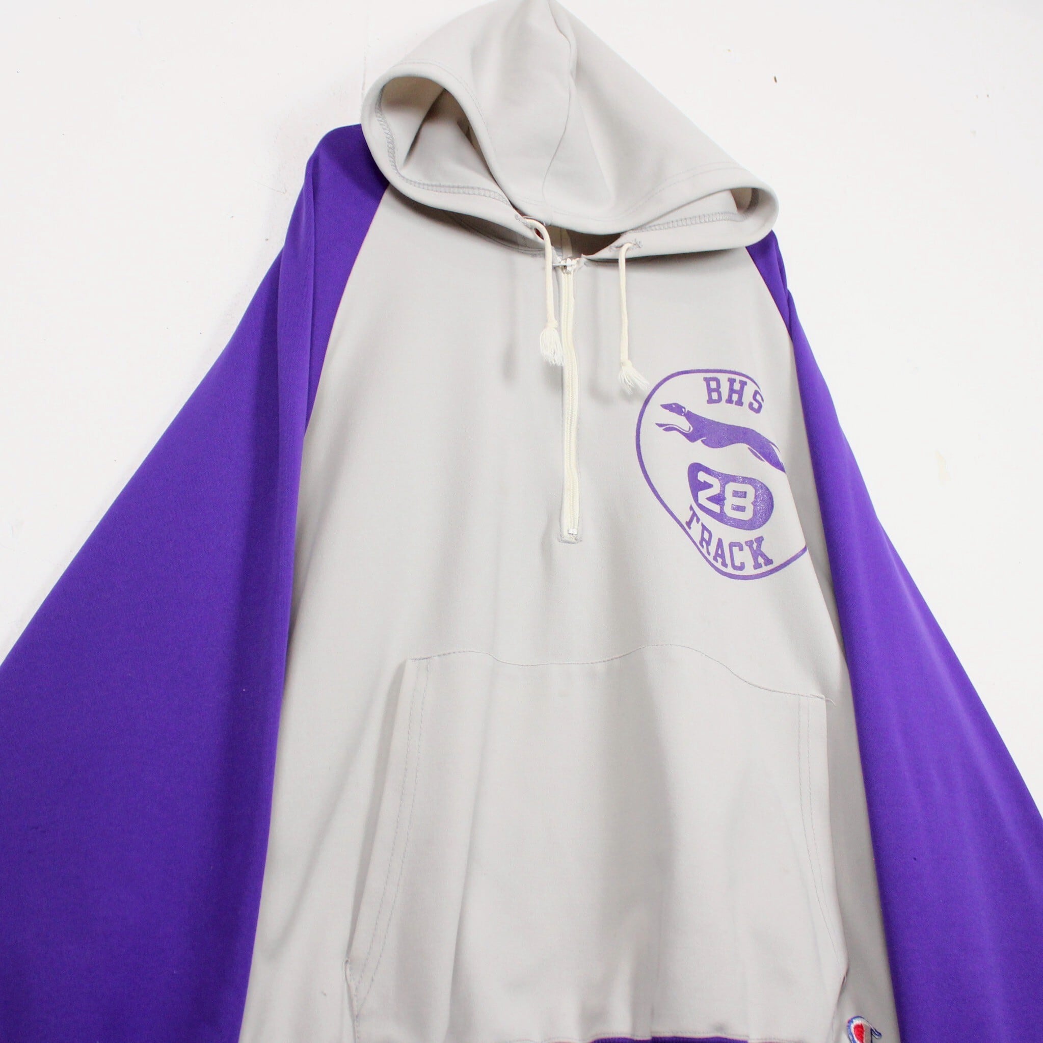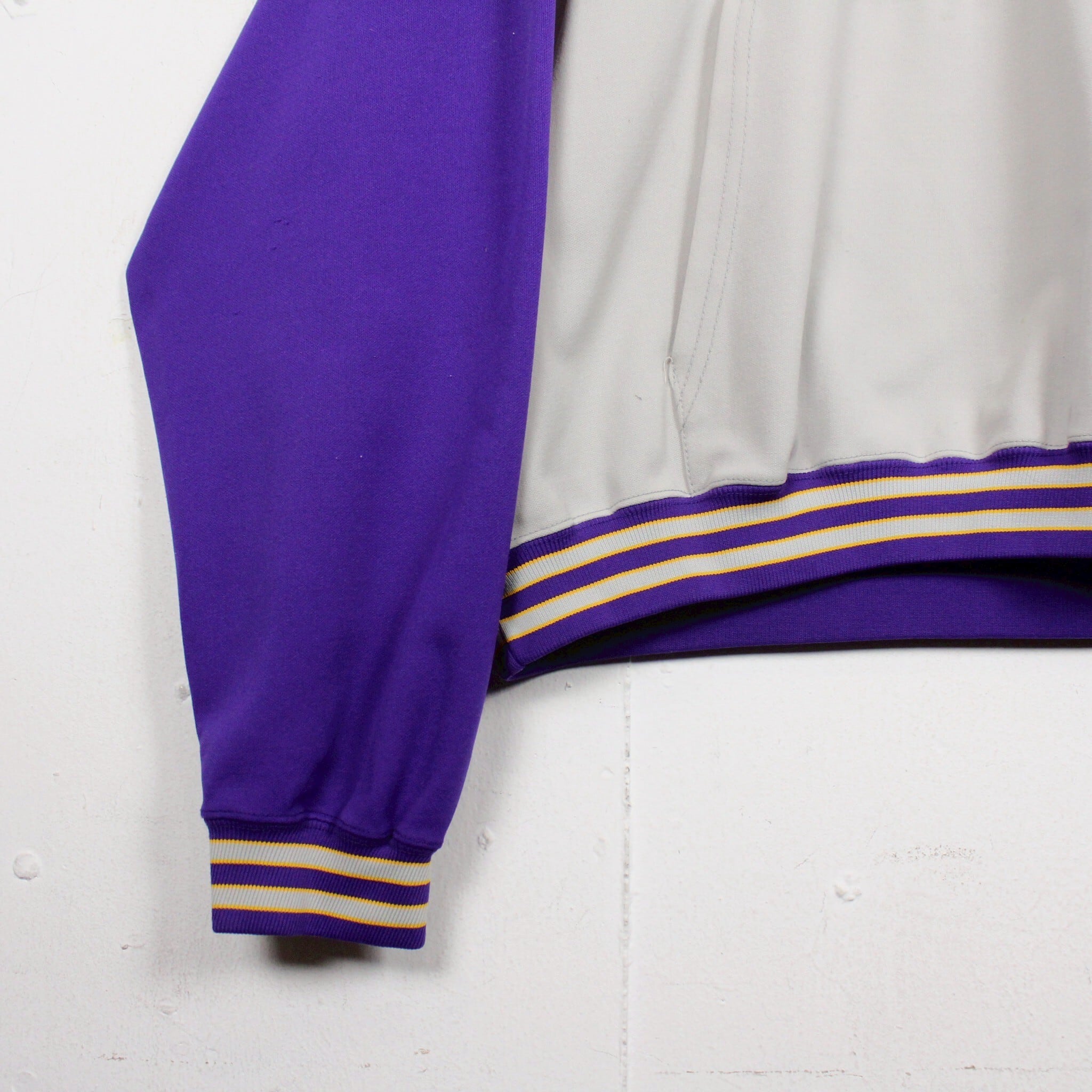ホワイトに紫を切り替えたボディに、左胸にチームロゴ、背面にアーチロゴを載せたジャージ生地の60'sプルオーバーフーディ。