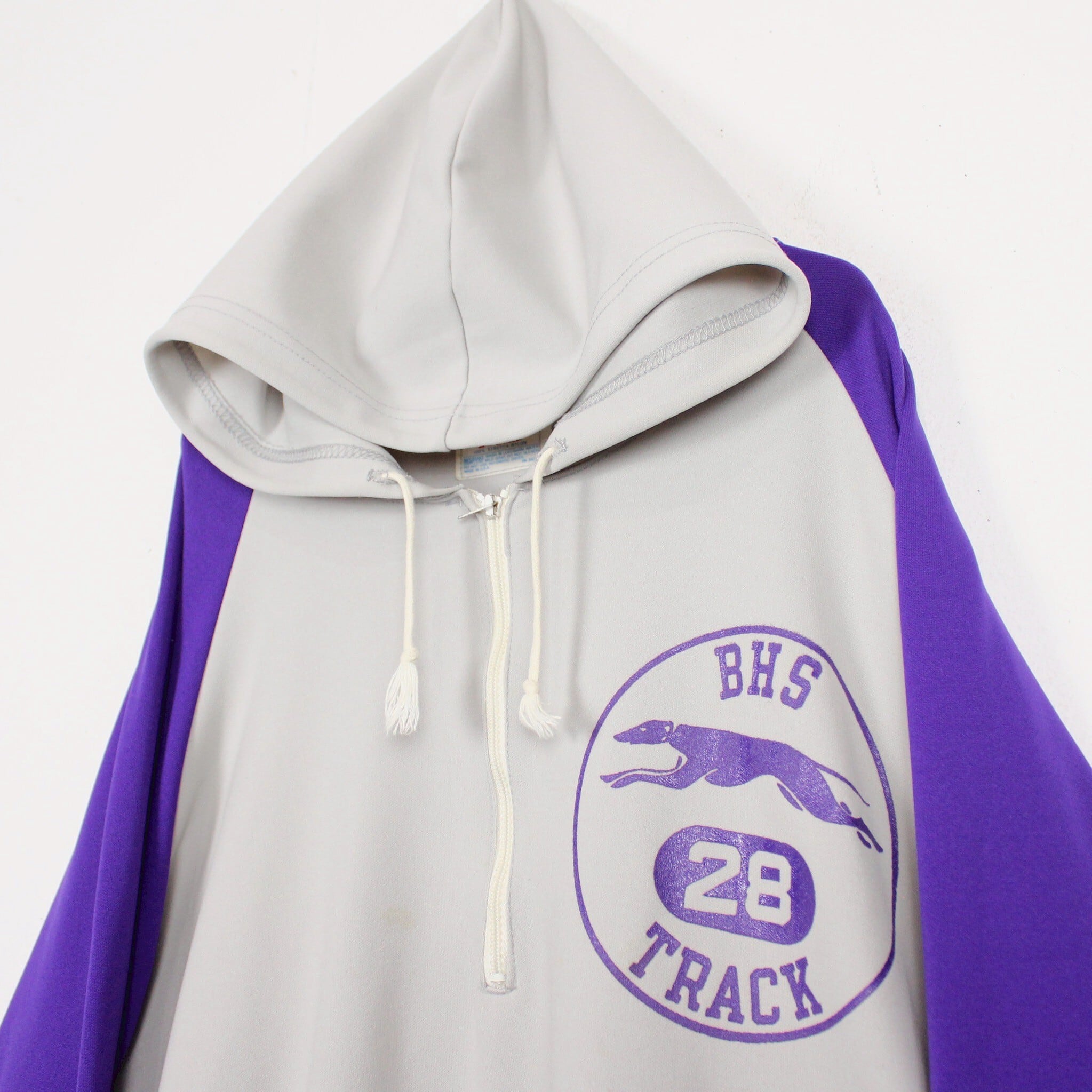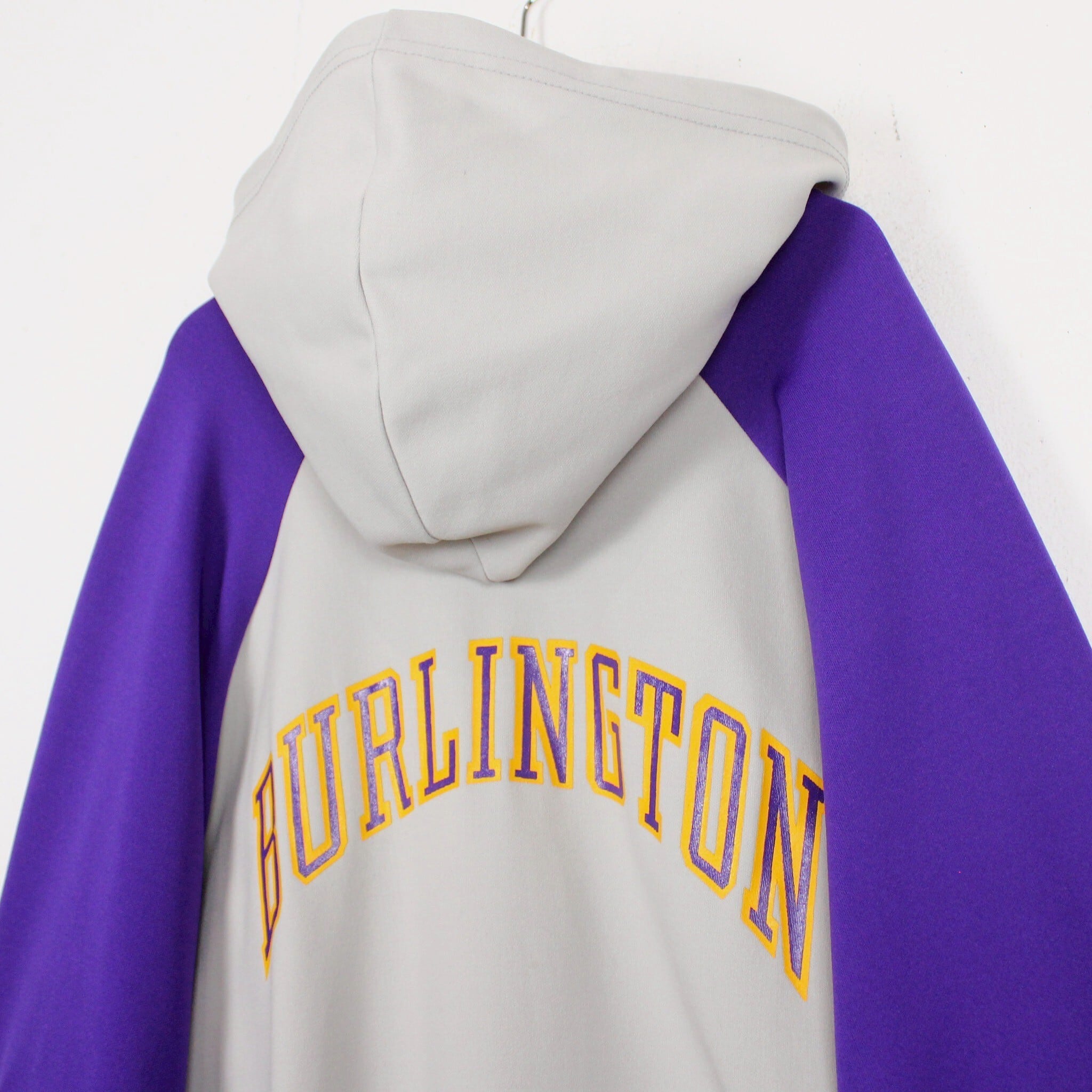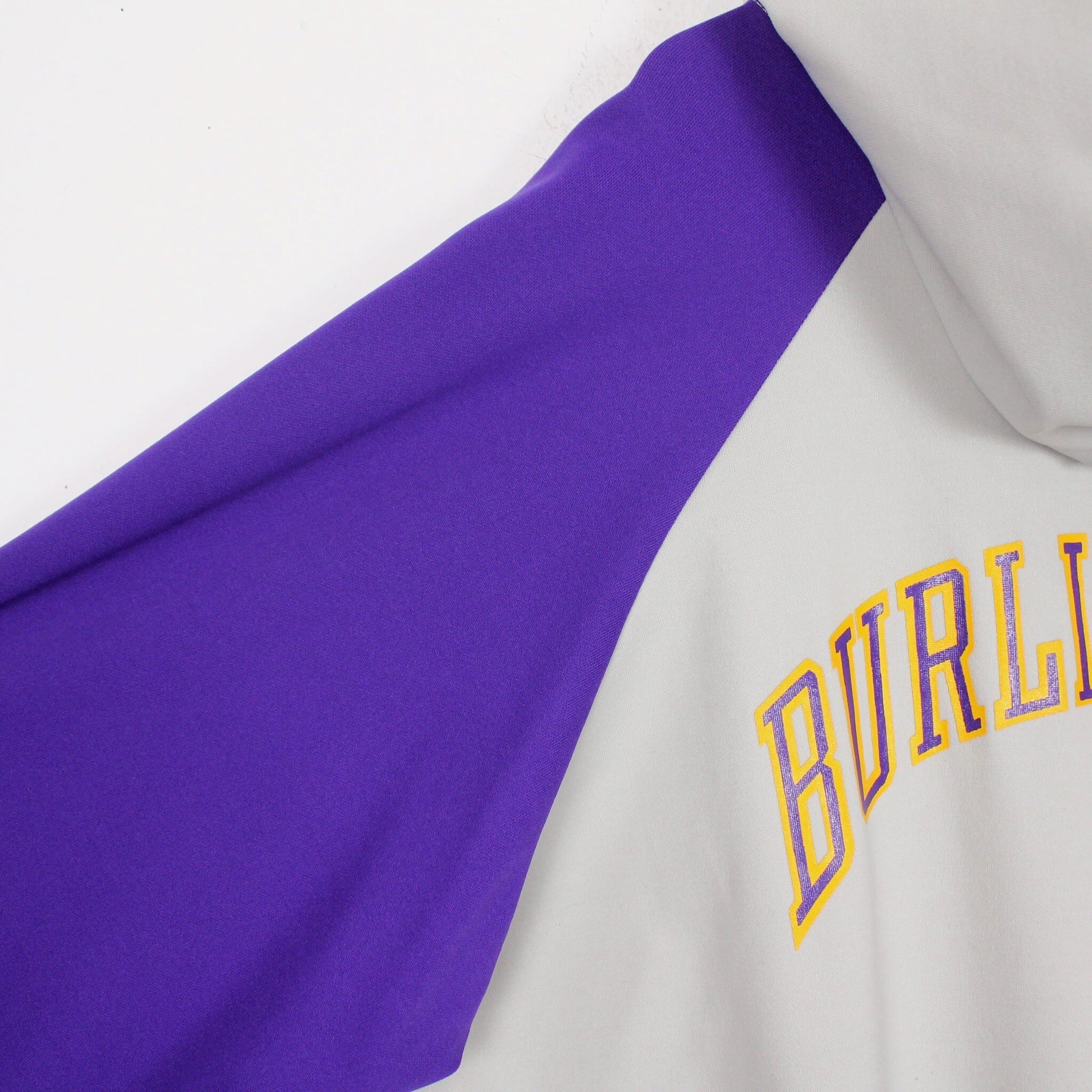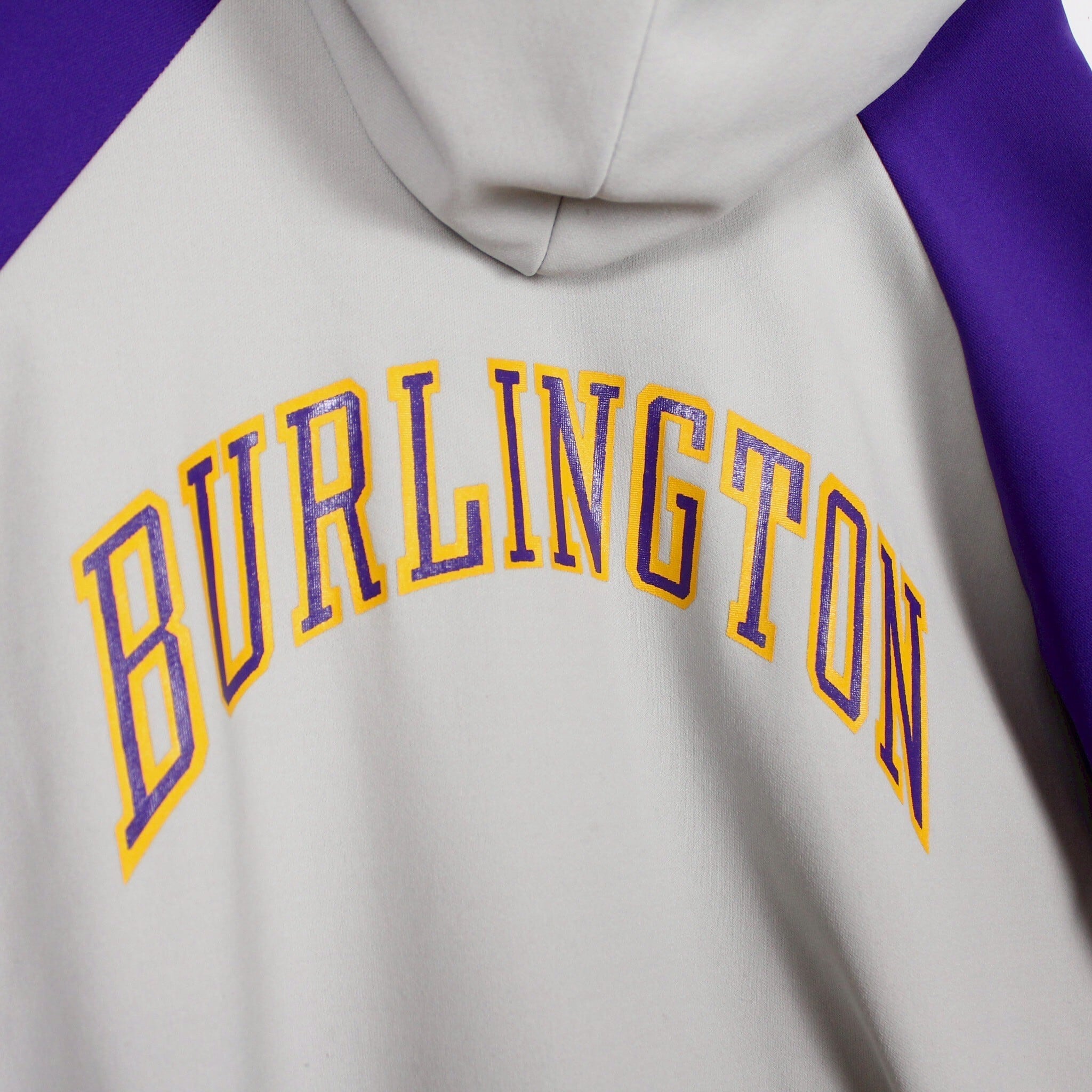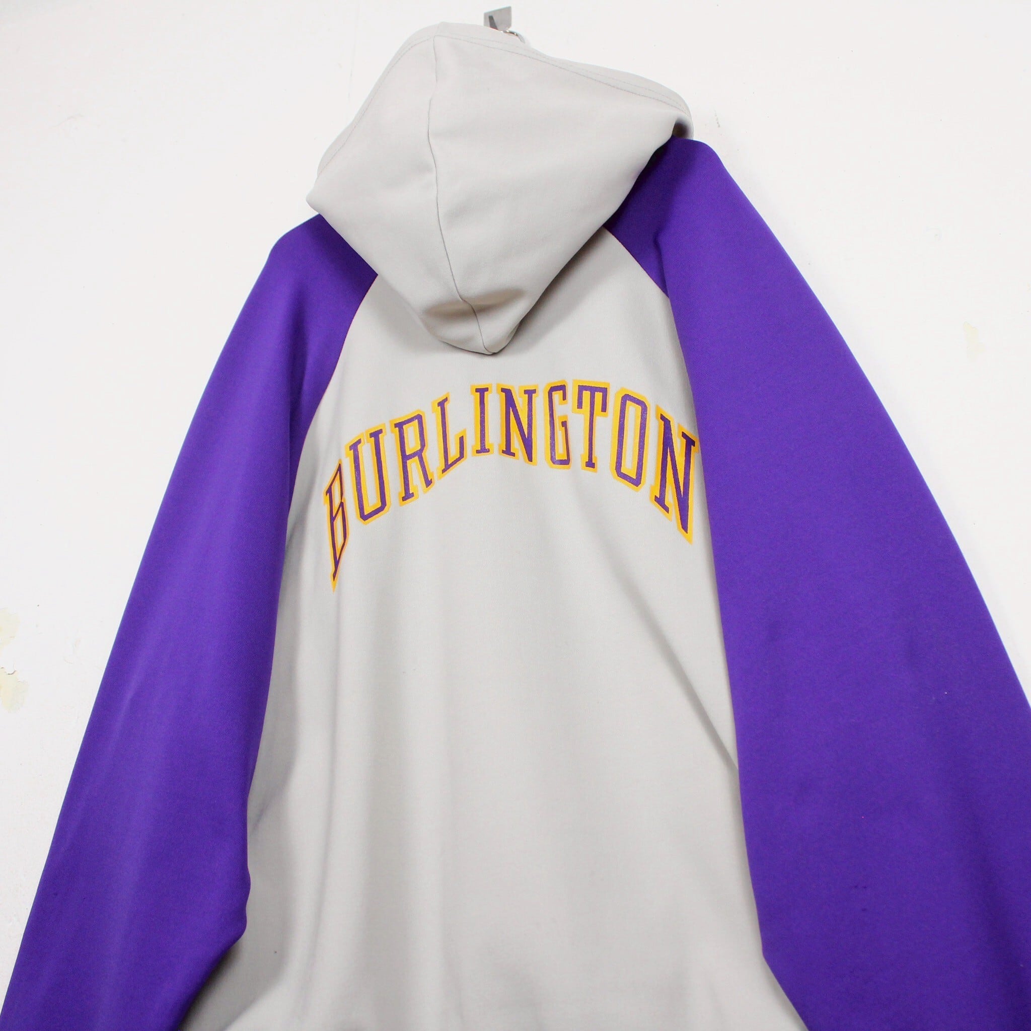 ホワイトに紫を切り替えたボディに、左胸にチームロゴ、背面にアーチロゴを載せたジャージ生地の60'sプルオーバーフーディ。