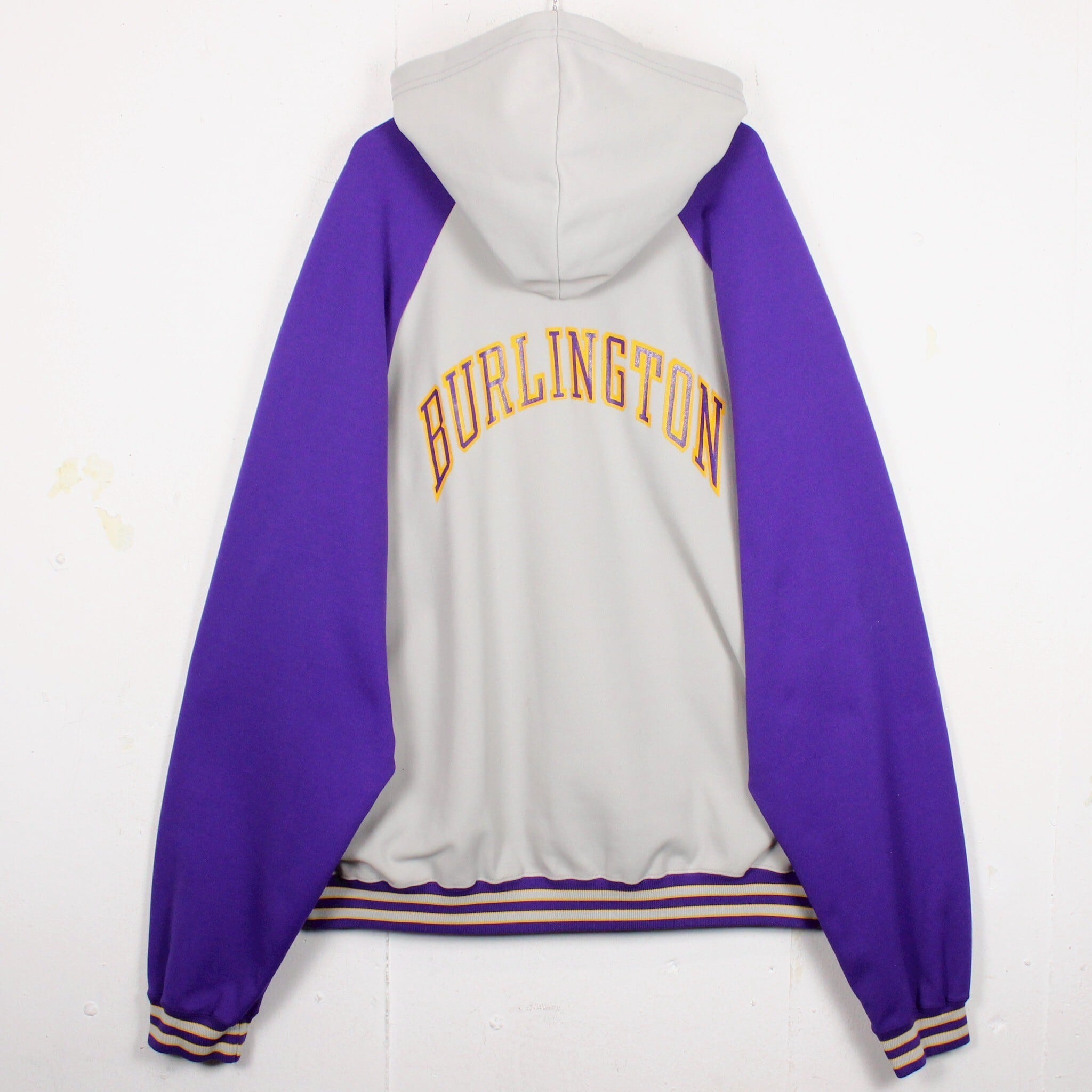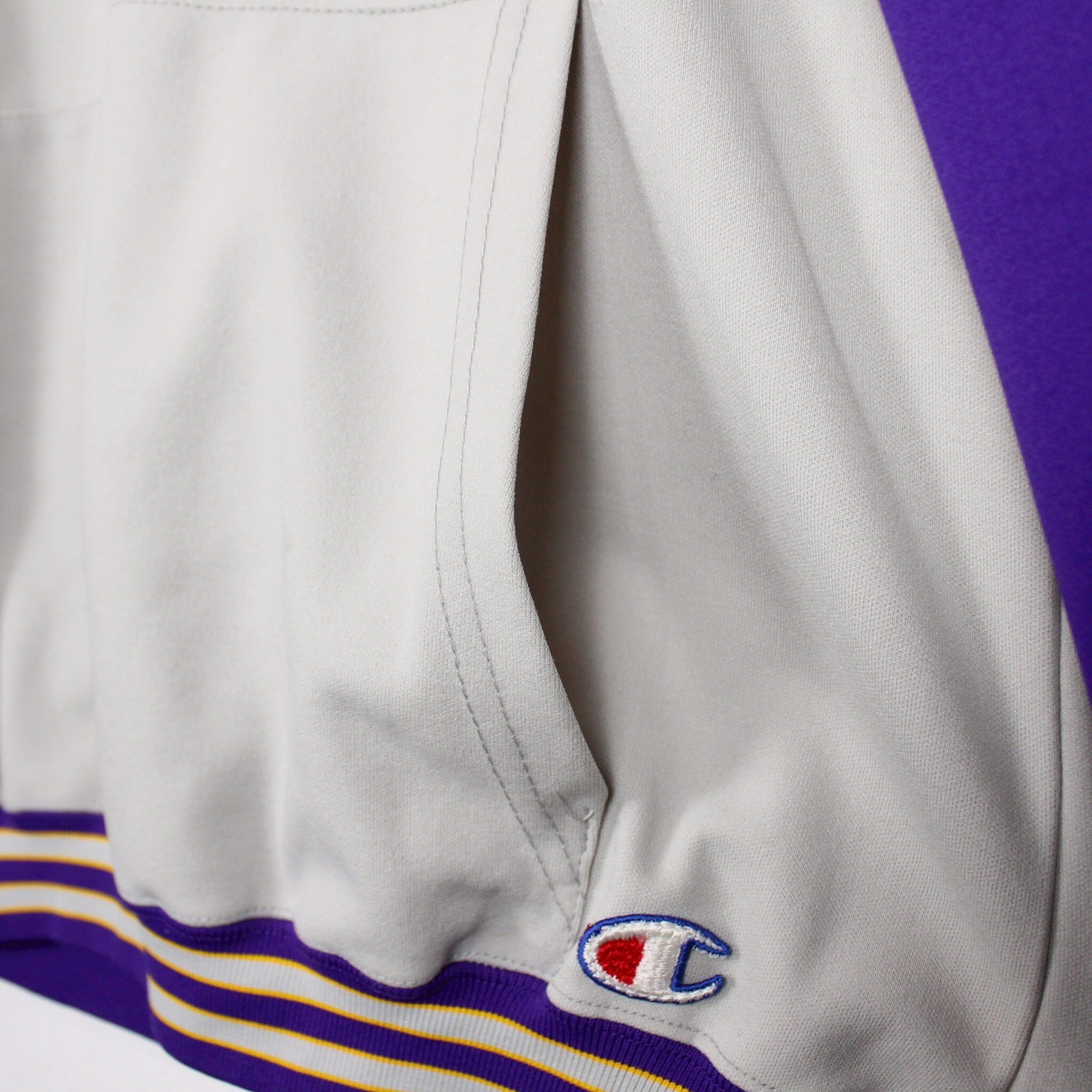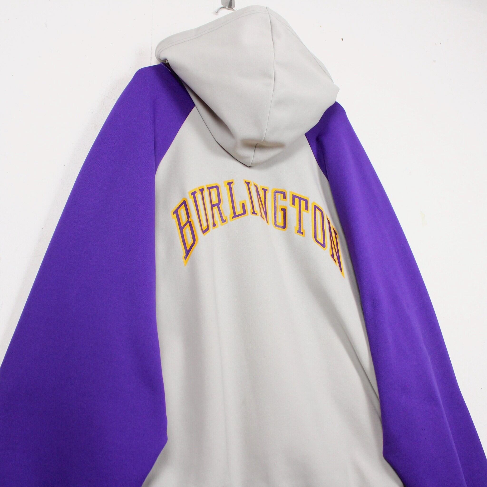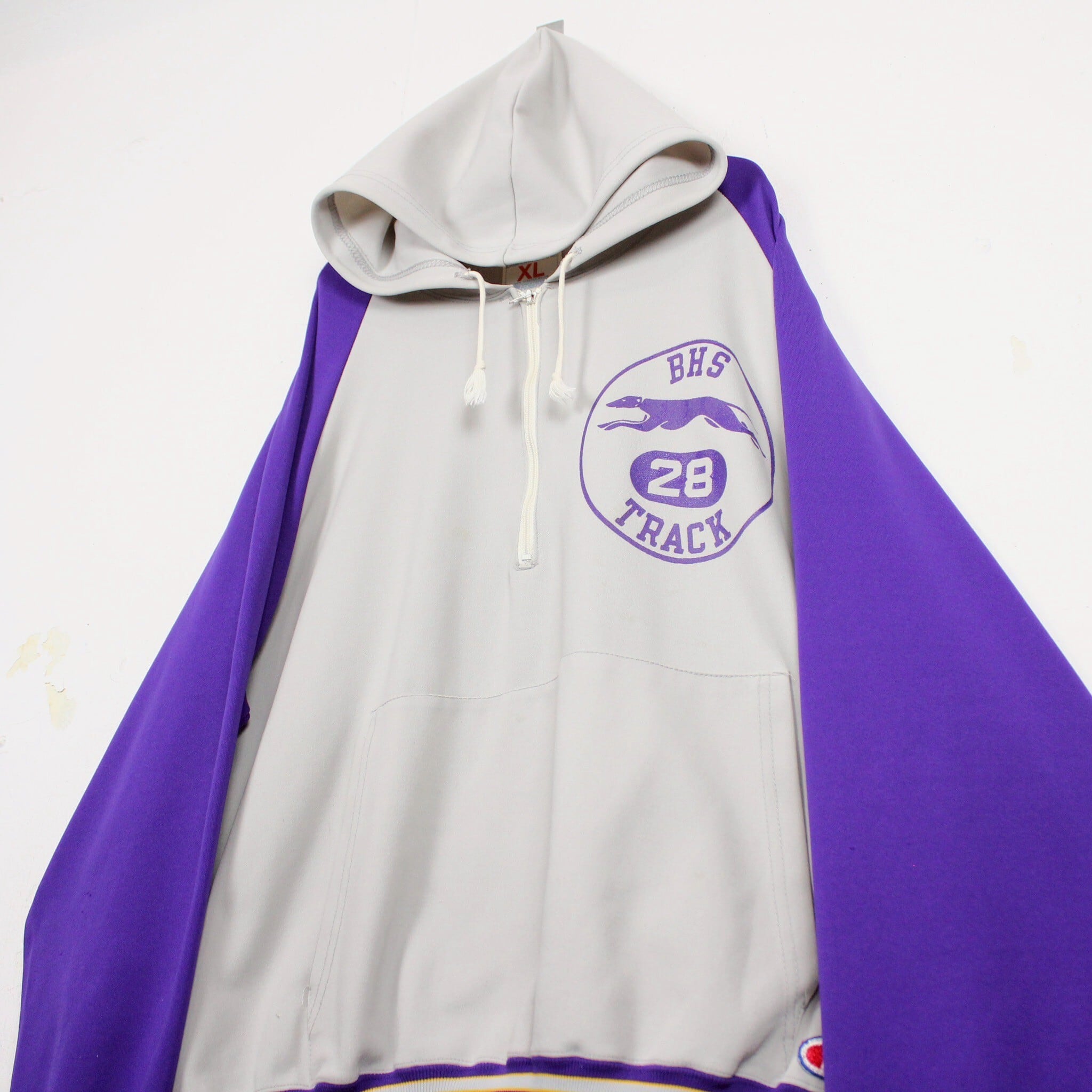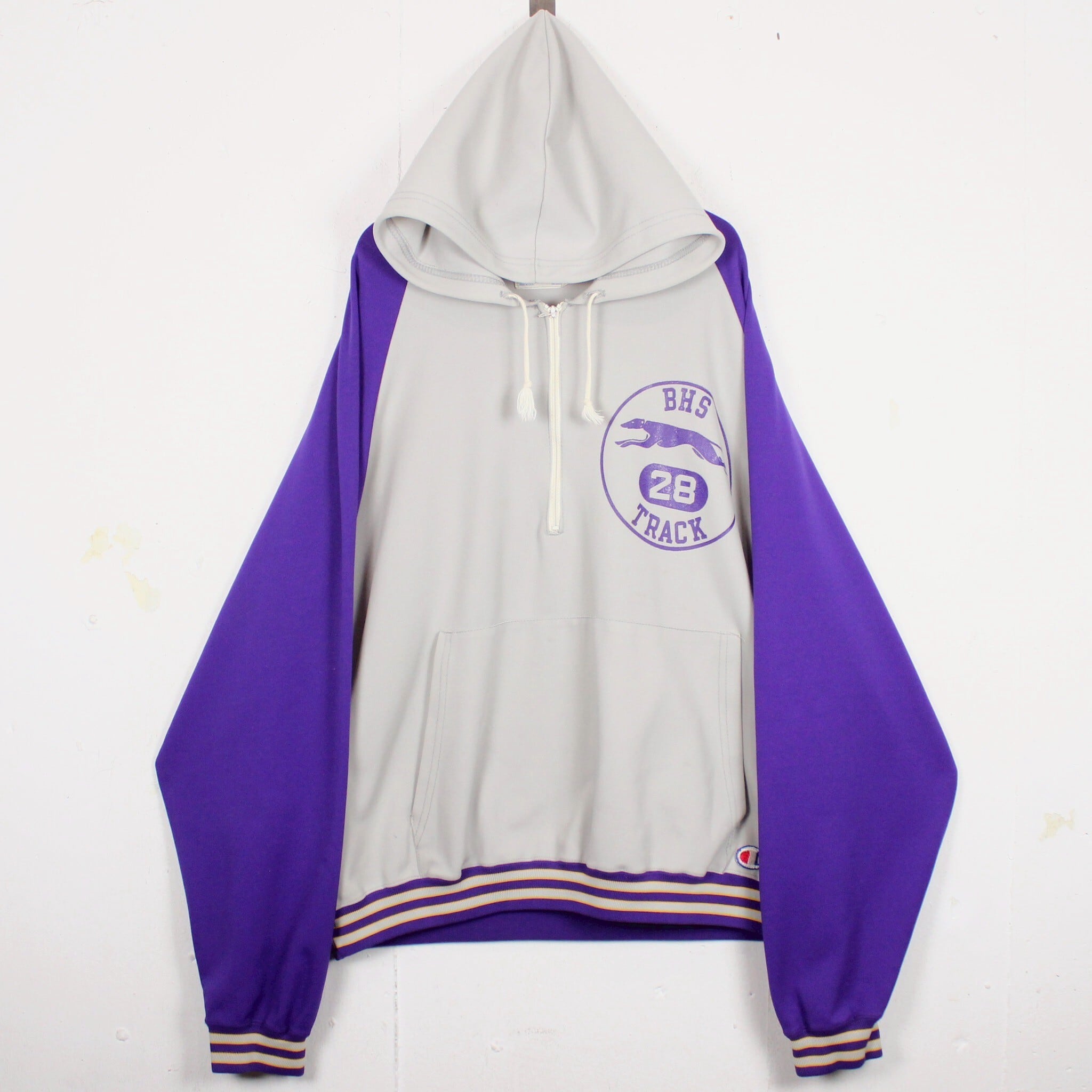 ホワイトに紫を切り替えたボディに、左胸にチームロゴ、背面にアーチロゴを載せたジャージ生地の60'sプルオーバーフーディ。