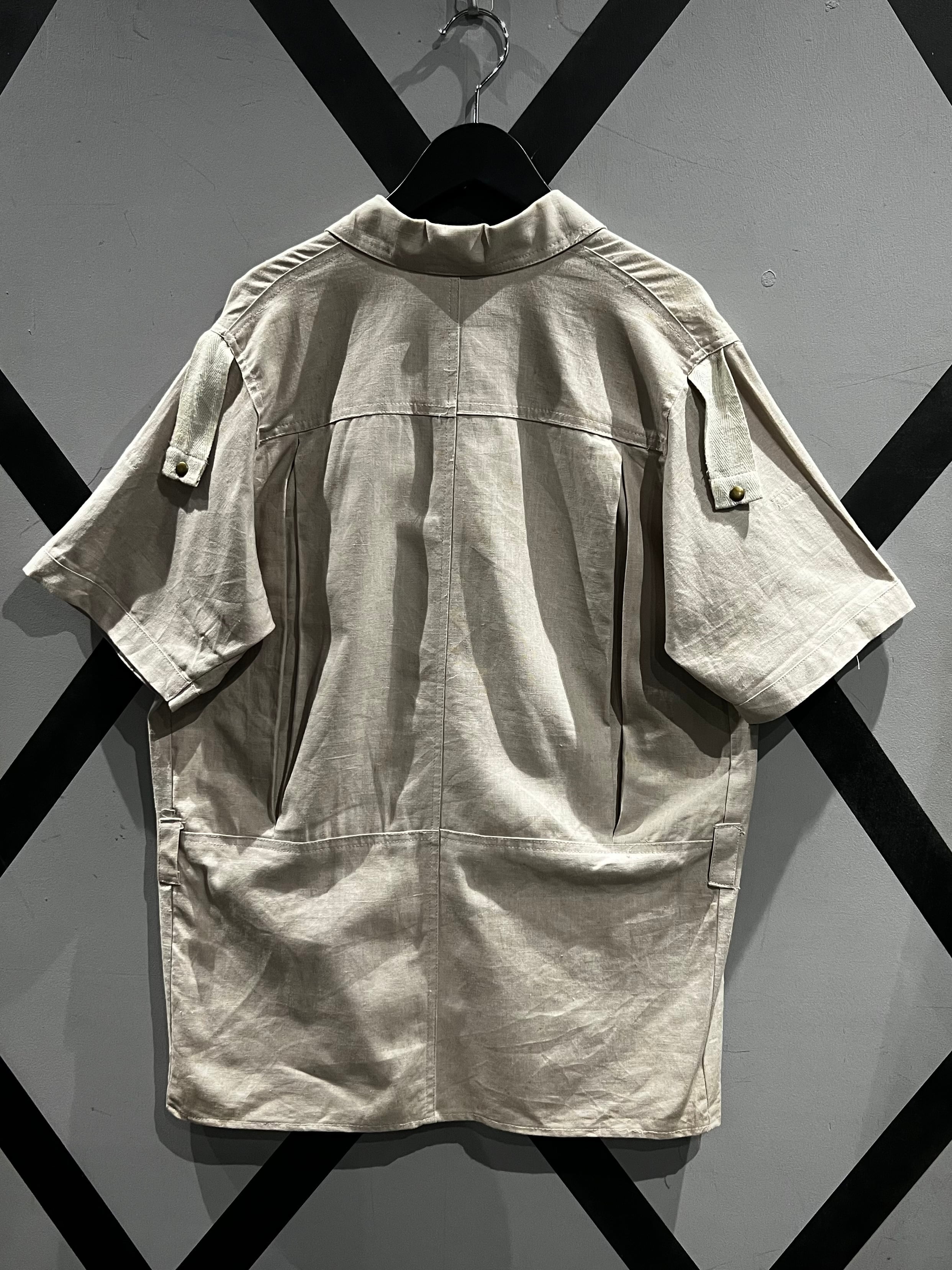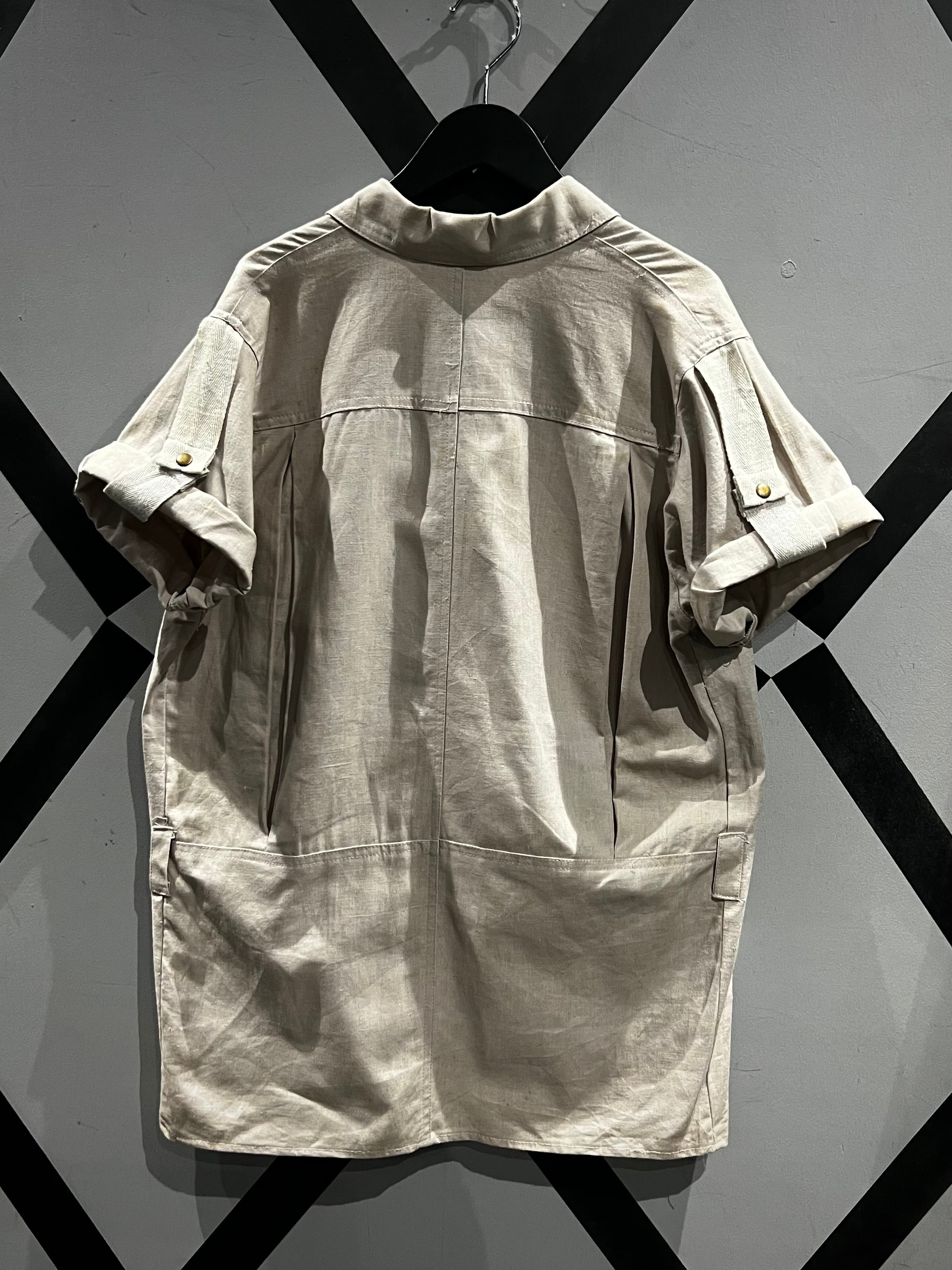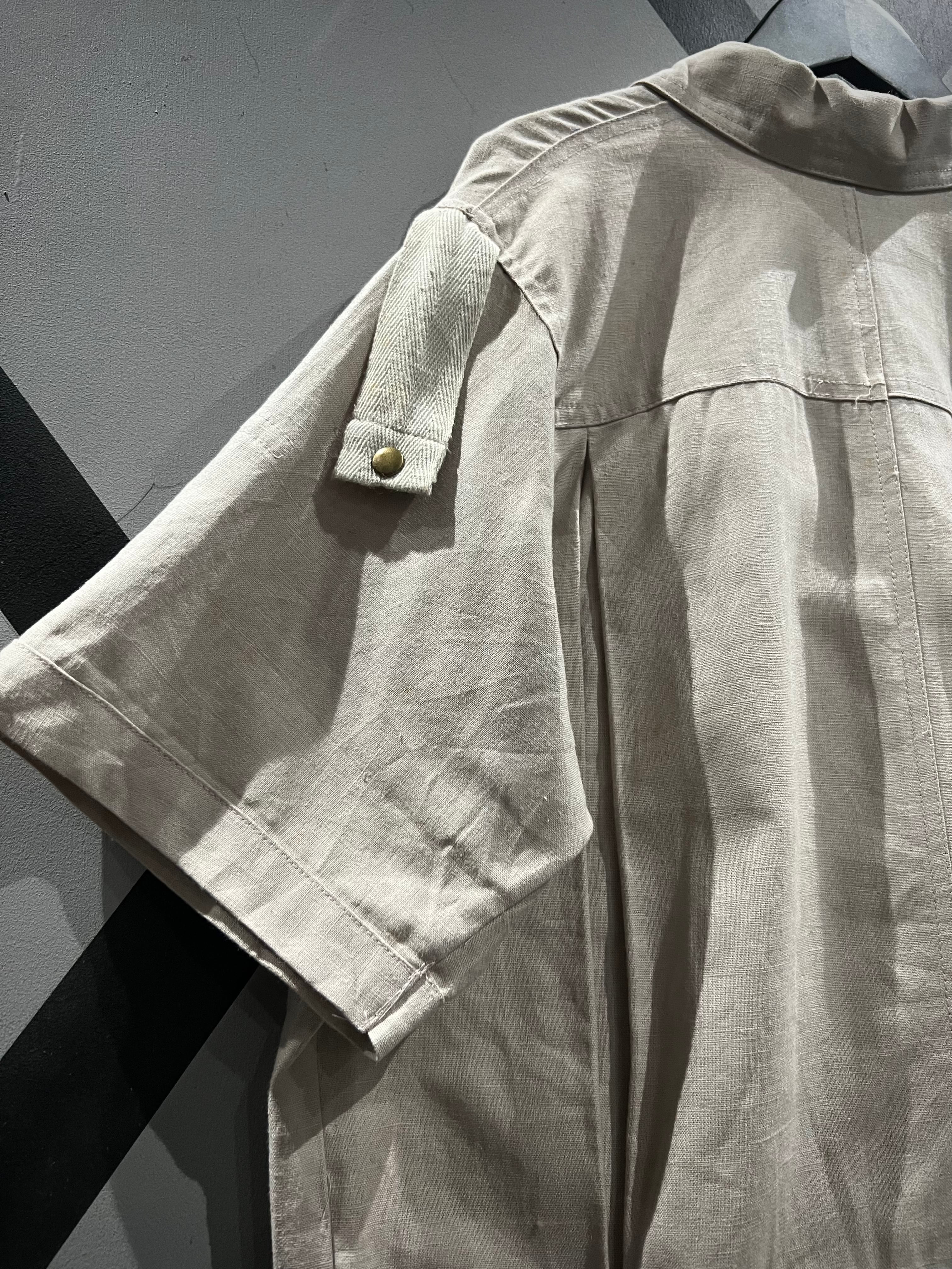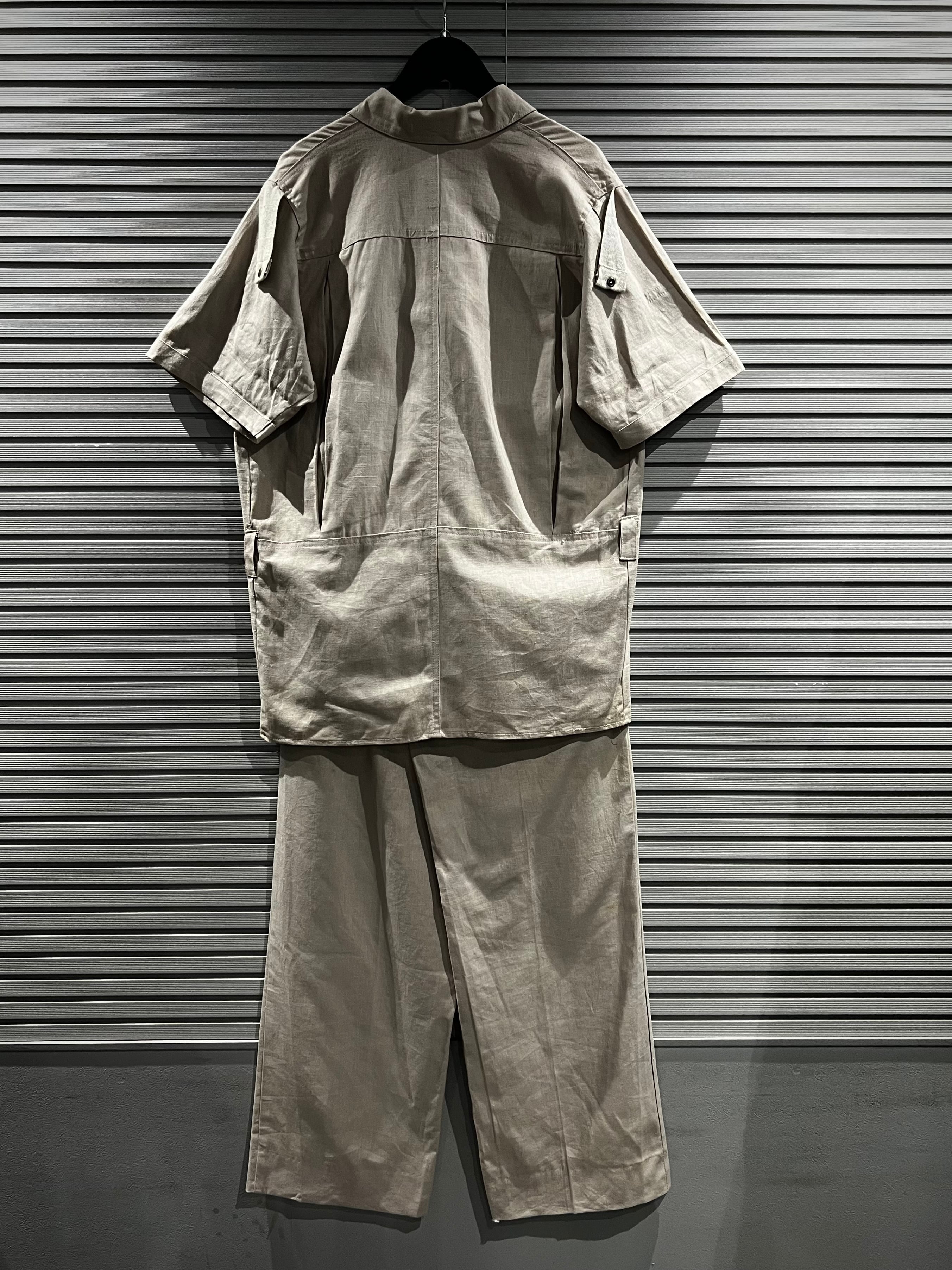アイボリーカラーのボディに、フロントにフラップポケットのギミックを載せた半袖シャツジャケットのセットアップ。