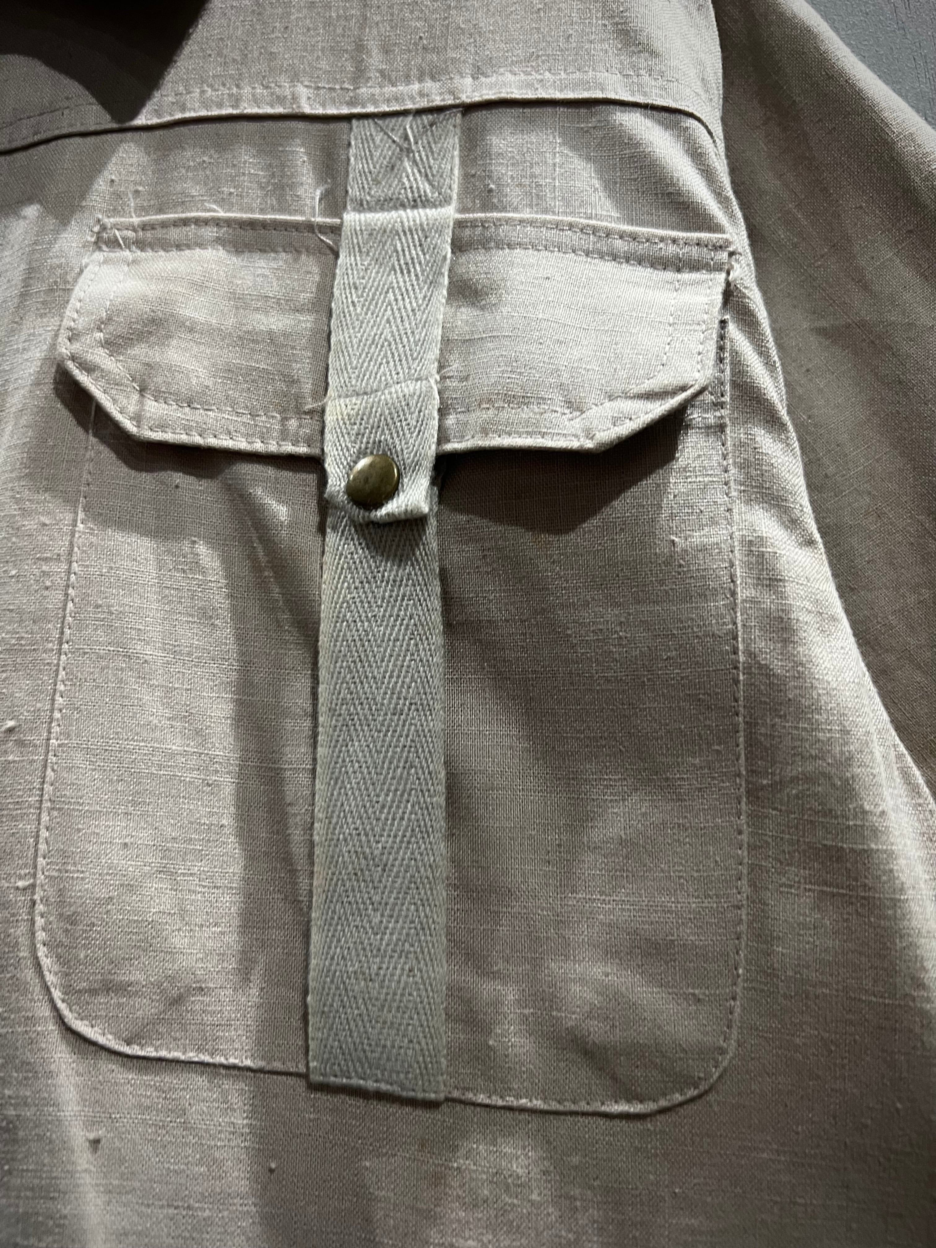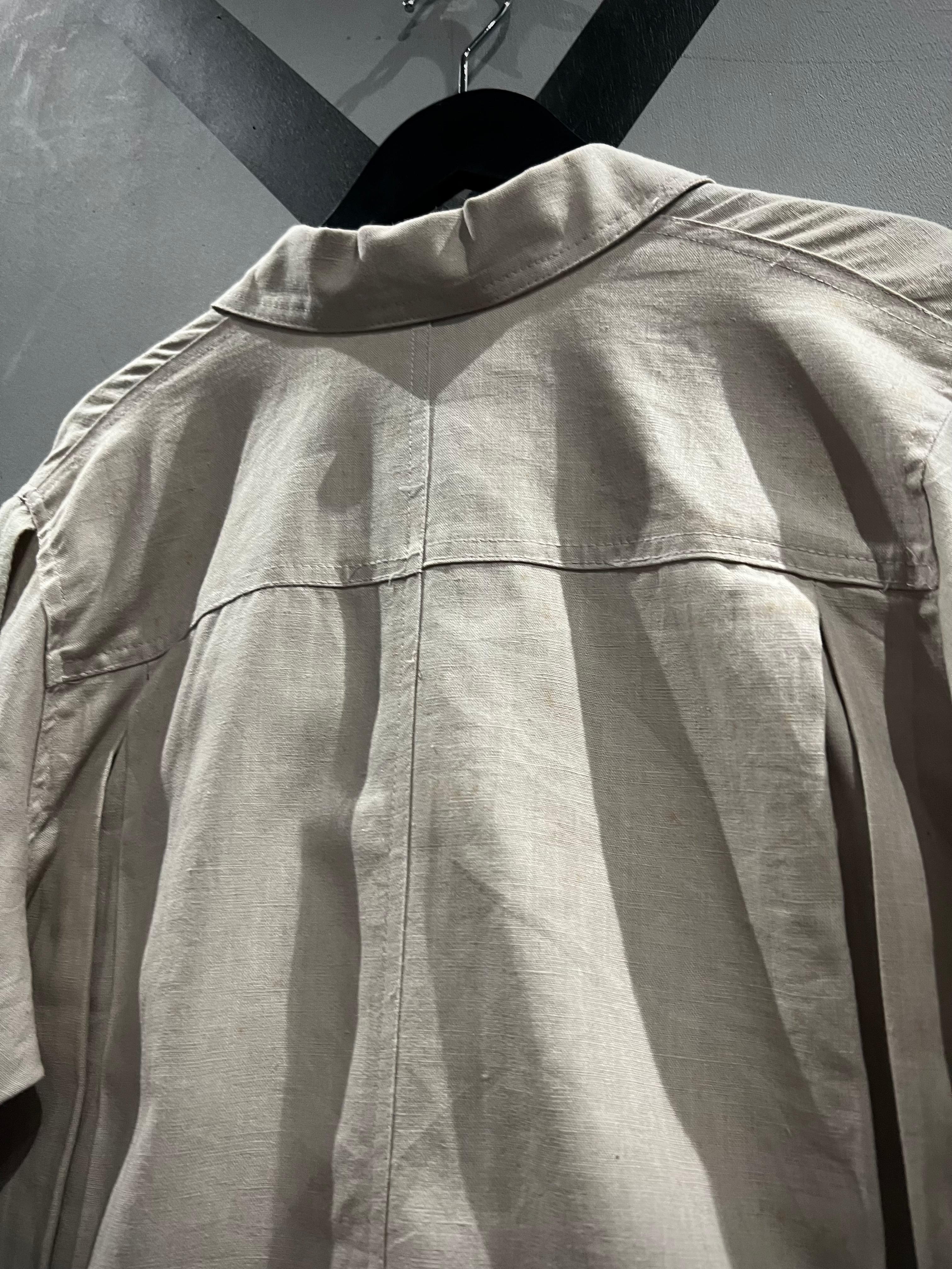 着込むほどに体に馴染み、経年変化による"ヤレ感"が生まれ愛着が湧くこと間違いなしの1着。コンディションも良好、自分好みに育てることのできる、スペシャルなのラミー×コットンのシャツジャケットセットアップです。