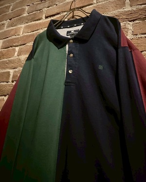 赤、ネイビー、グリーンのレトロなカラーリングでパネル状に切り替えられた長袖ポロシャツ。