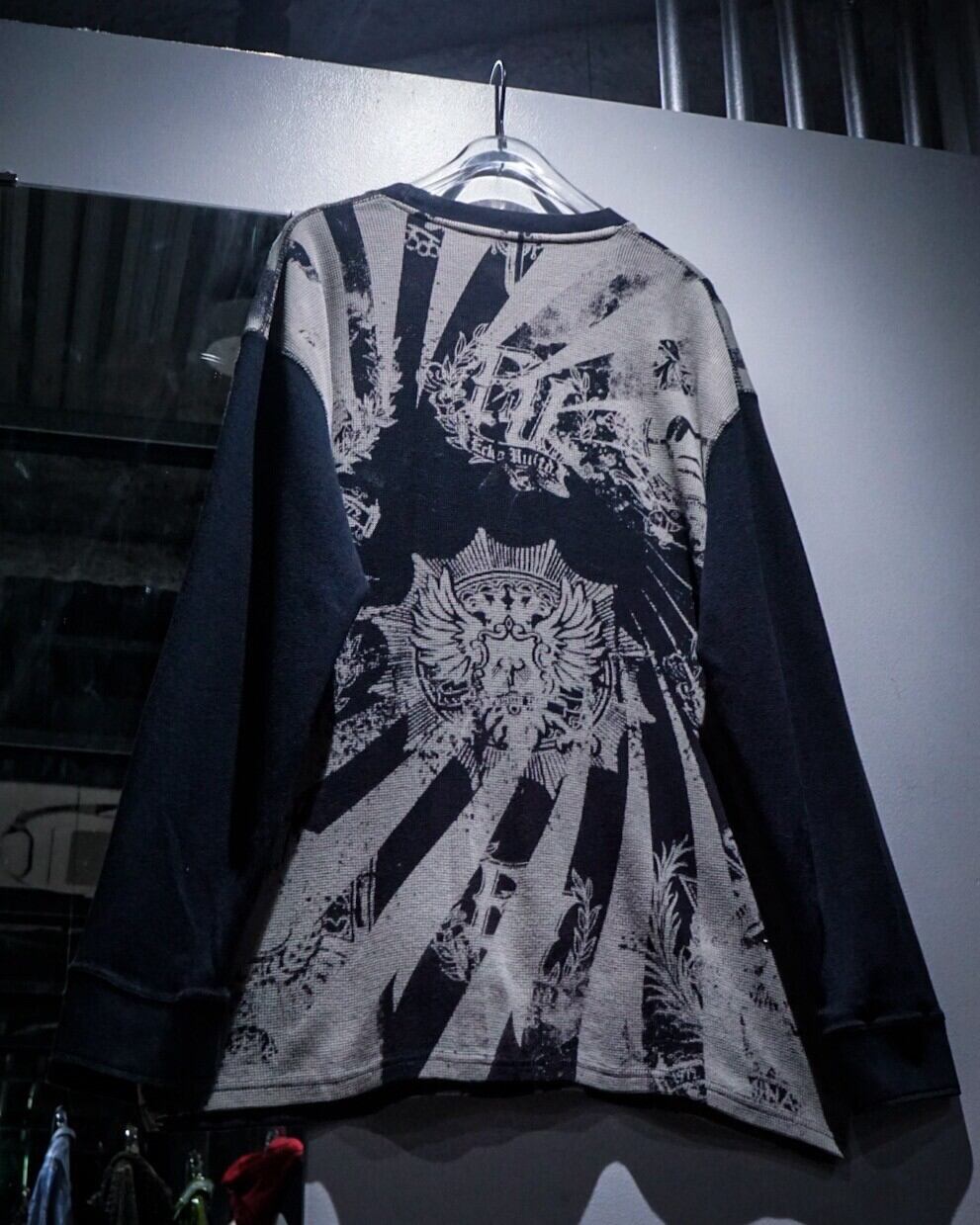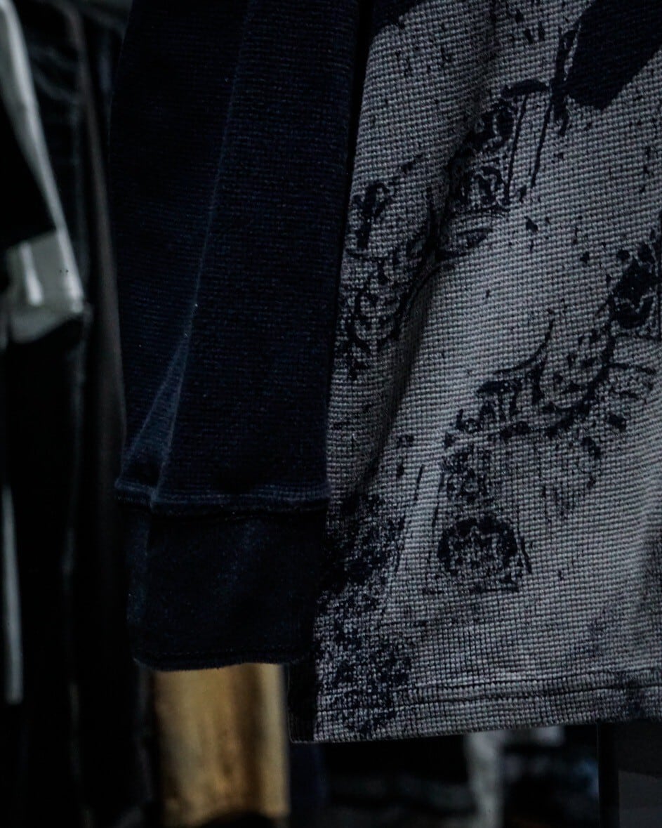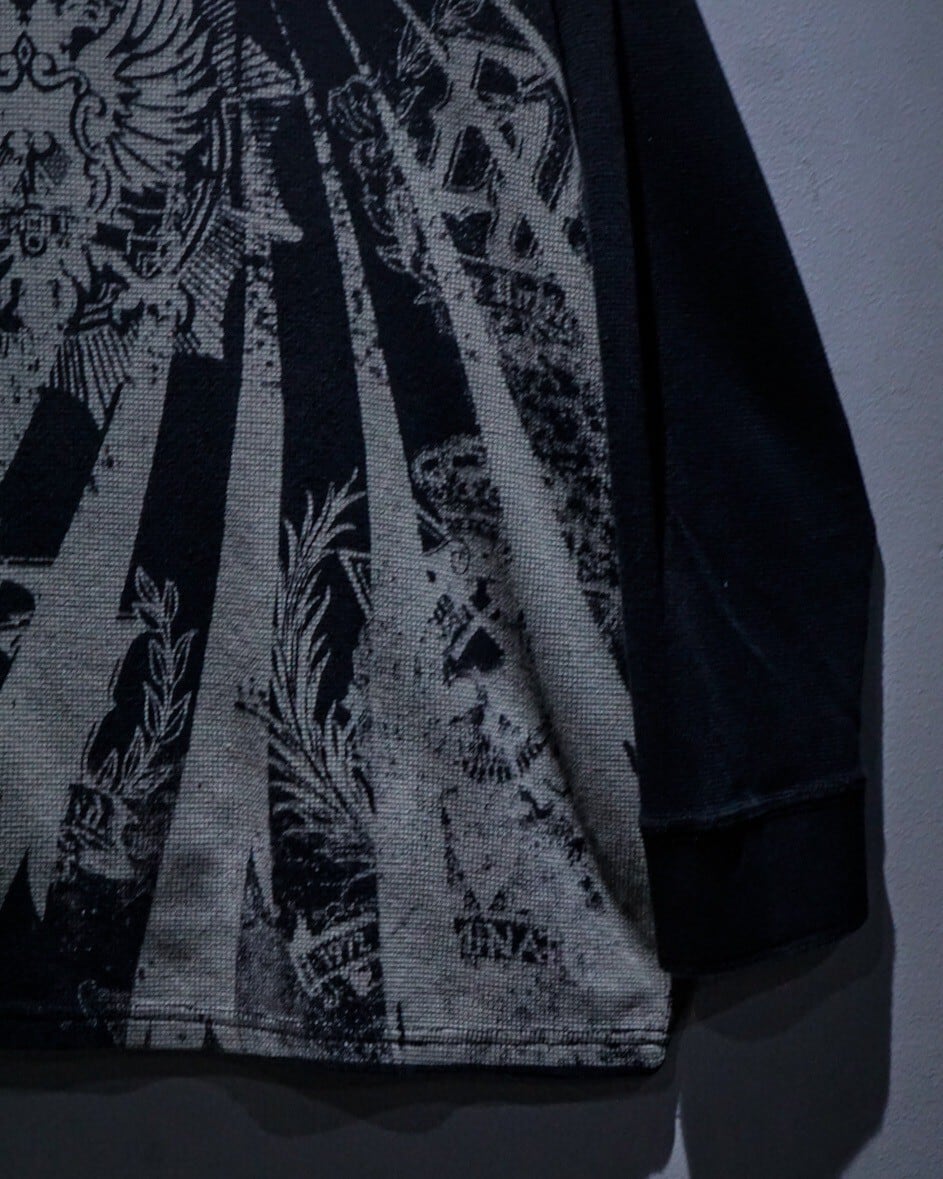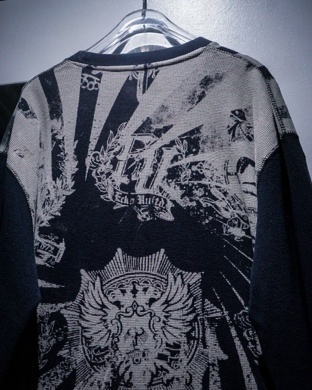 サーマル生地を用いたブラックボディをベースに、前背面の身頃を大胆に使用してゴシックなデザインを載せた1着。
