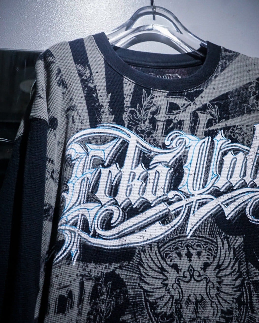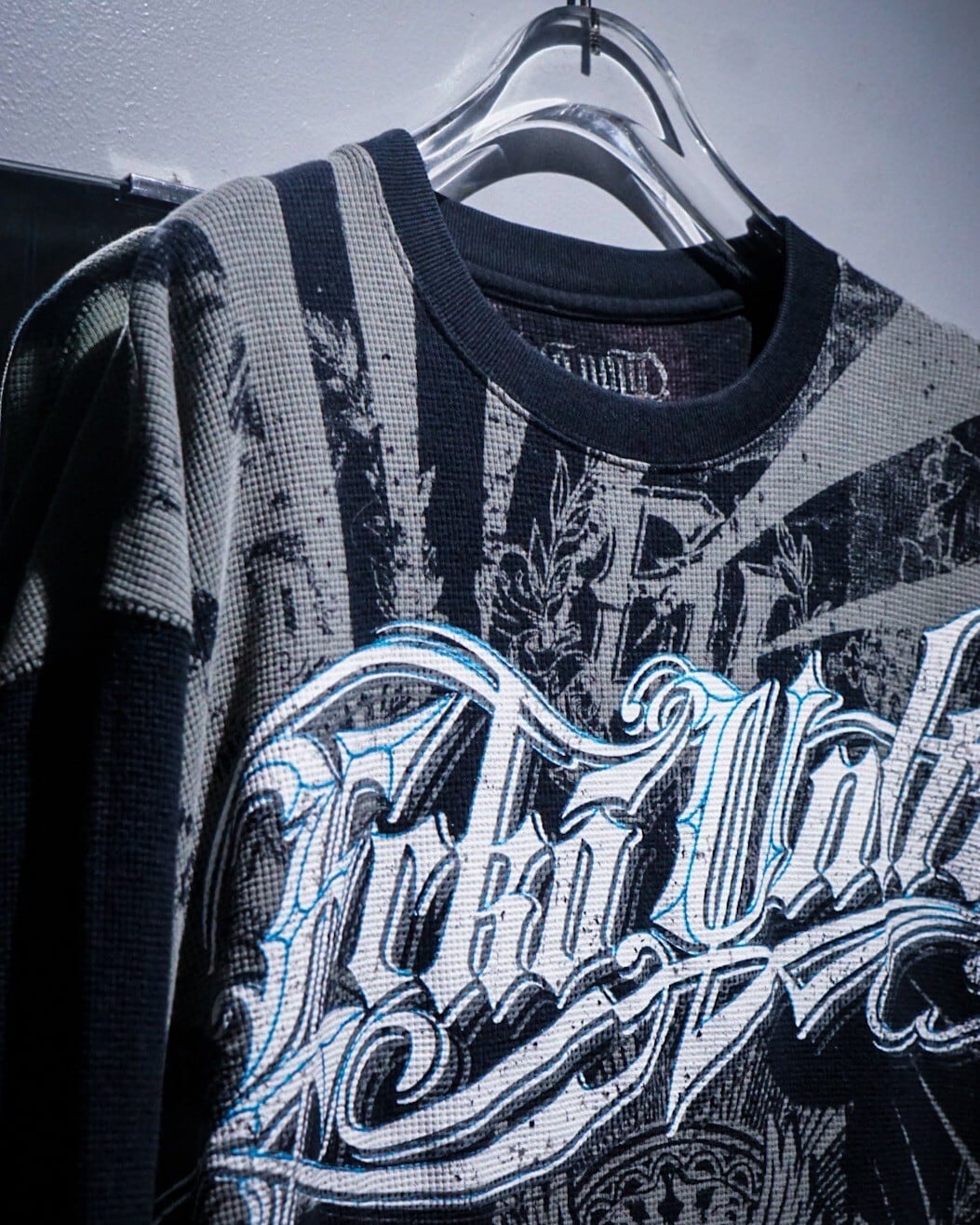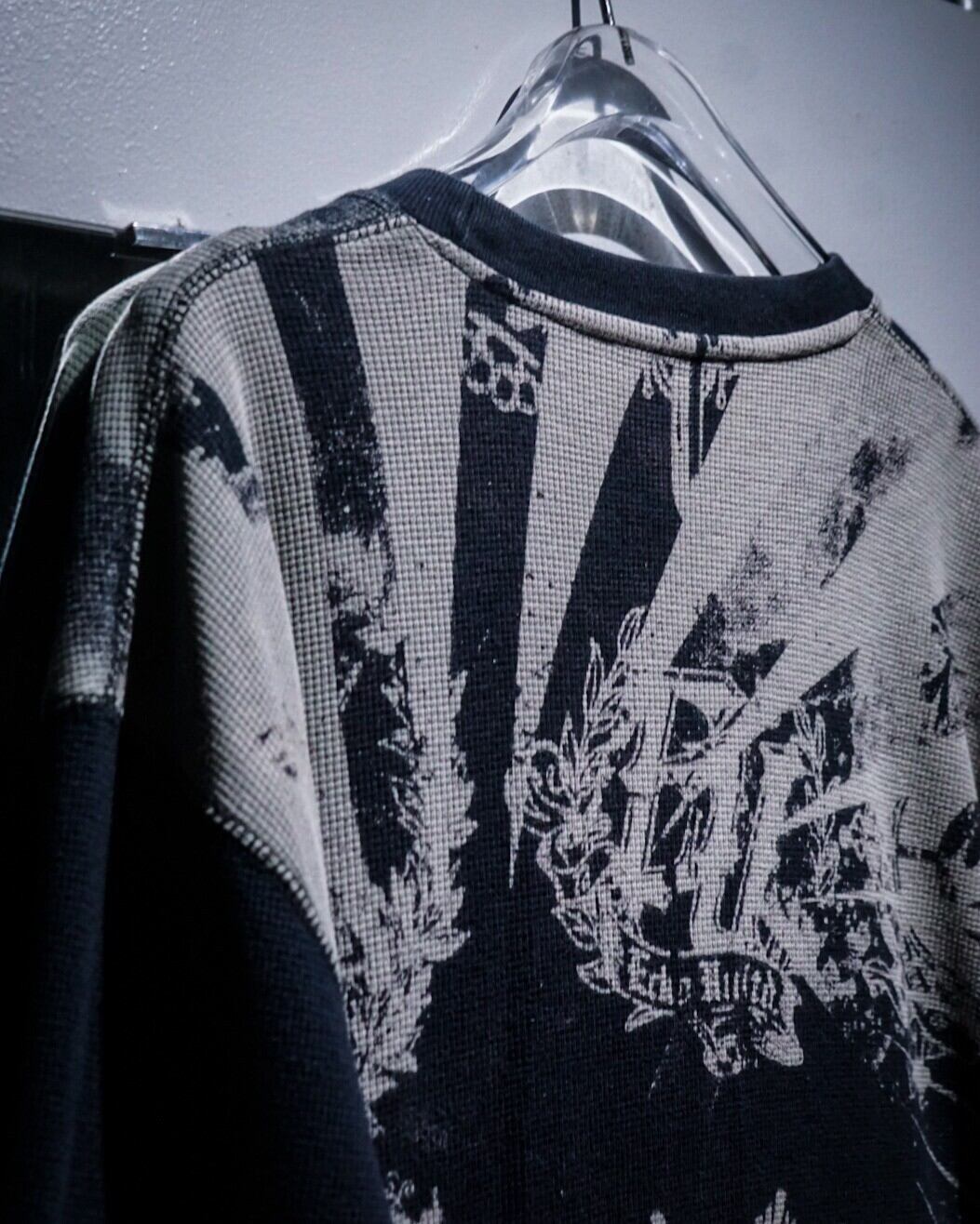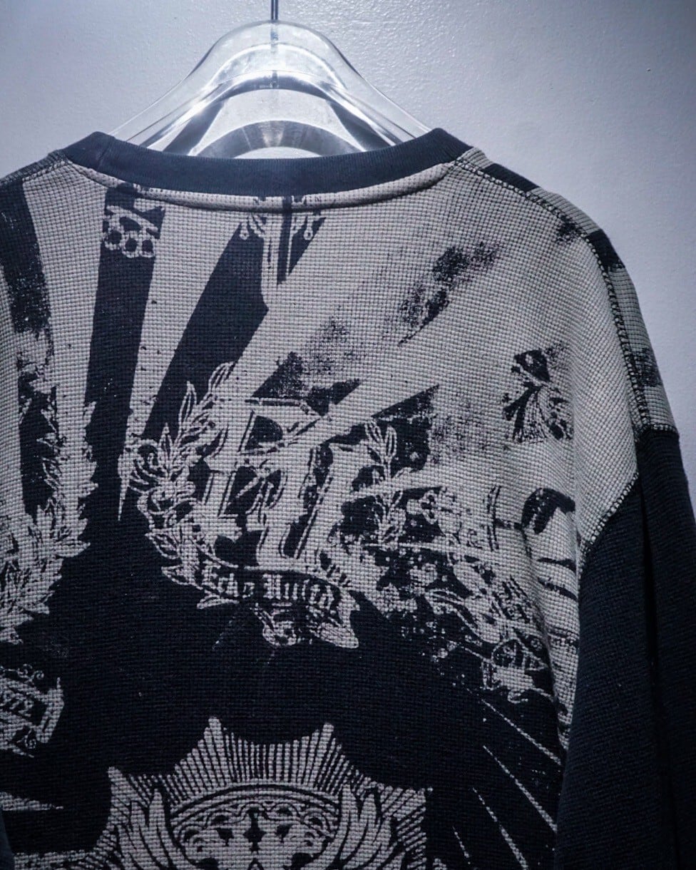 サーマル生地を用いたブラックボディをベースに、前背面の身頃を大胆に使用してゴシックなデザインを載せた1着。