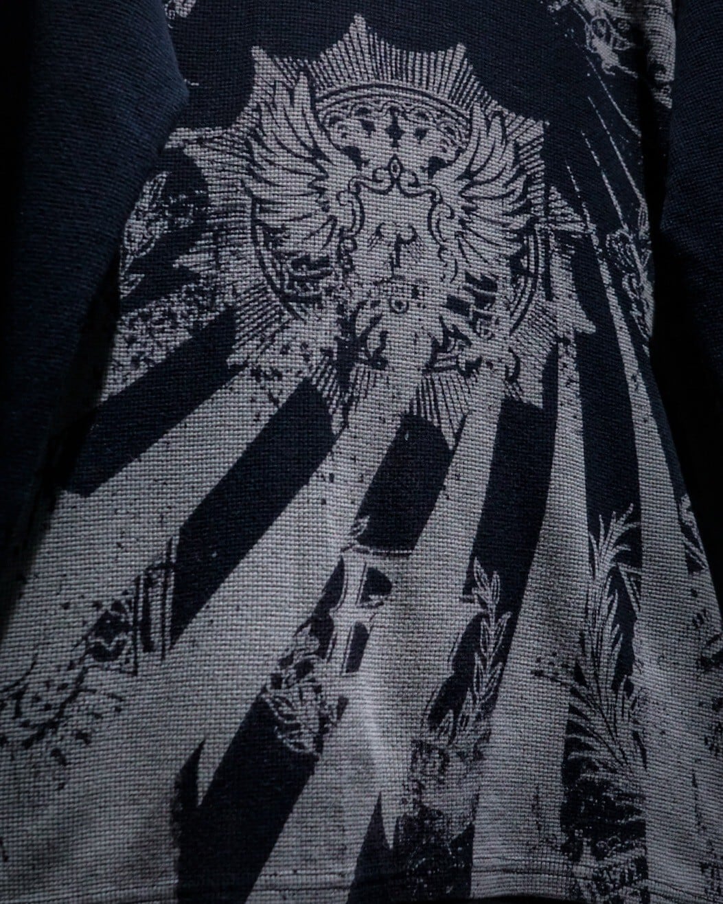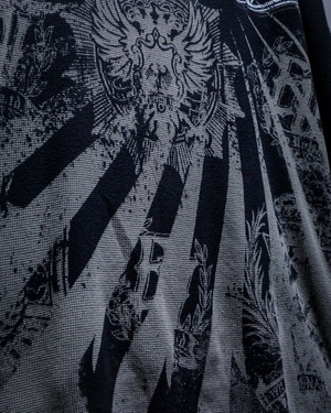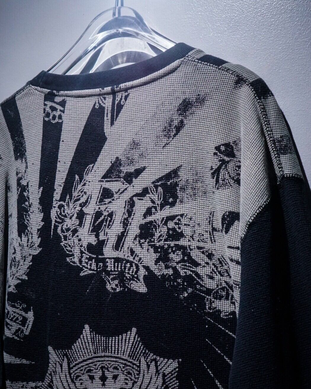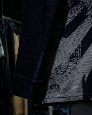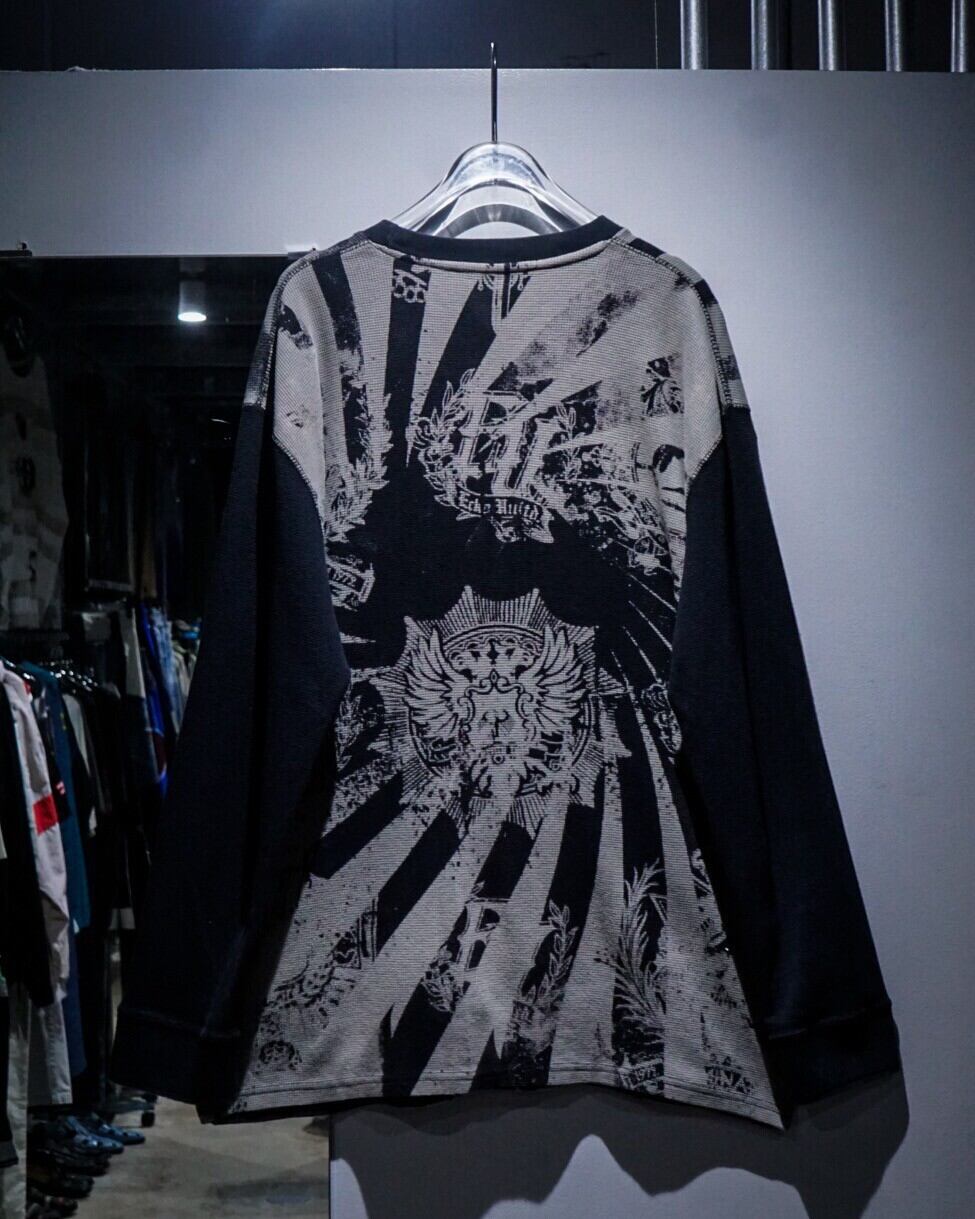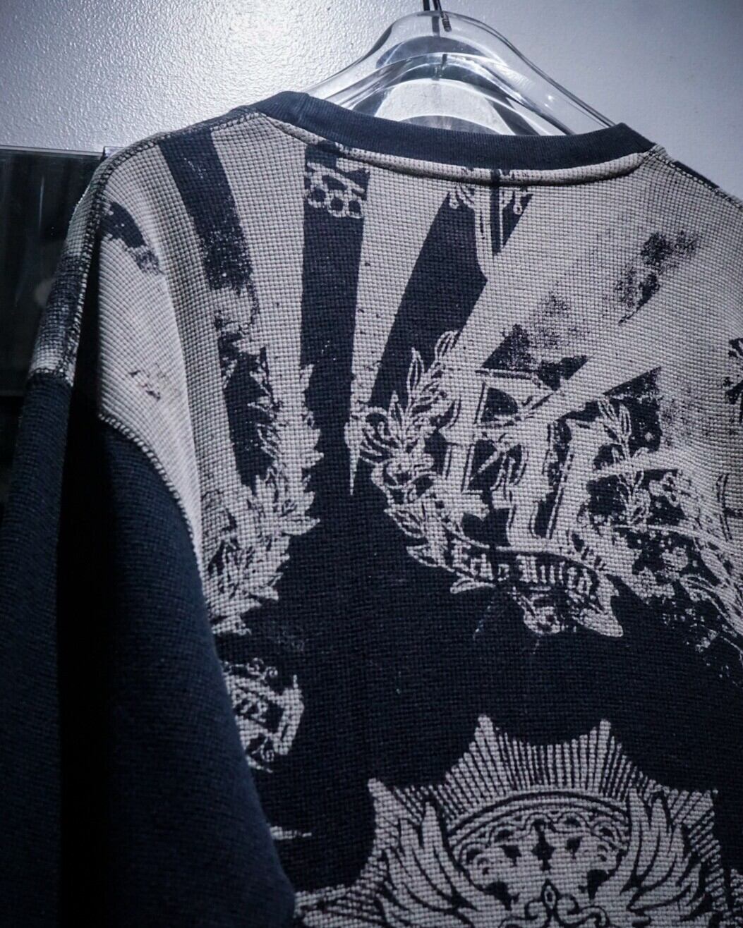 サーマル生地を用いたブラックボディをベースに、前背面の身頃を大胆に使用してゴシックなデザインを載せた1着。