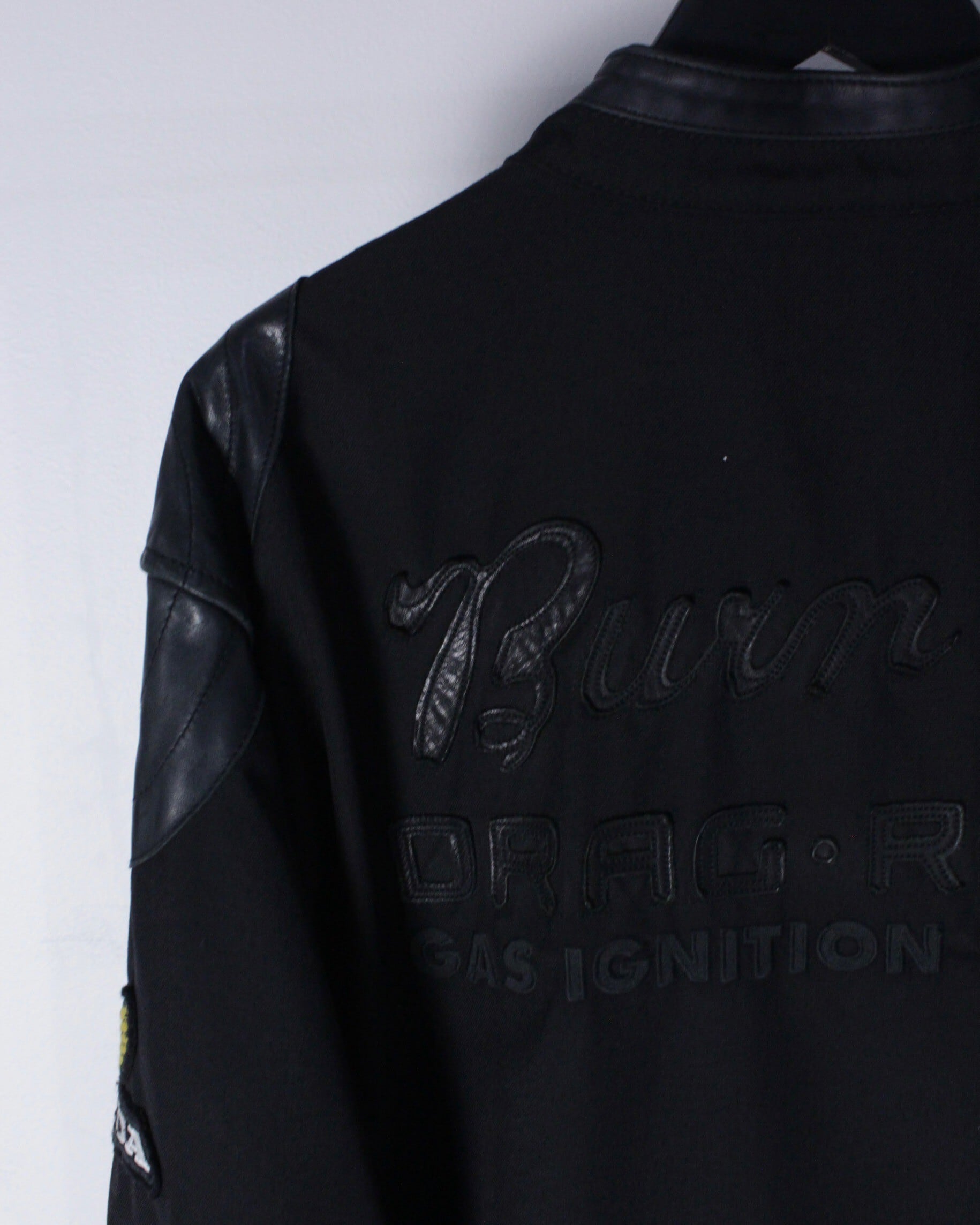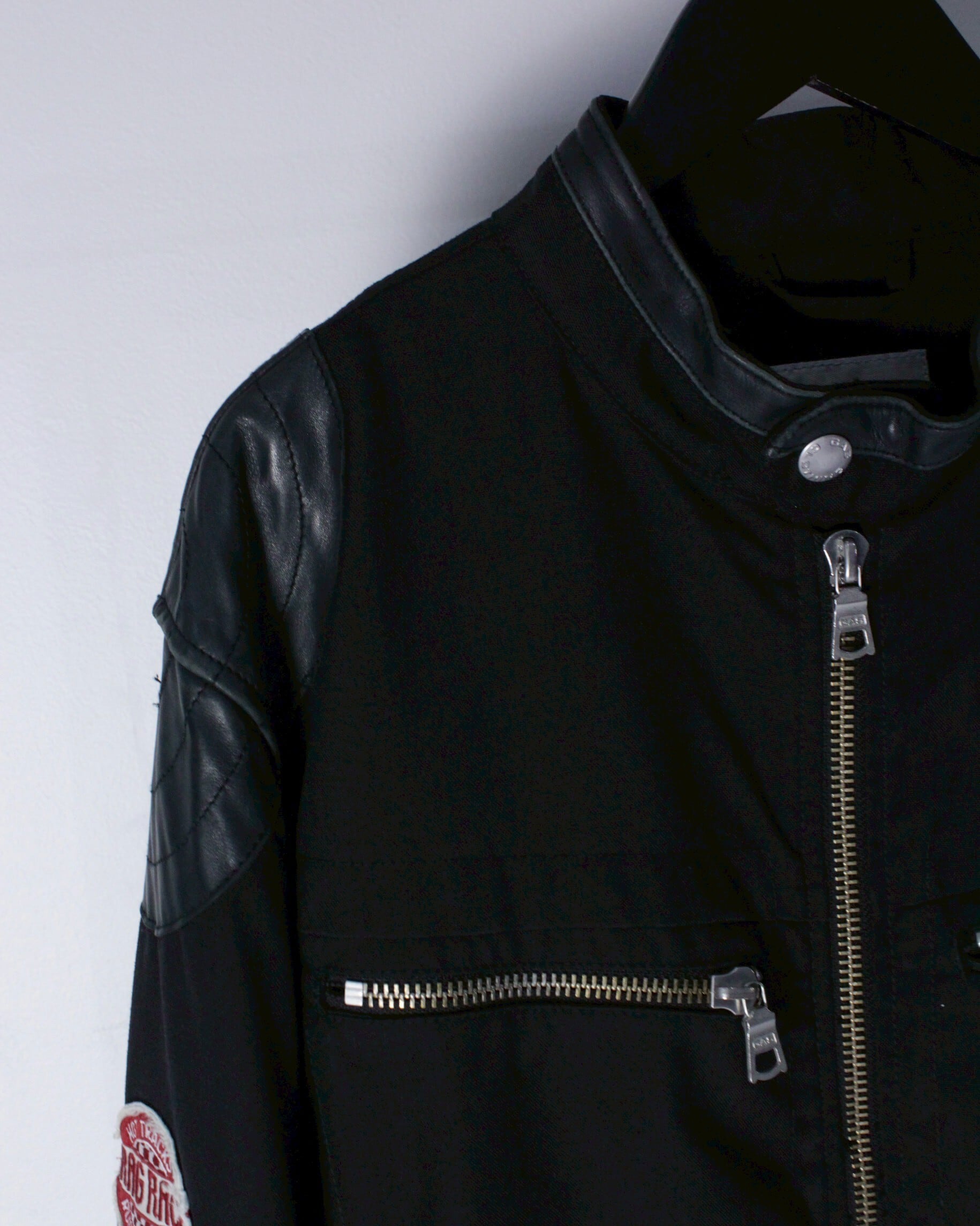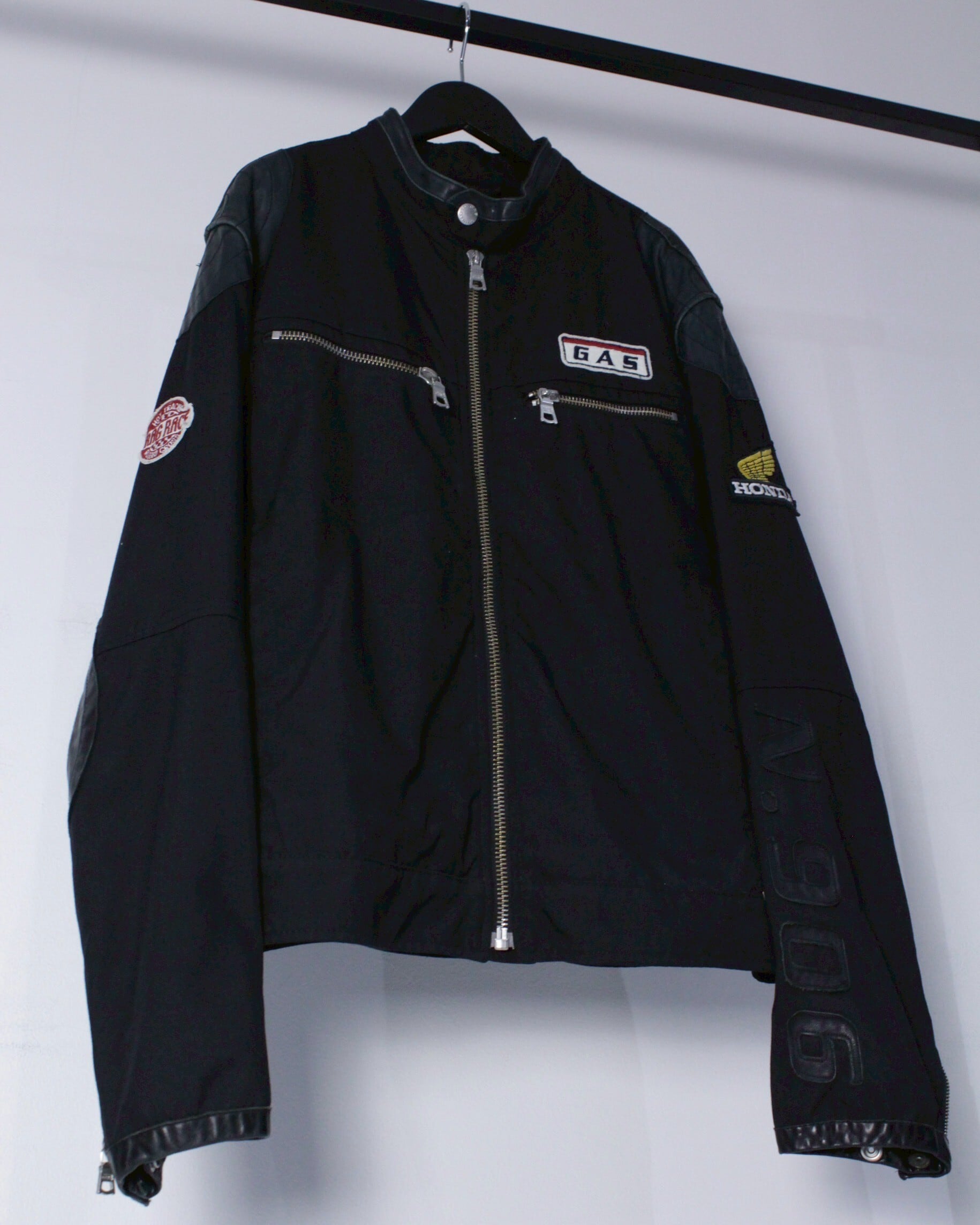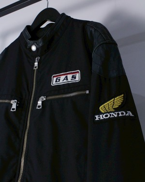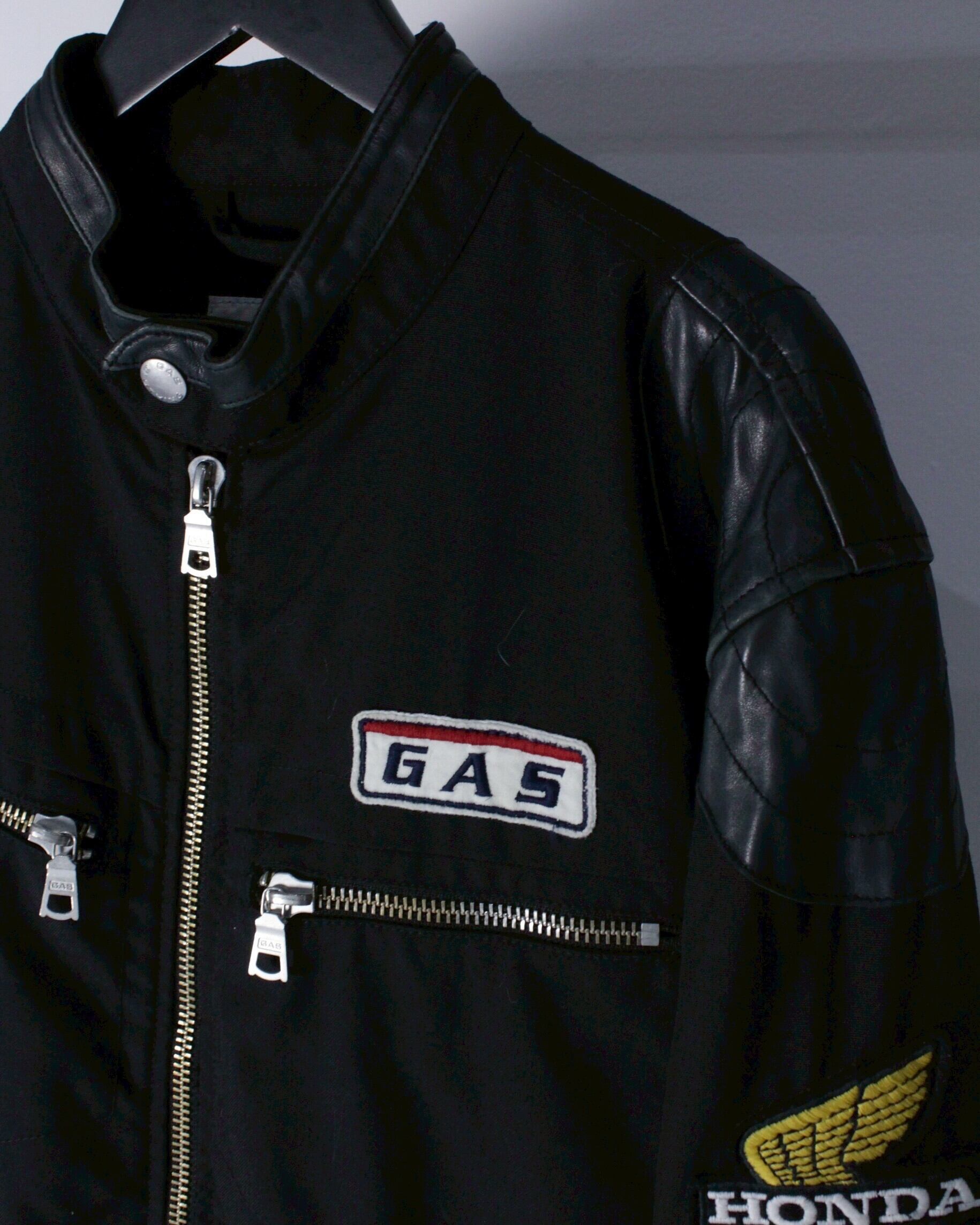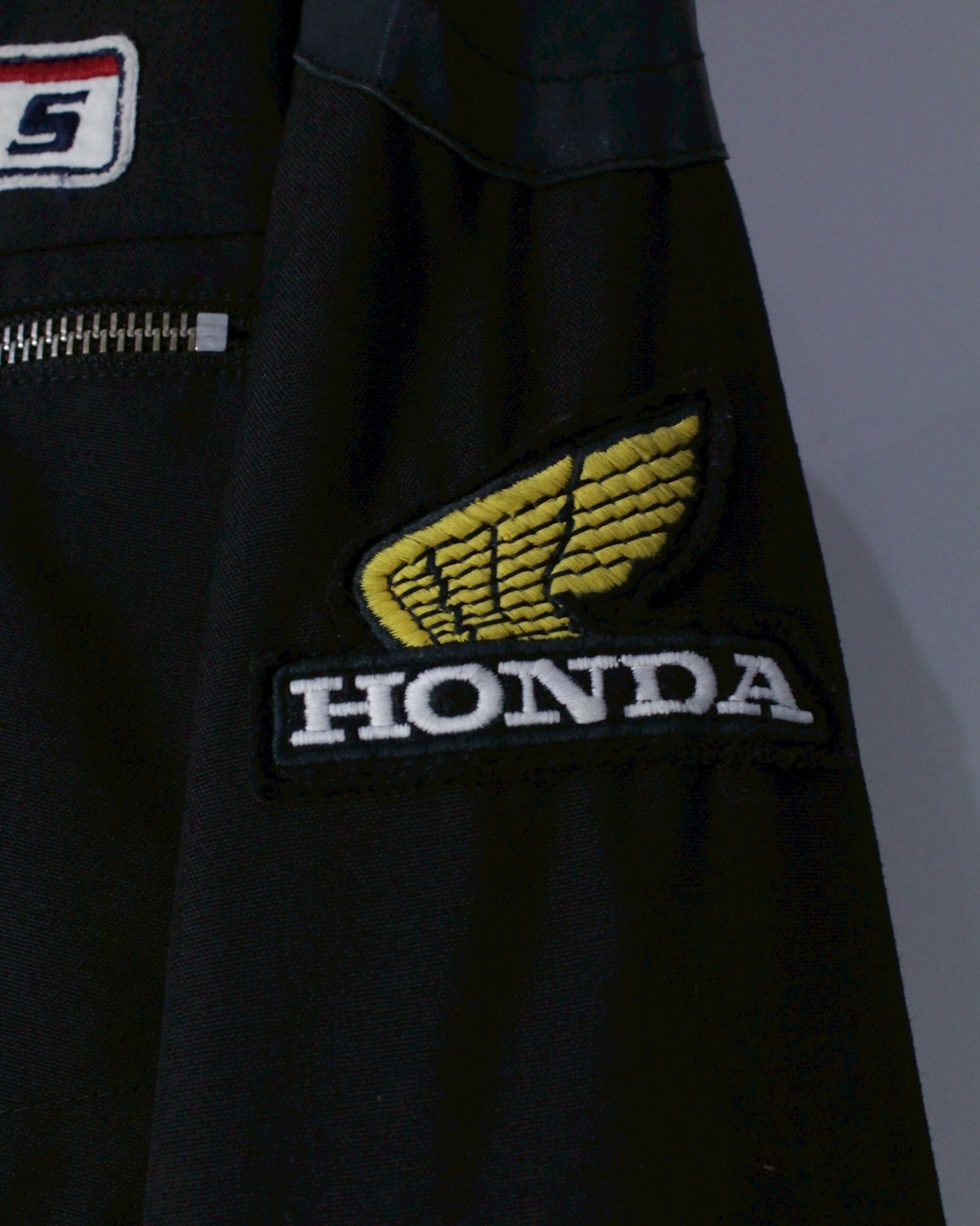 肩や肘にはレーシングらしいレザーの切り替え、ホンダのロゴ等のレーシング特有のパッチが施されたジャケット。