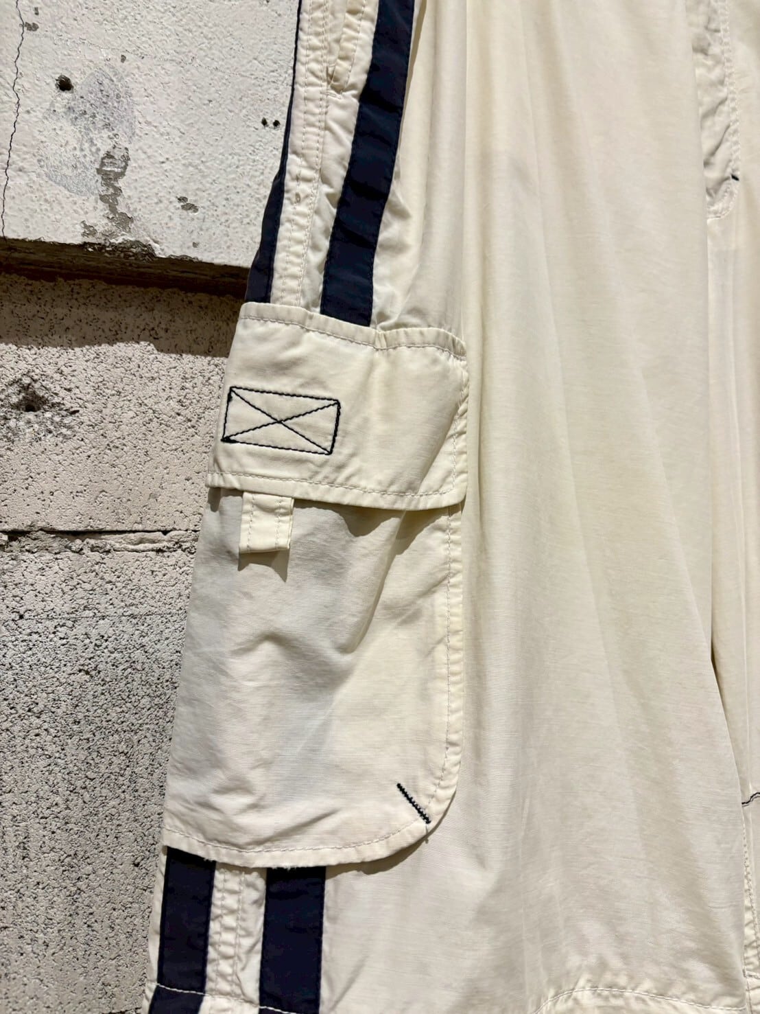 ハリのあるナイロンコットンのホワイトのボディに、ショーツとしても履ける2wayのギミックを落とし込んだワイドパンツ。