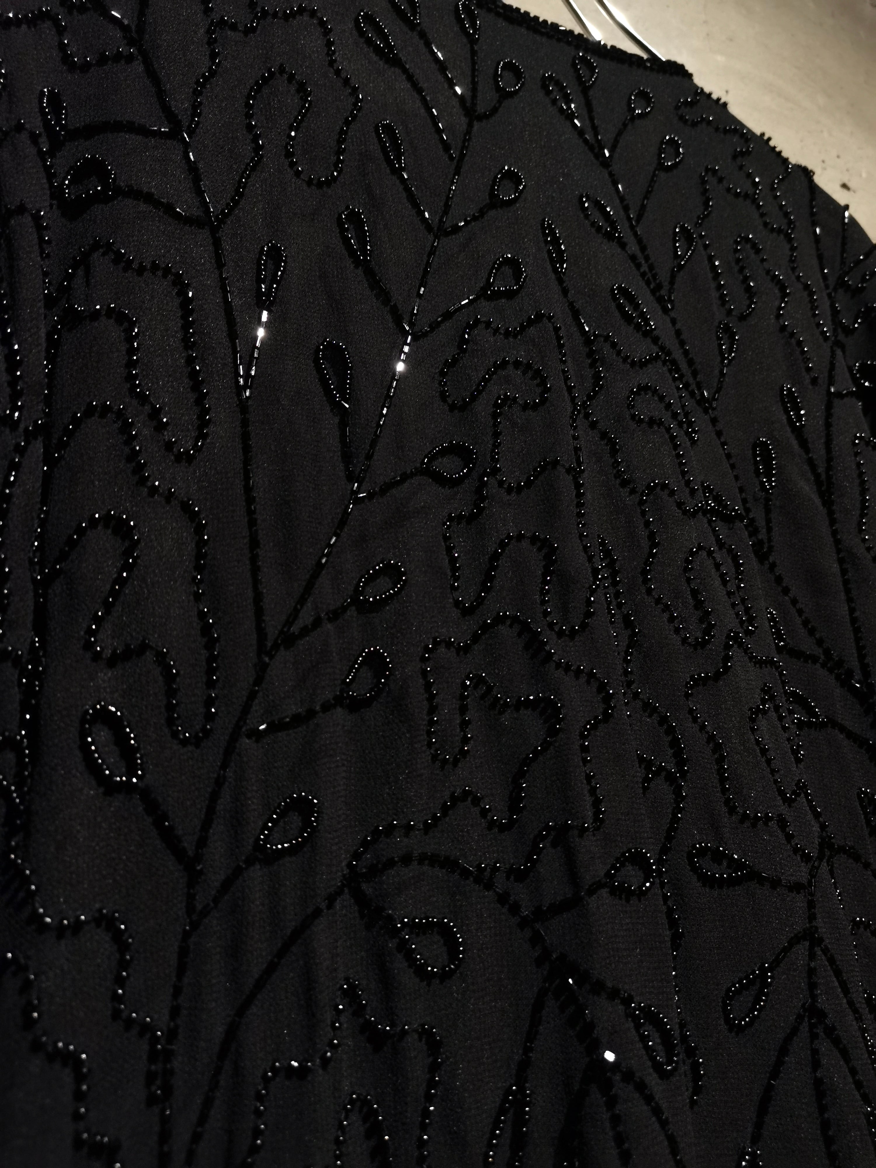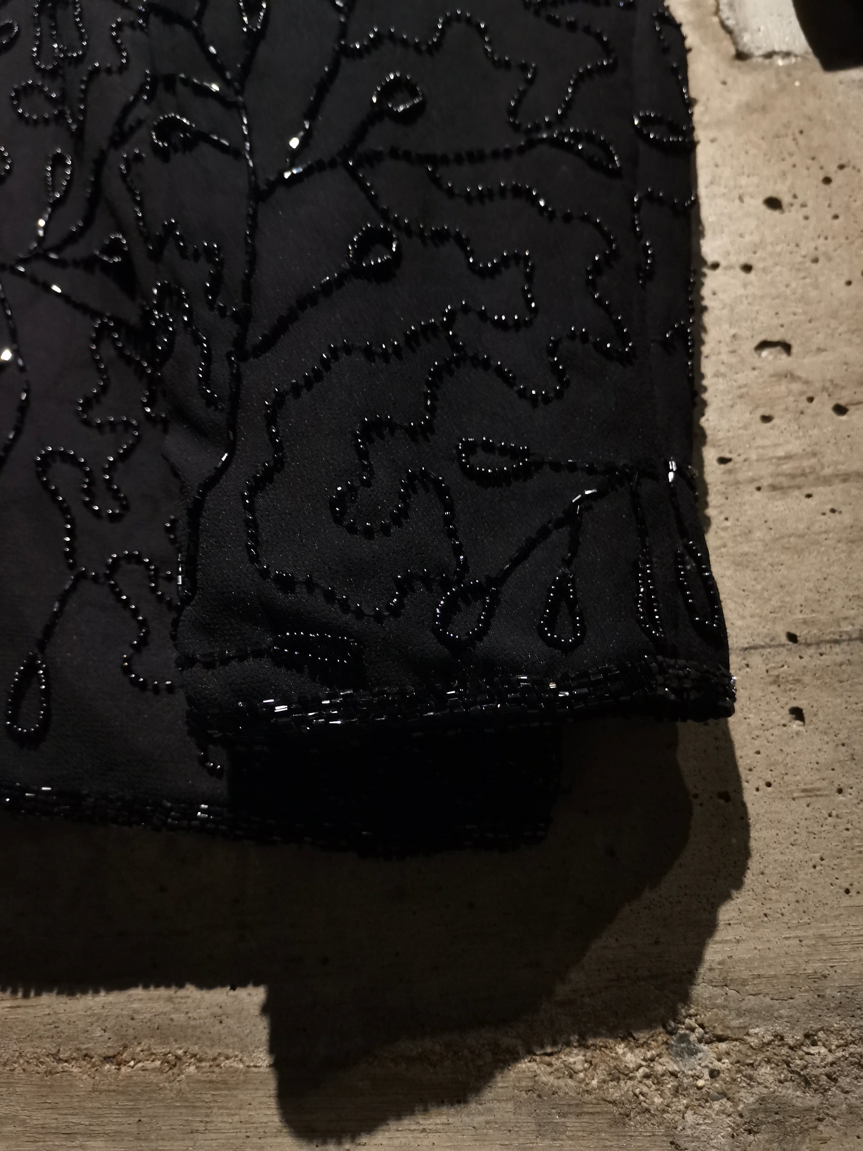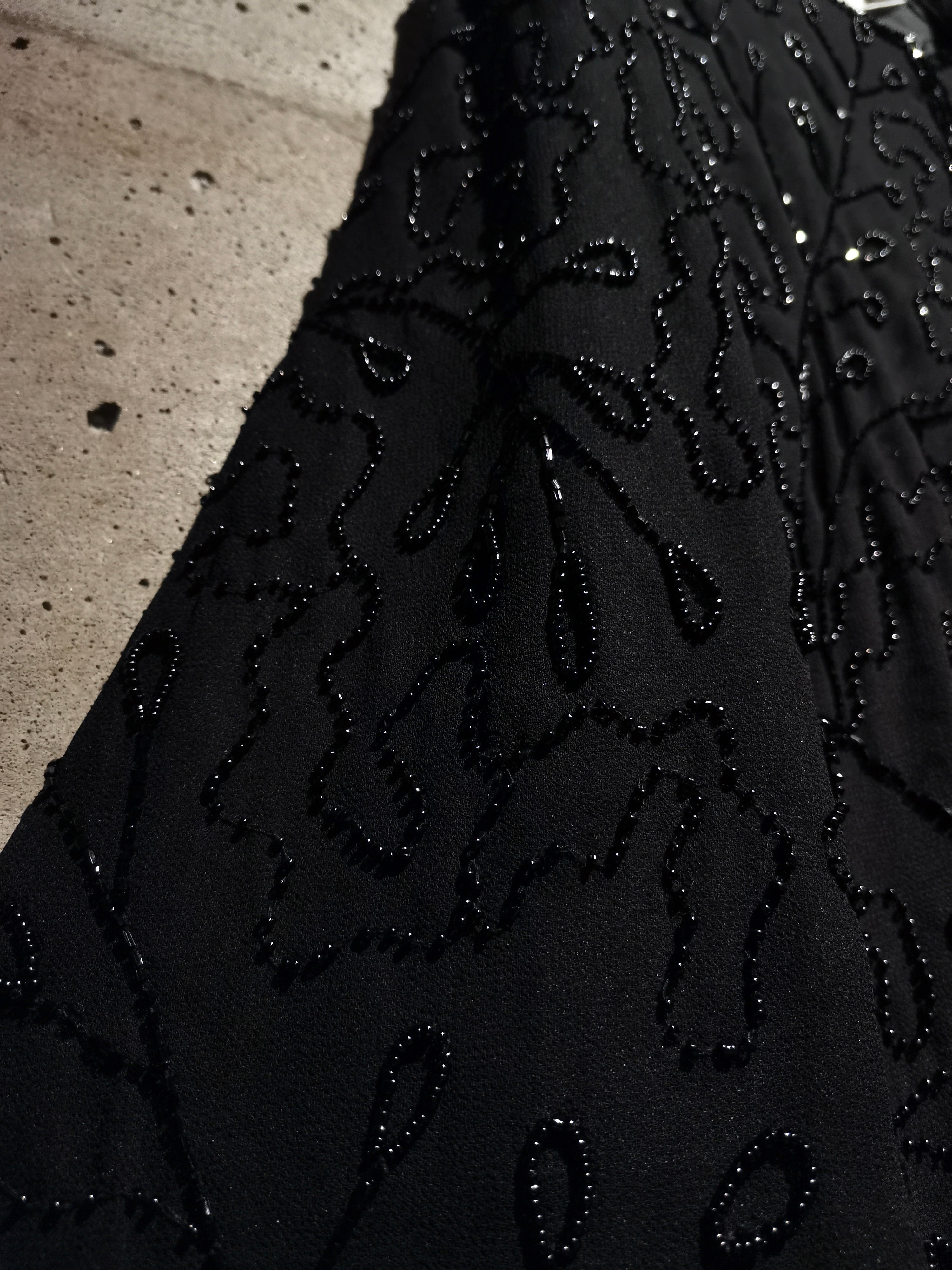 繊細に光沢を放つビーズがオールブラックのボディに非常に映え落ち着きながらもキラキラと存在感を発揮、モードな雰囲気を漂わせています。