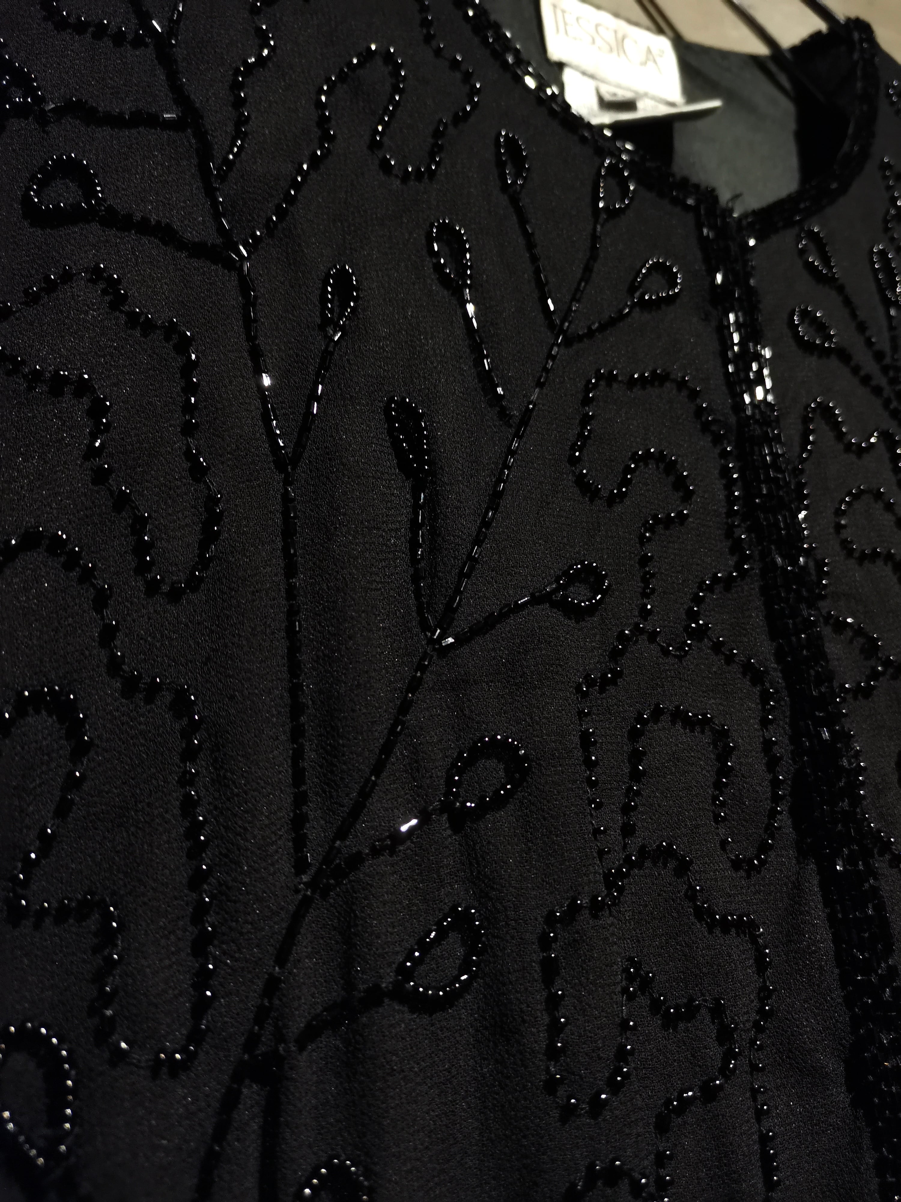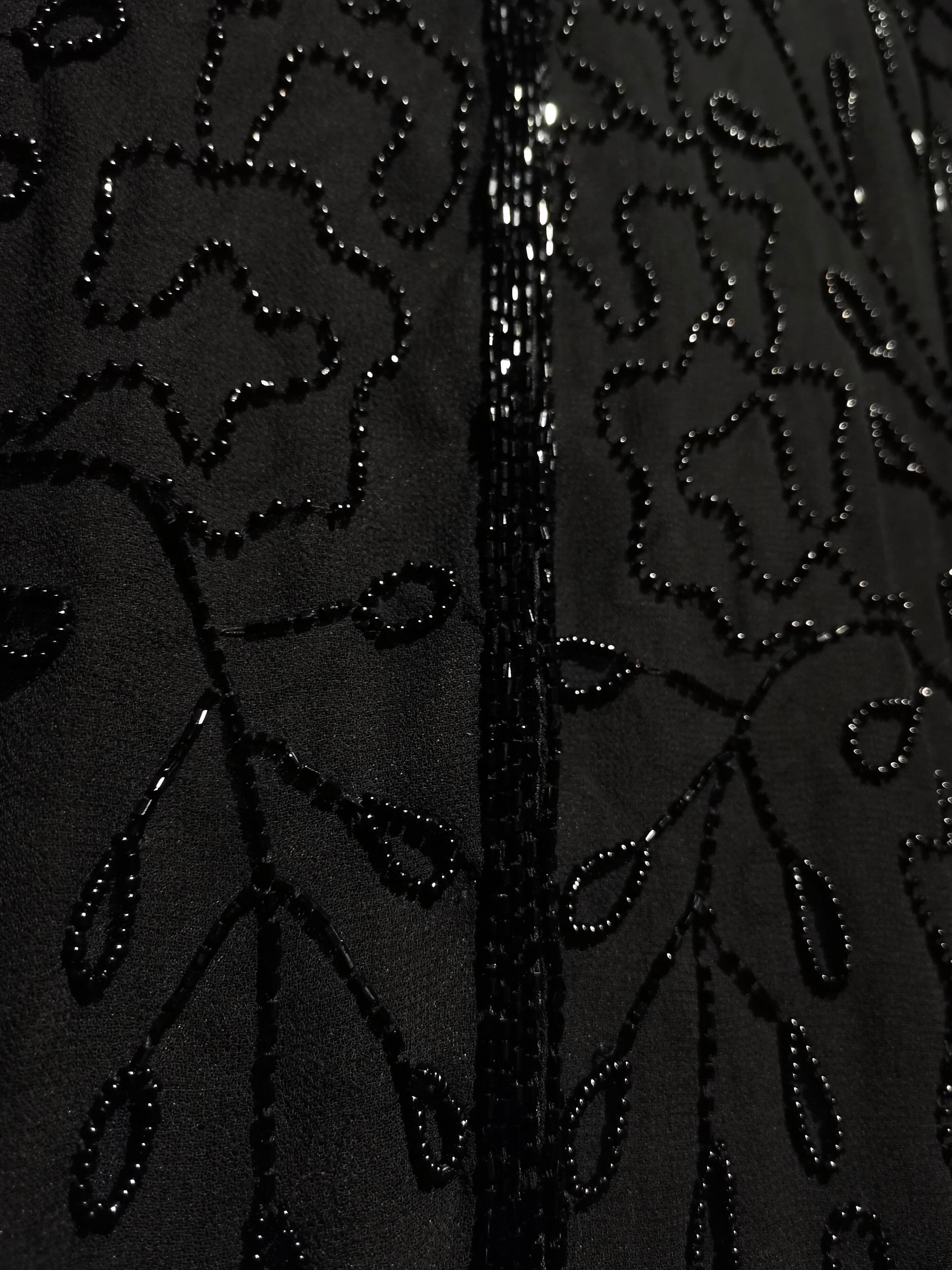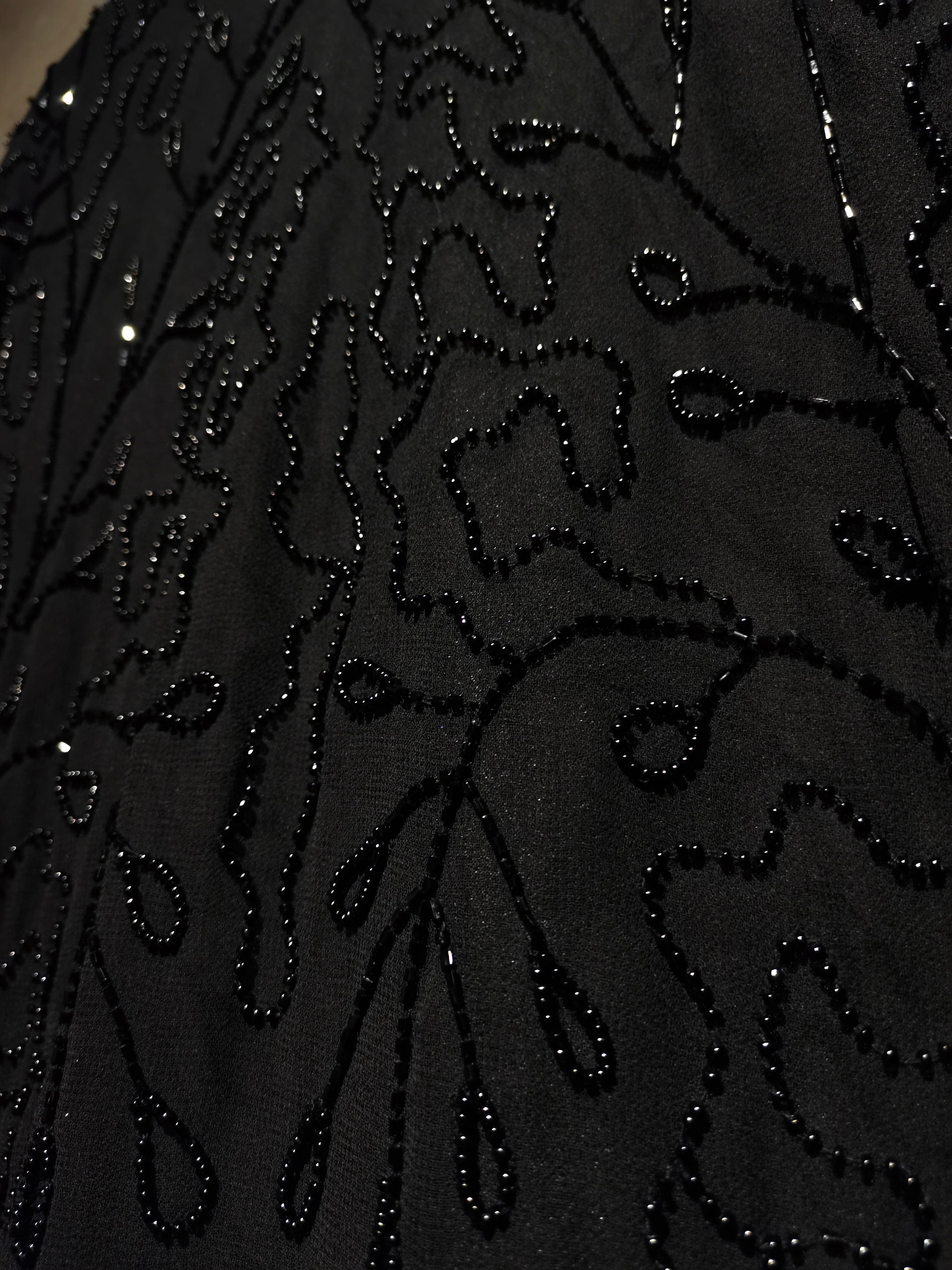 繊細に光沢を放つビーズがオールブラックのボディに非常に映え落ち着きながらもキラキラと存在感を発揮、モードな雰囲気を漂わせています。