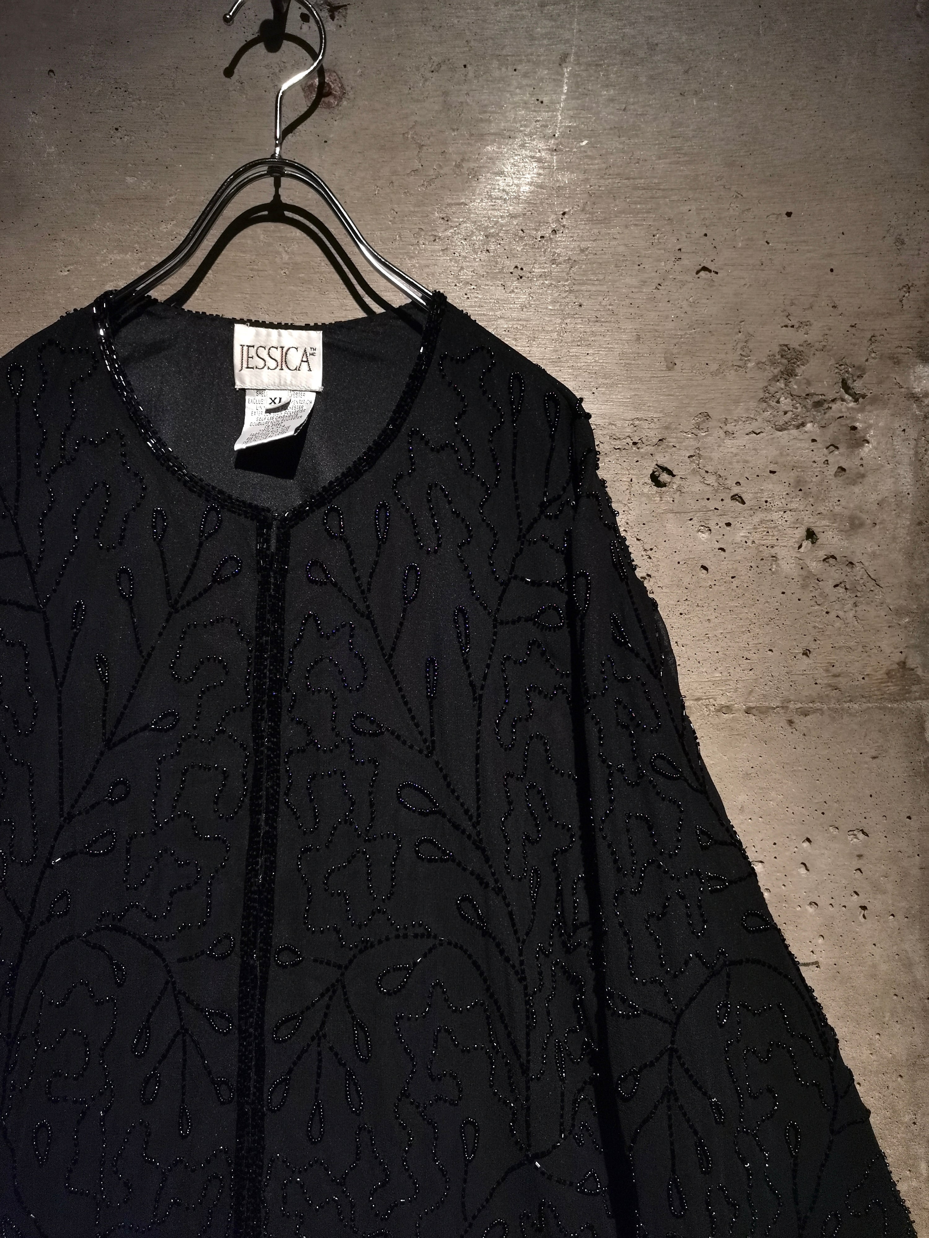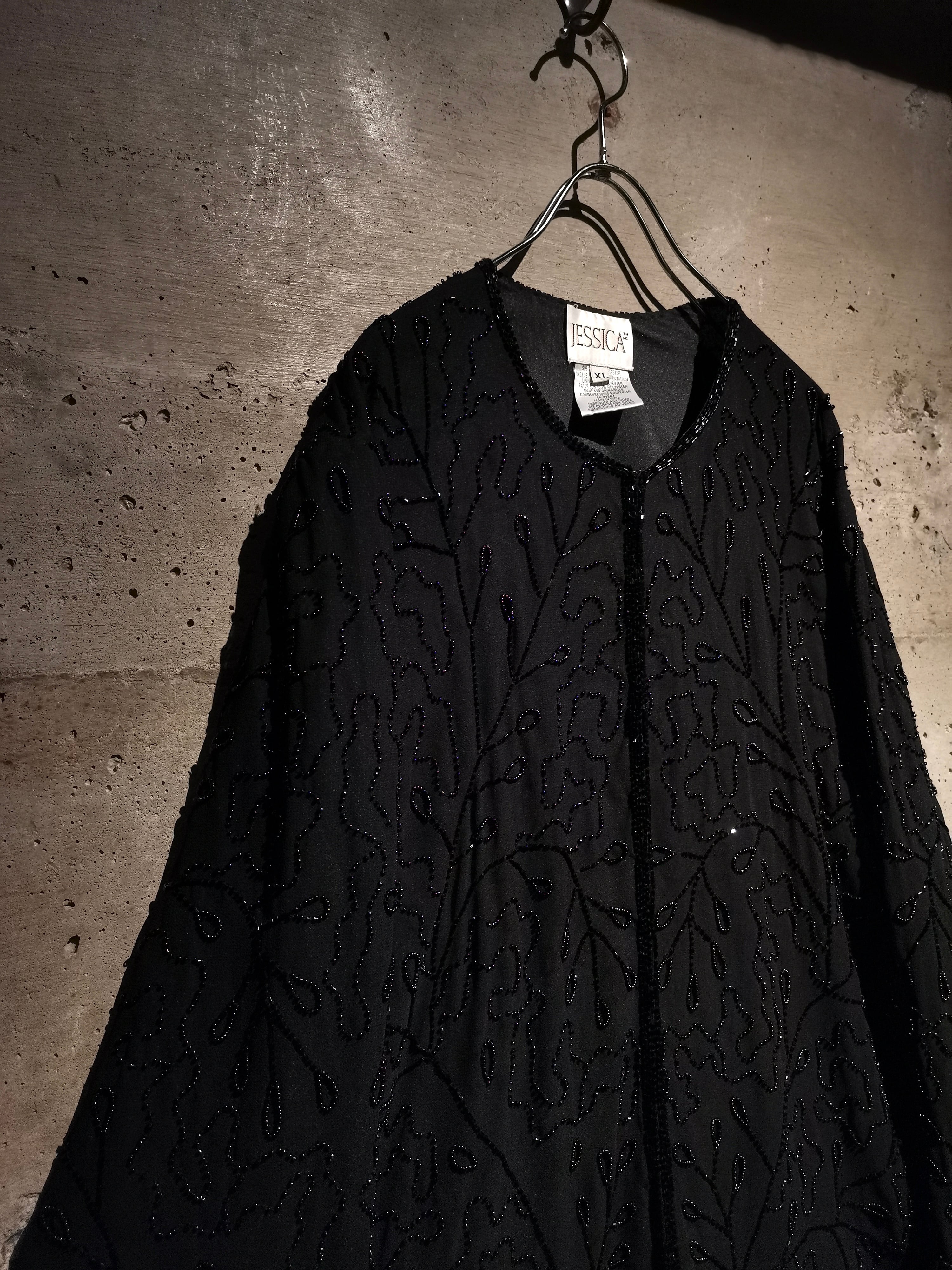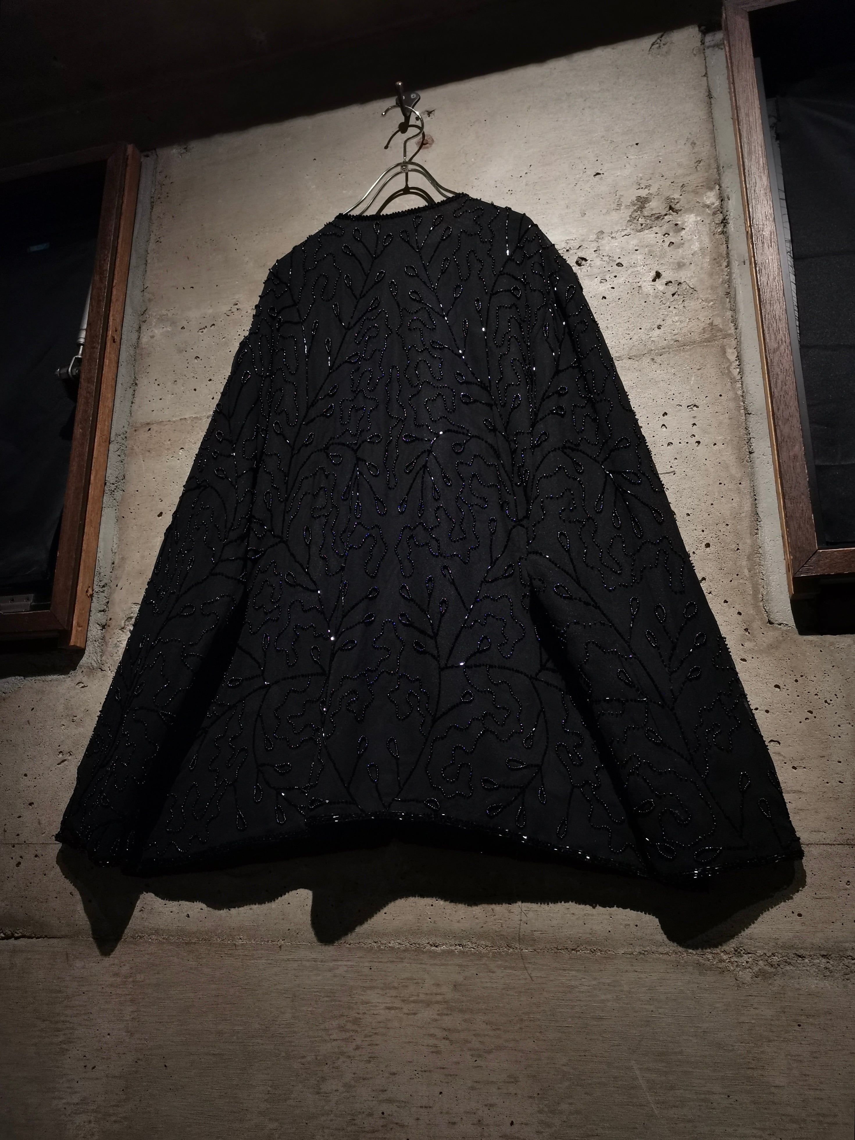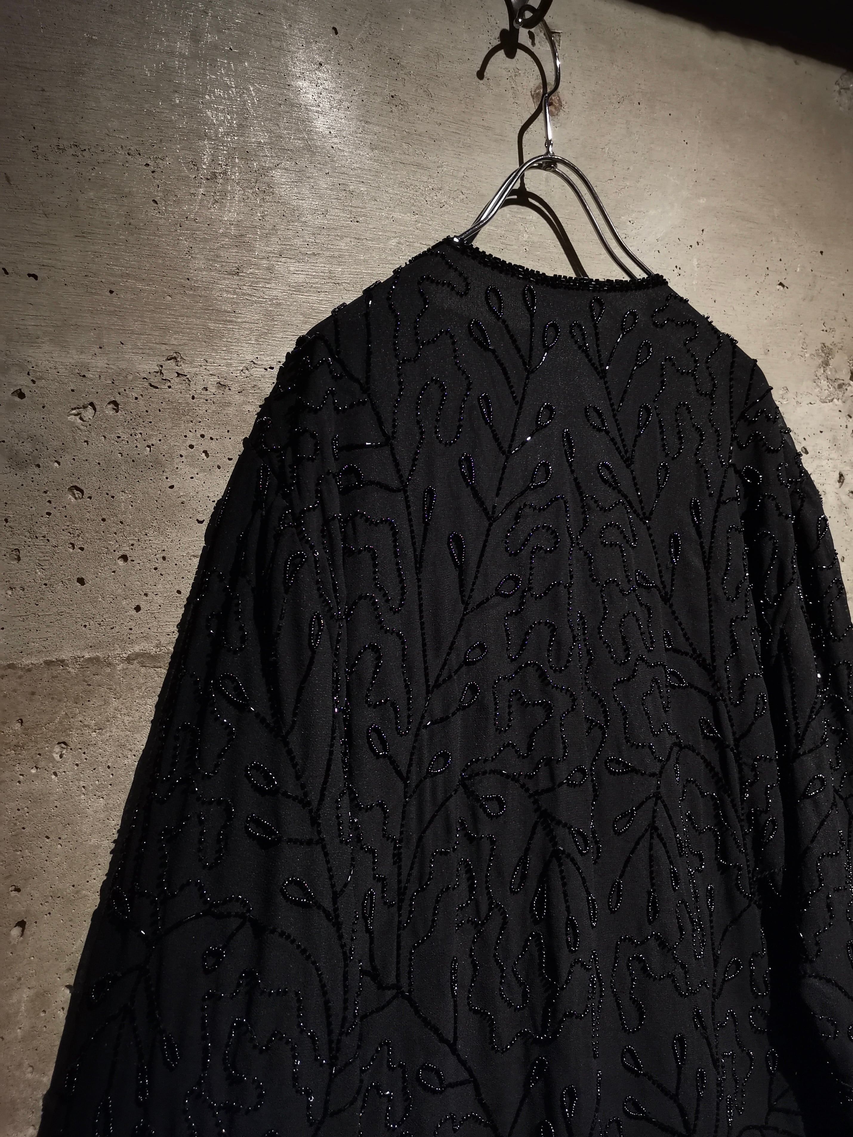 ブラックのボディをベースに、ビーズを用いた刺繍でボタニカル柄を全面に施したノーカラージャケット。