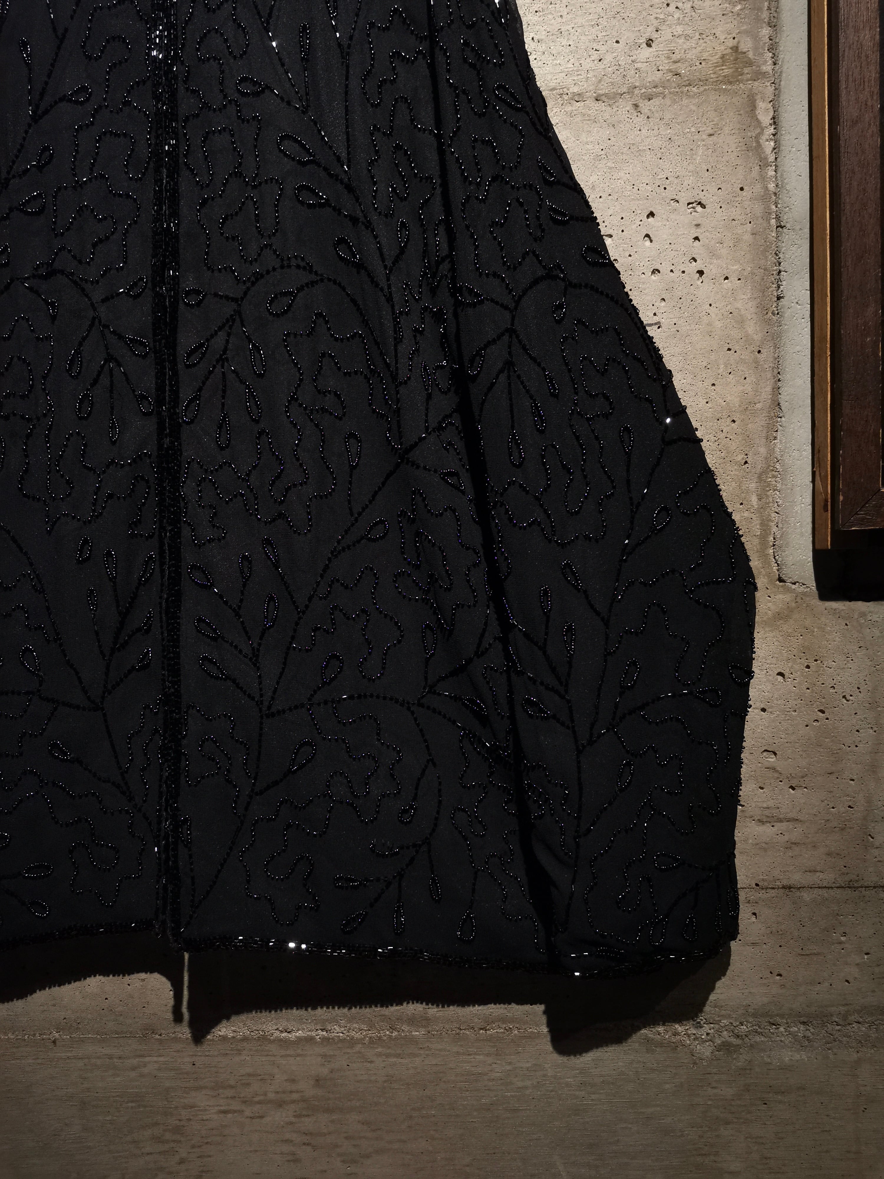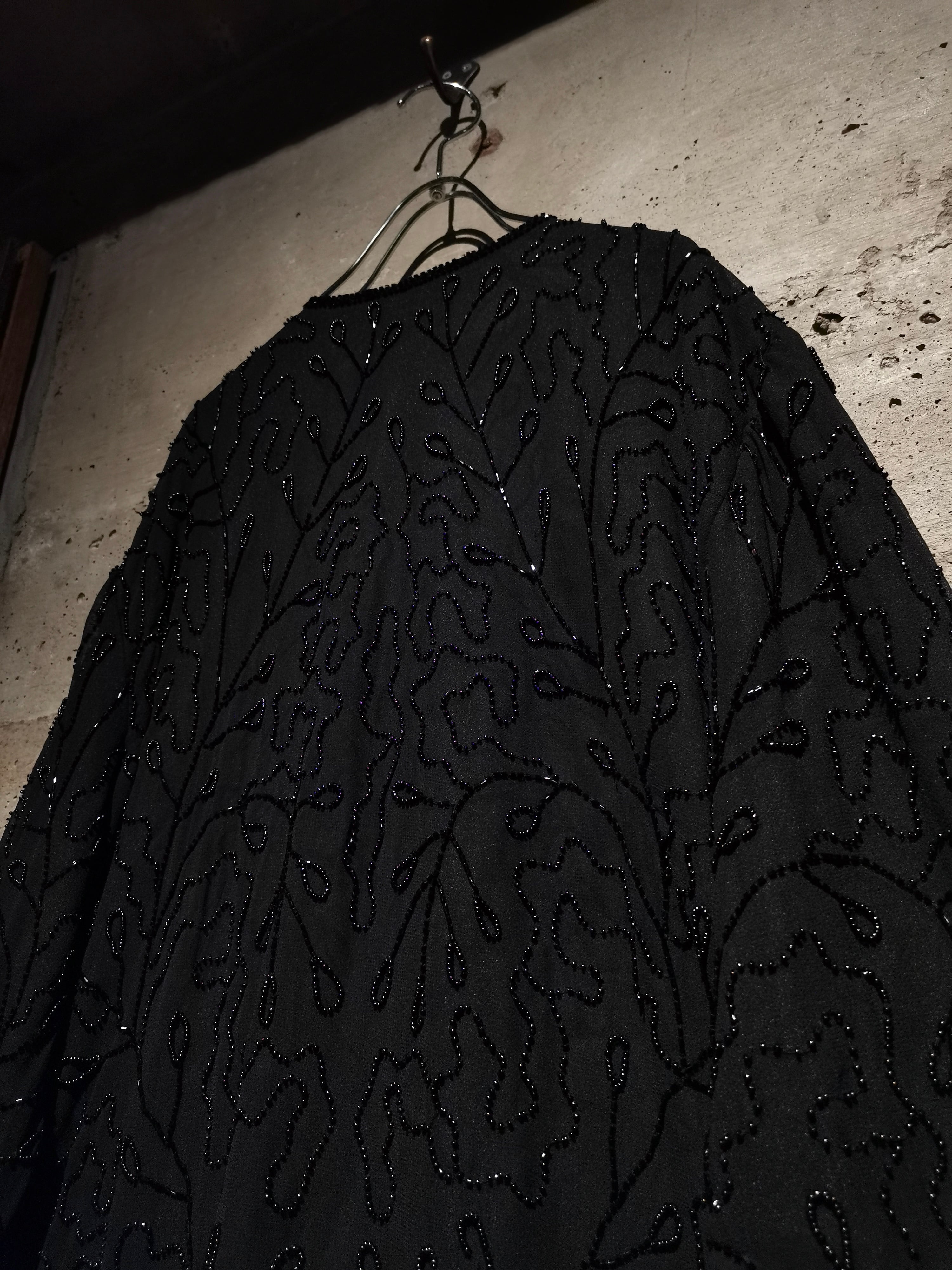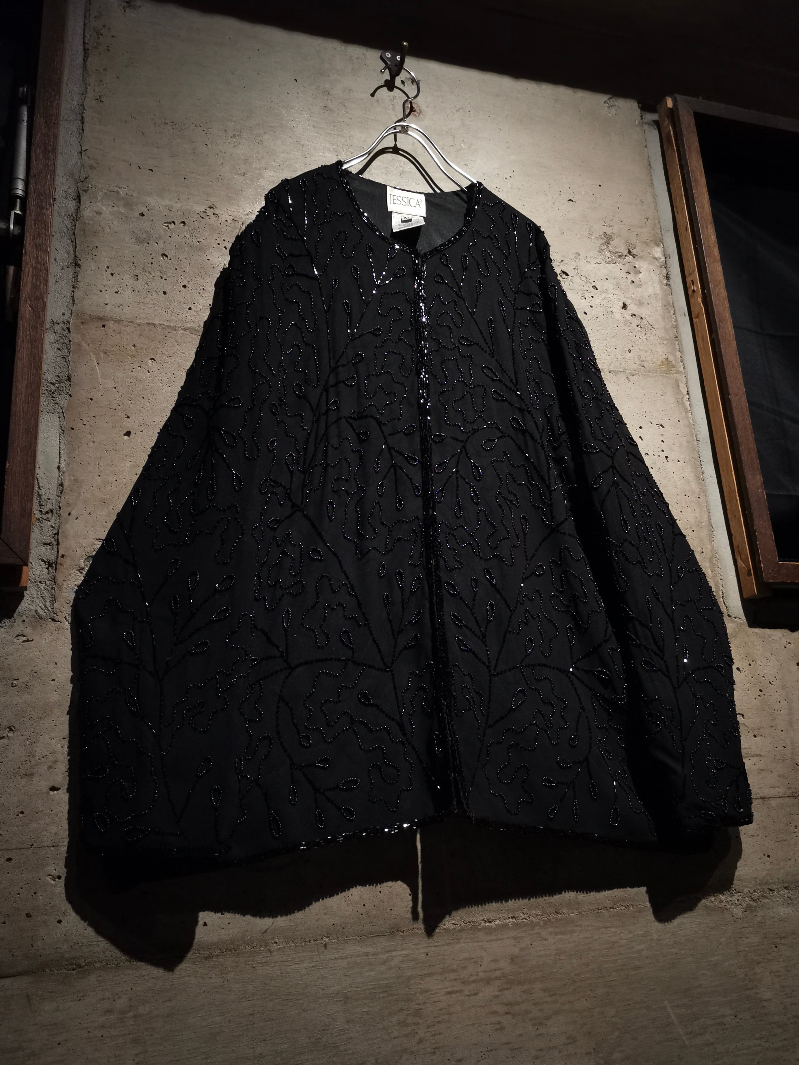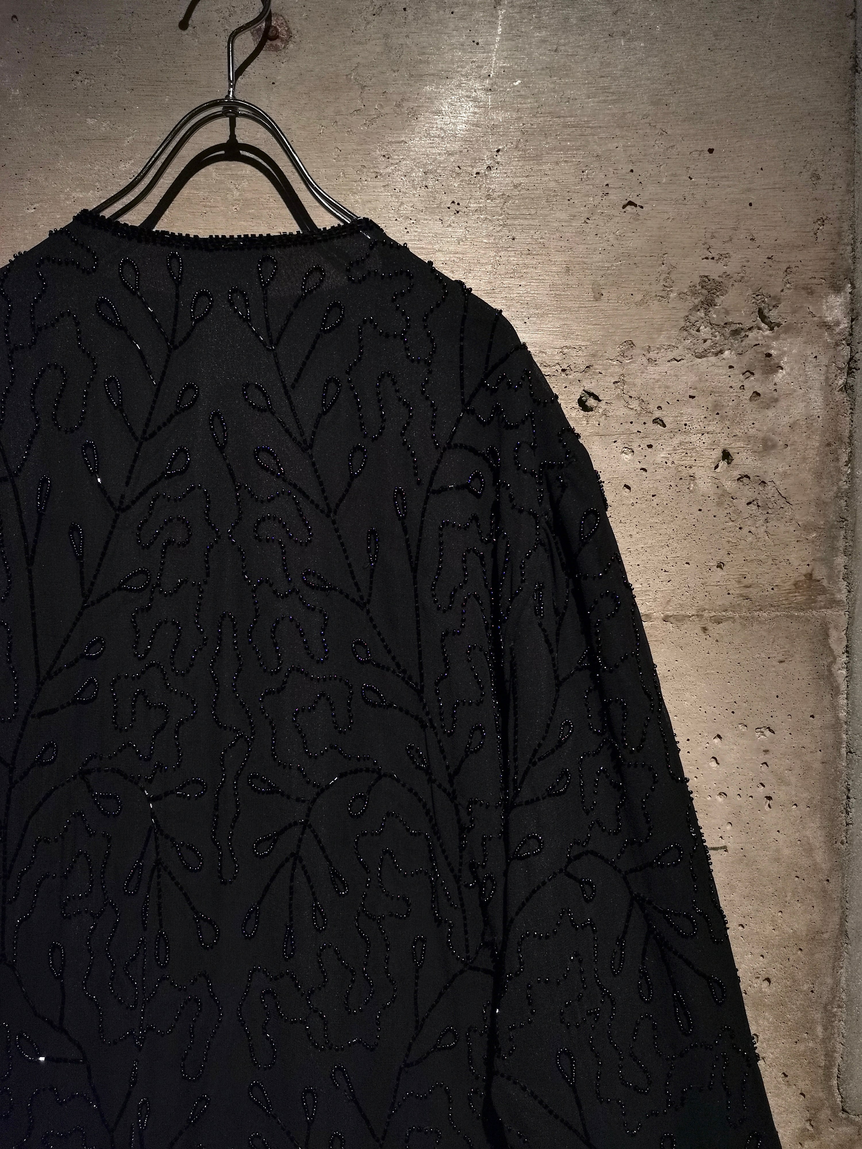 ブラックのボディをベースに、ビーズを用いた刺繍でボタニカル柄を全面に施したノーカラージャケット。