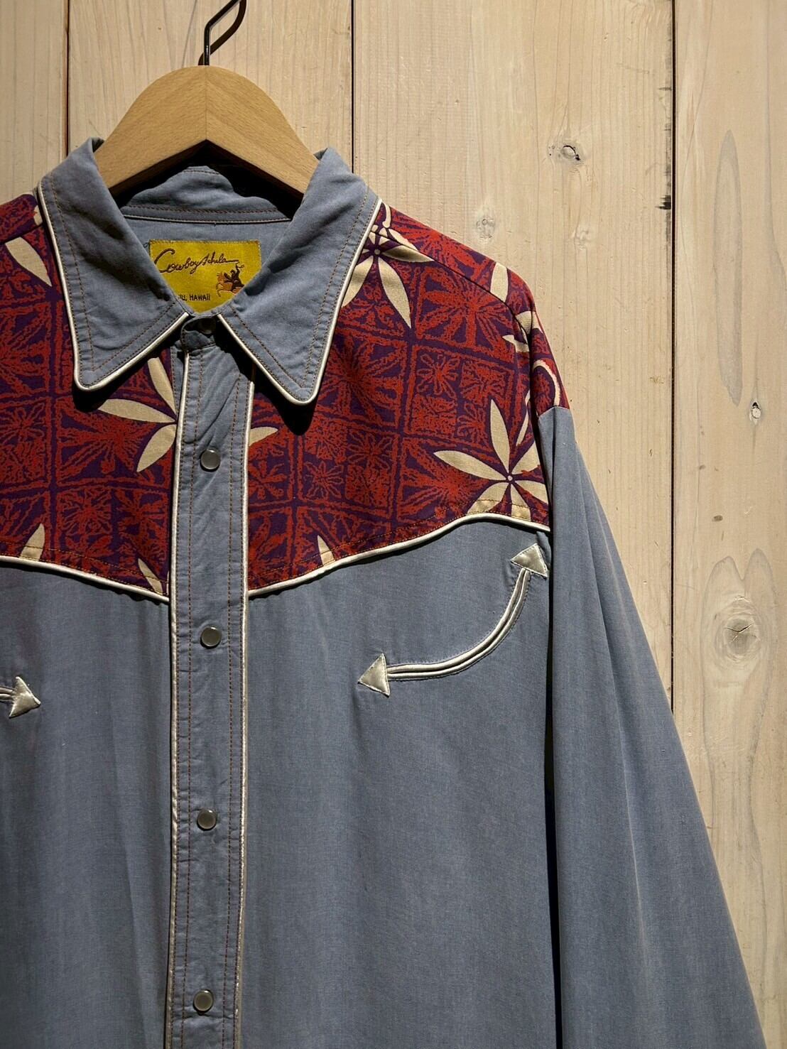青みがかったグレーのボディをベースに、ヨーク部分に花柄を切り替えたウエスタンシャツ。