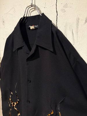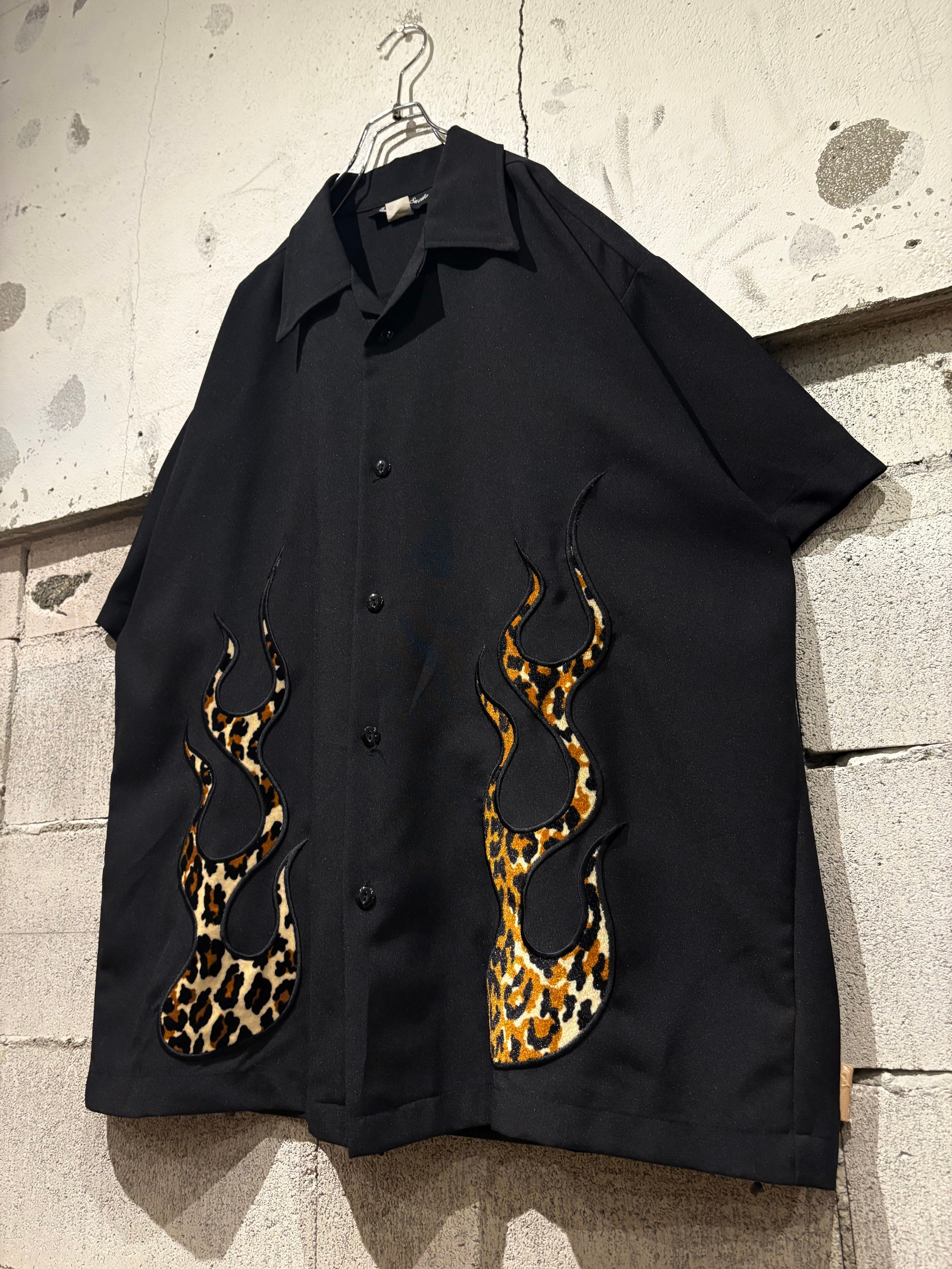 フロントにレオパード柄を組み込んだファイヤーパターンの刺繍を刻み込んだ半袖オープンカラーシャツ。