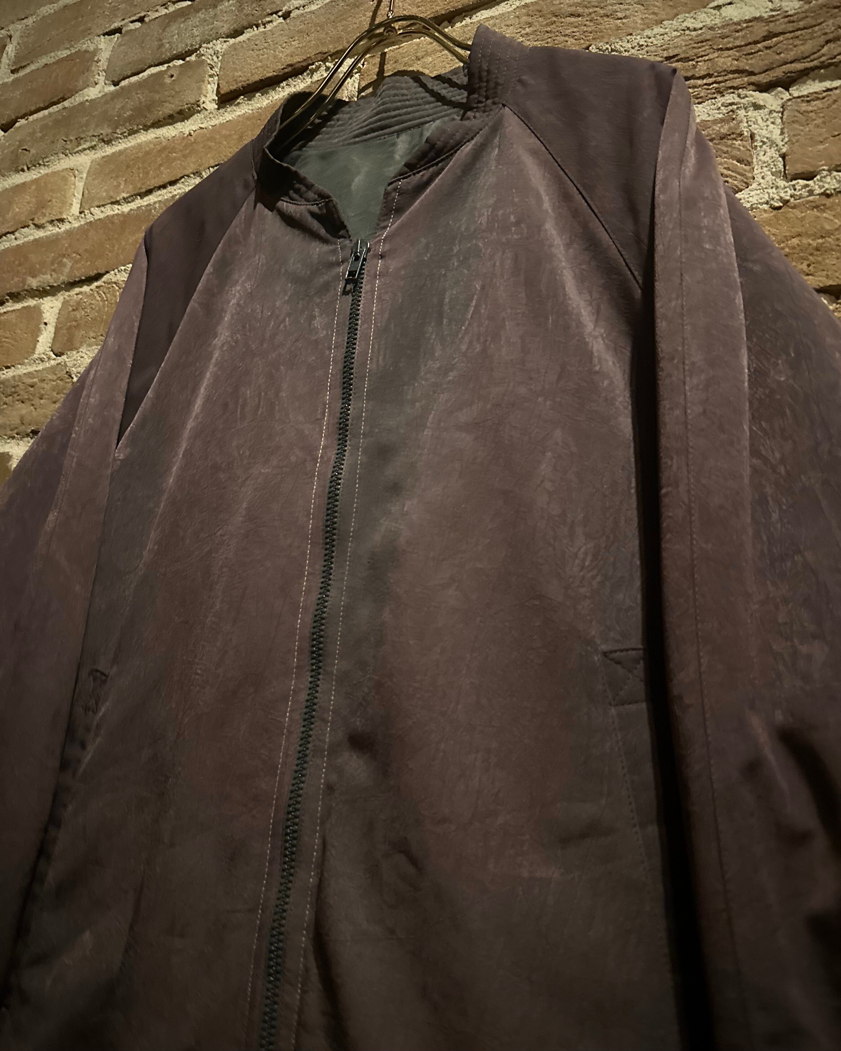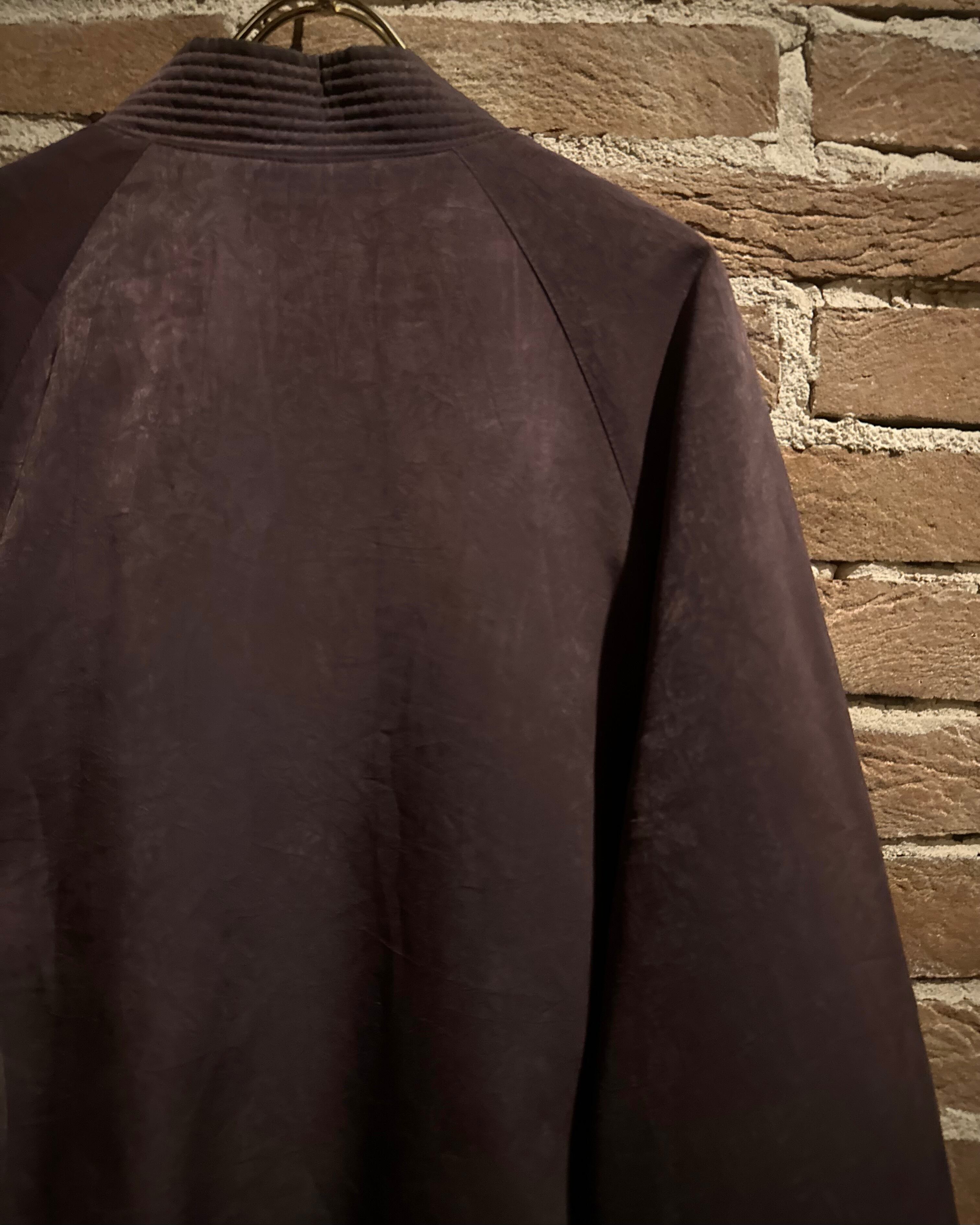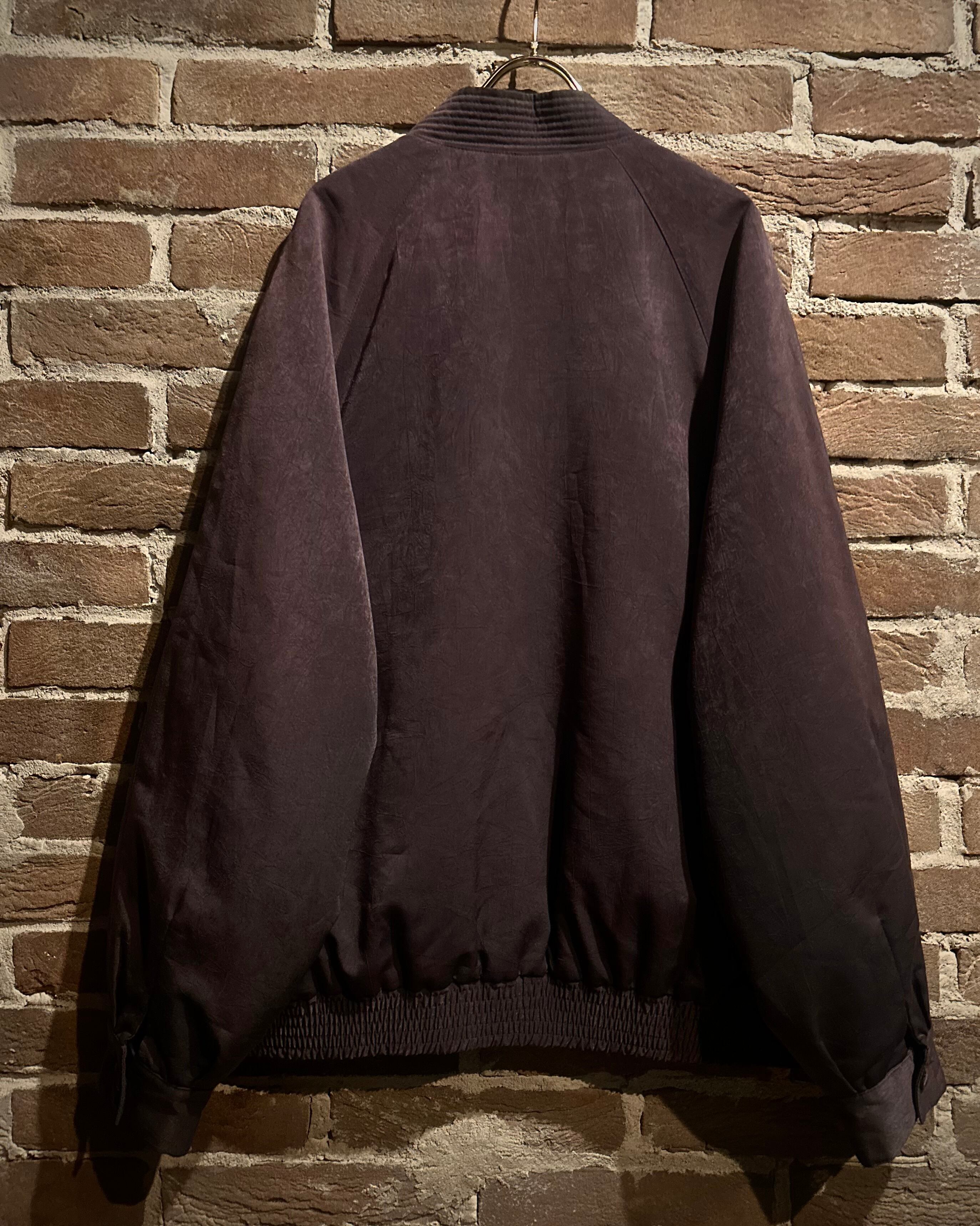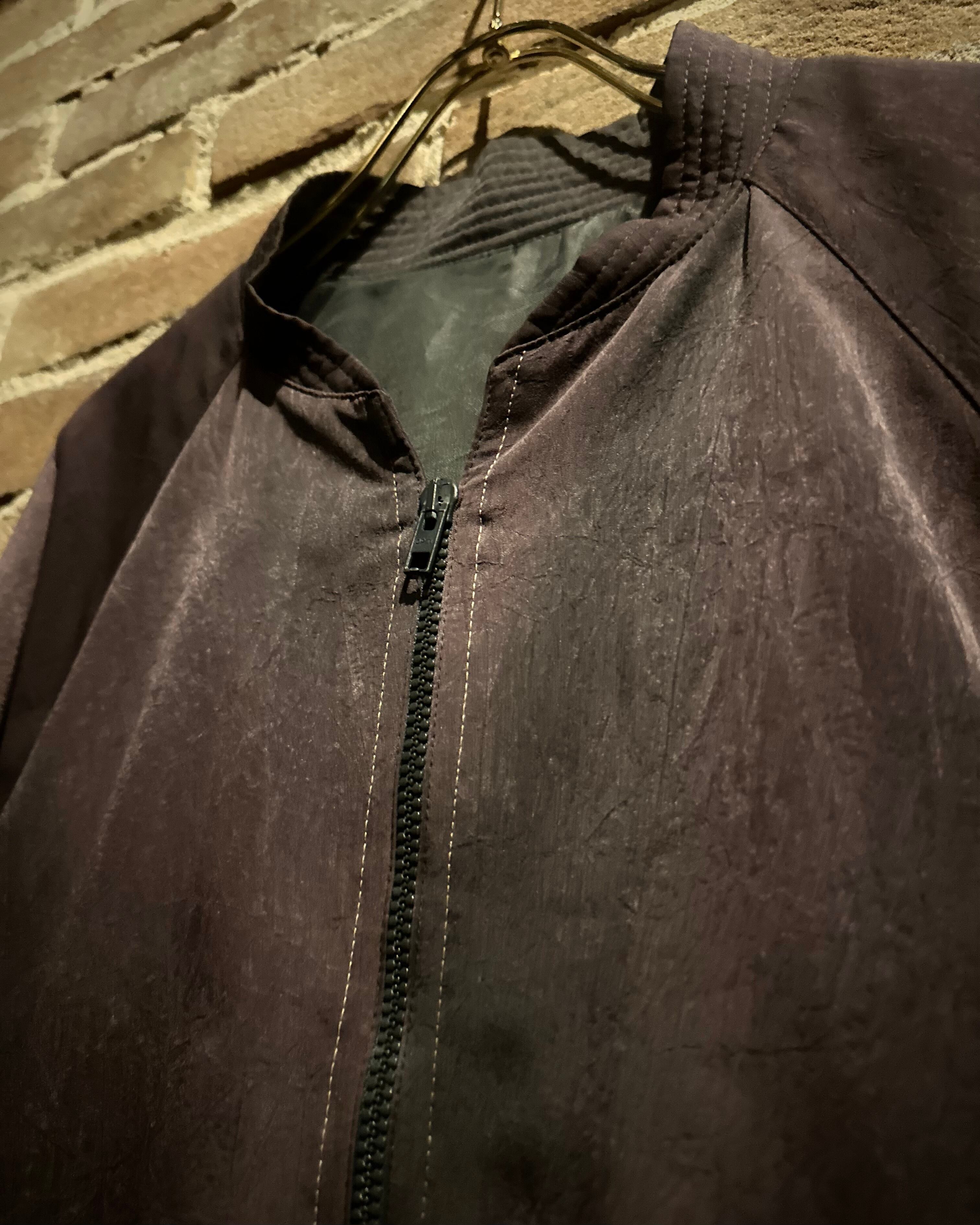 鈍い光沢を帯びたバーガンディーカラーのファブリックをボディに使用したユーロヴィンテージのブルゾンジャケット。