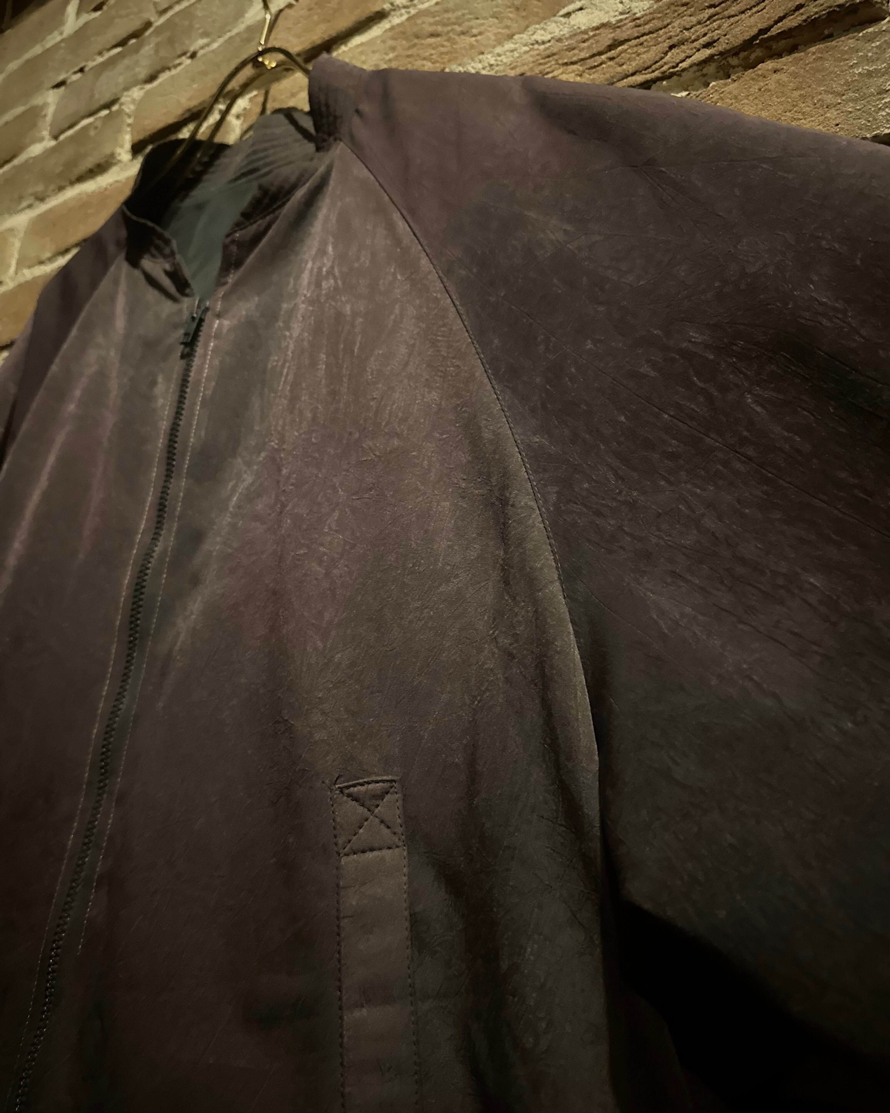 身幅は広く、裾にキュッと絞りを効かせたブルゾンならではの丸みを帯びた短丈なシルエットも◎ラグランスリーブの袖造りで、滑らかなボディの質感も相まって肩からの落ち感も良く、着用時のフォルムも完璧です。