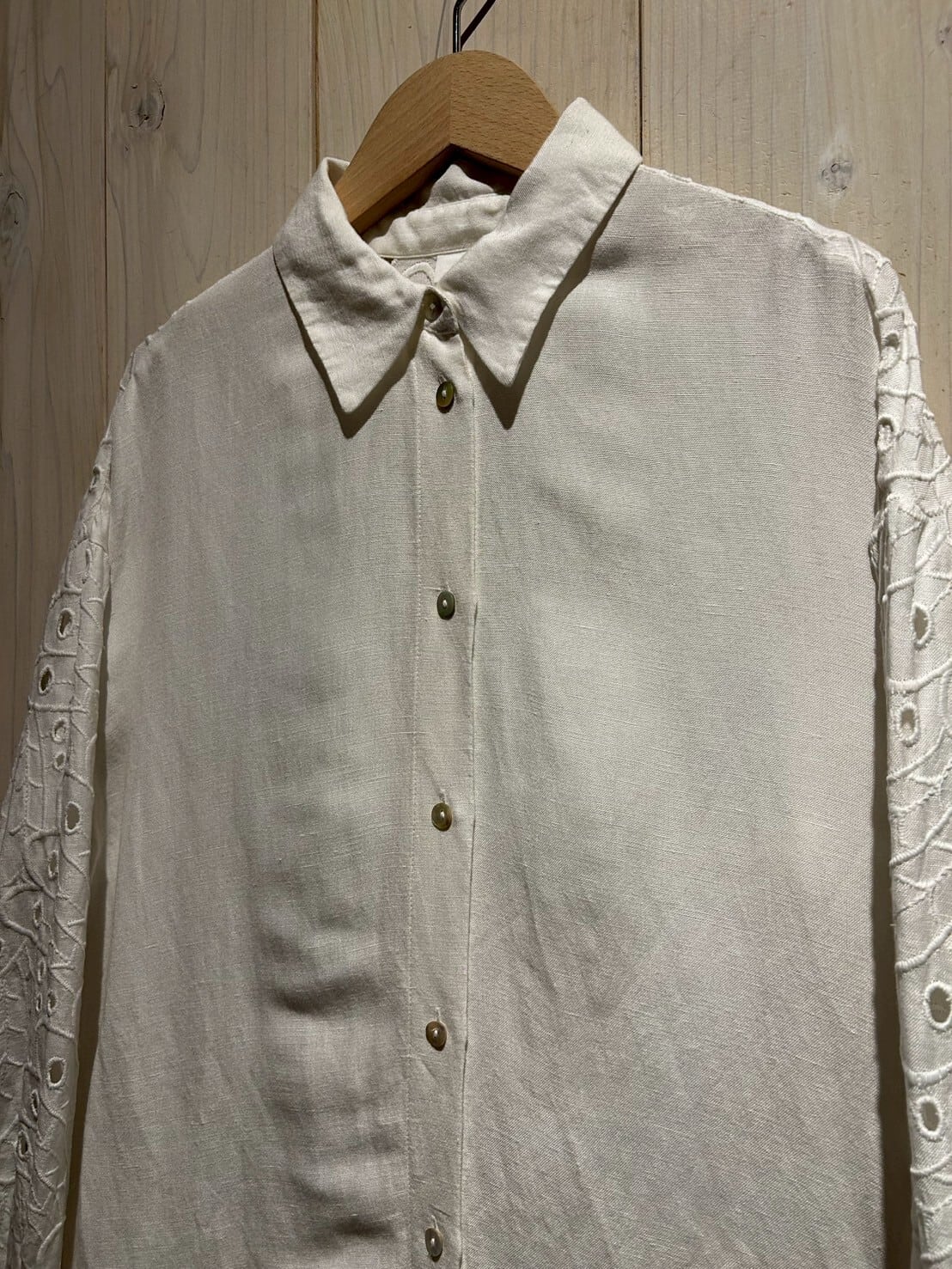 柔らかなホワイトのボディをベースに、アーム、背面ヨークに羽の刺繍を刻み、円形に生地をくり抜いた長袖シャツ。
