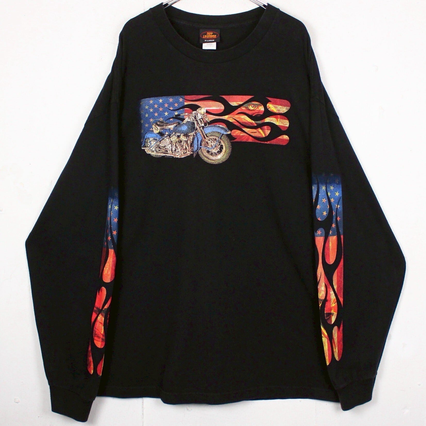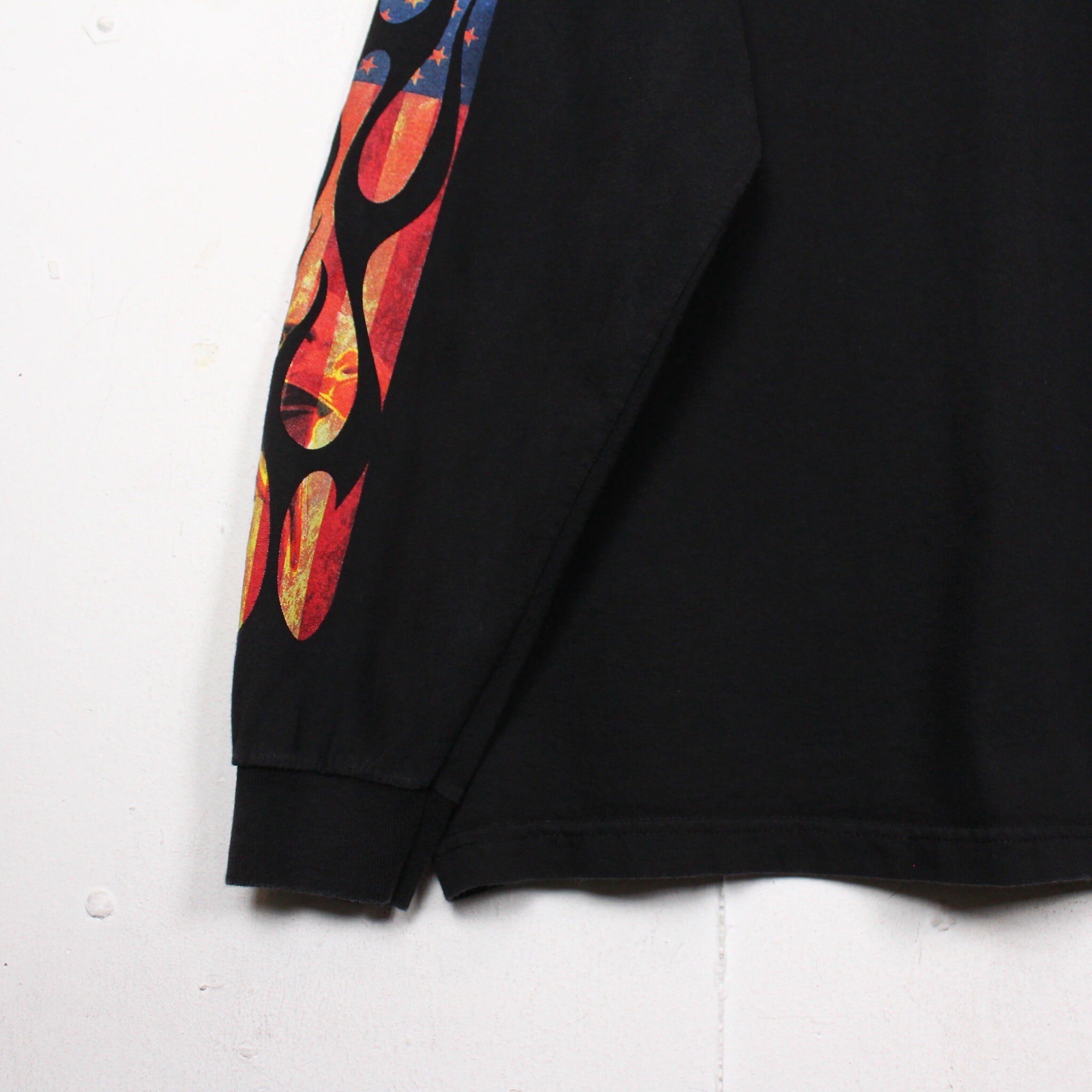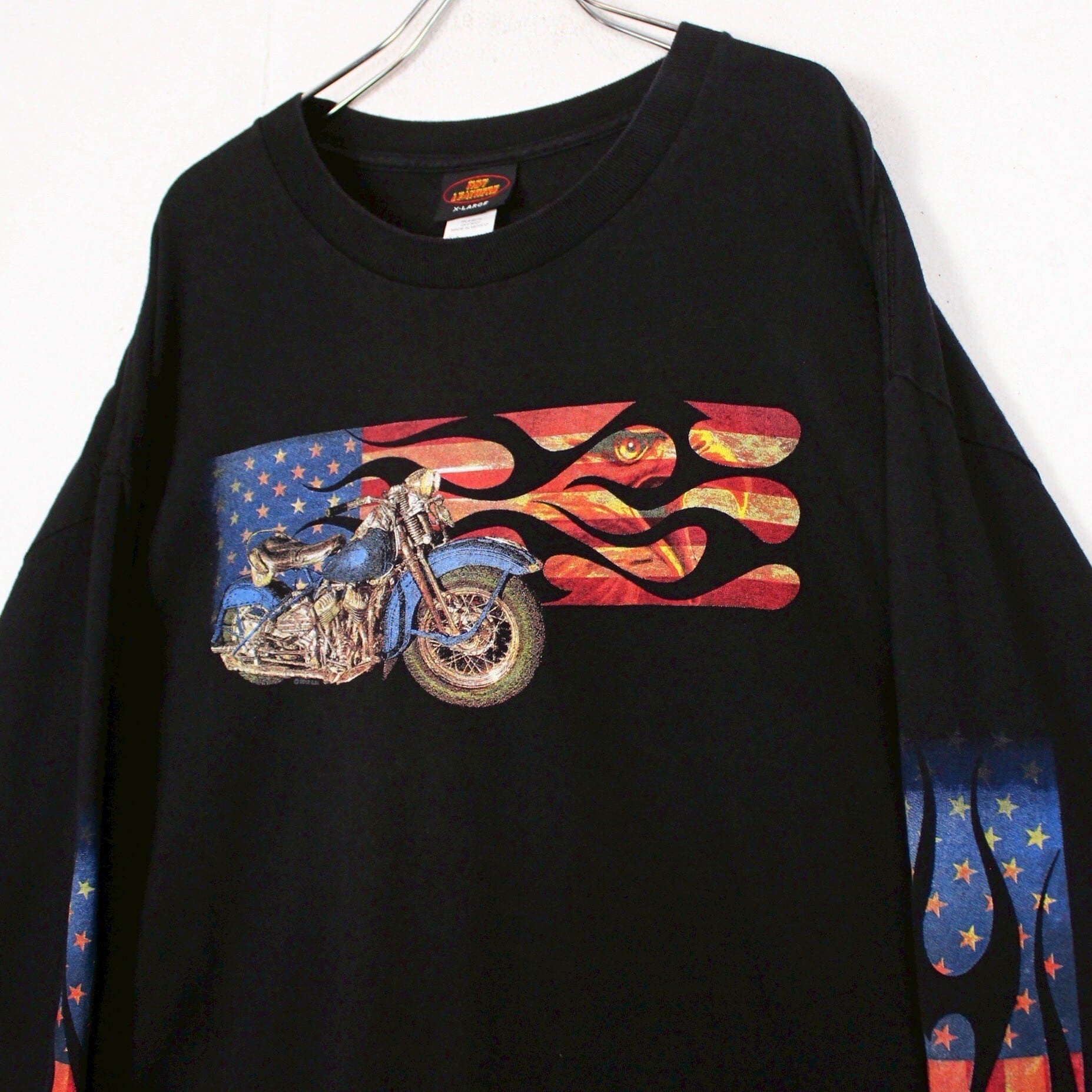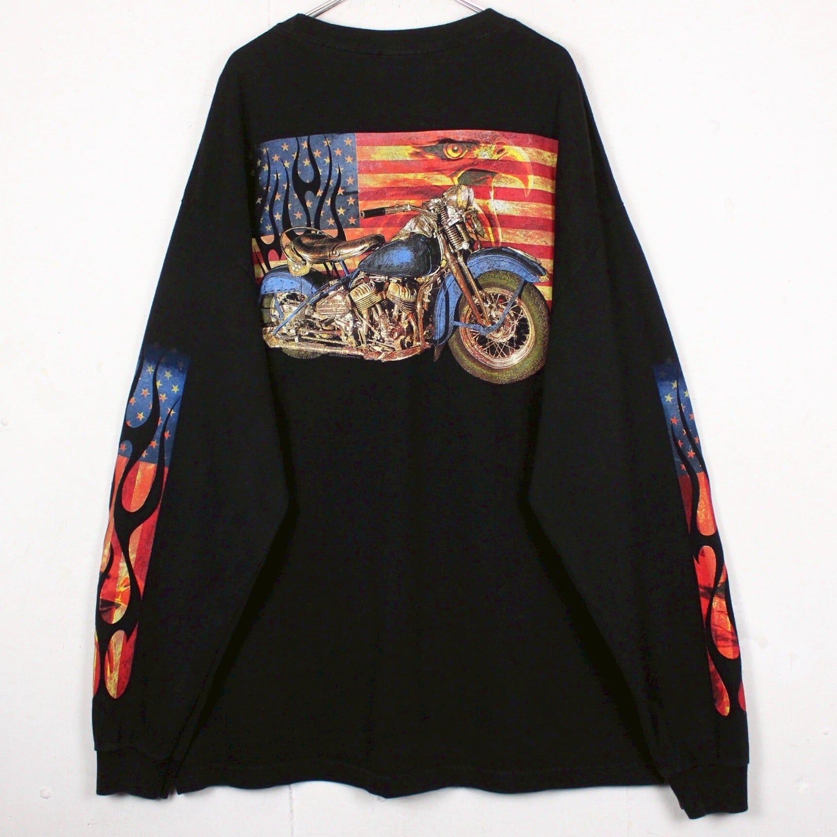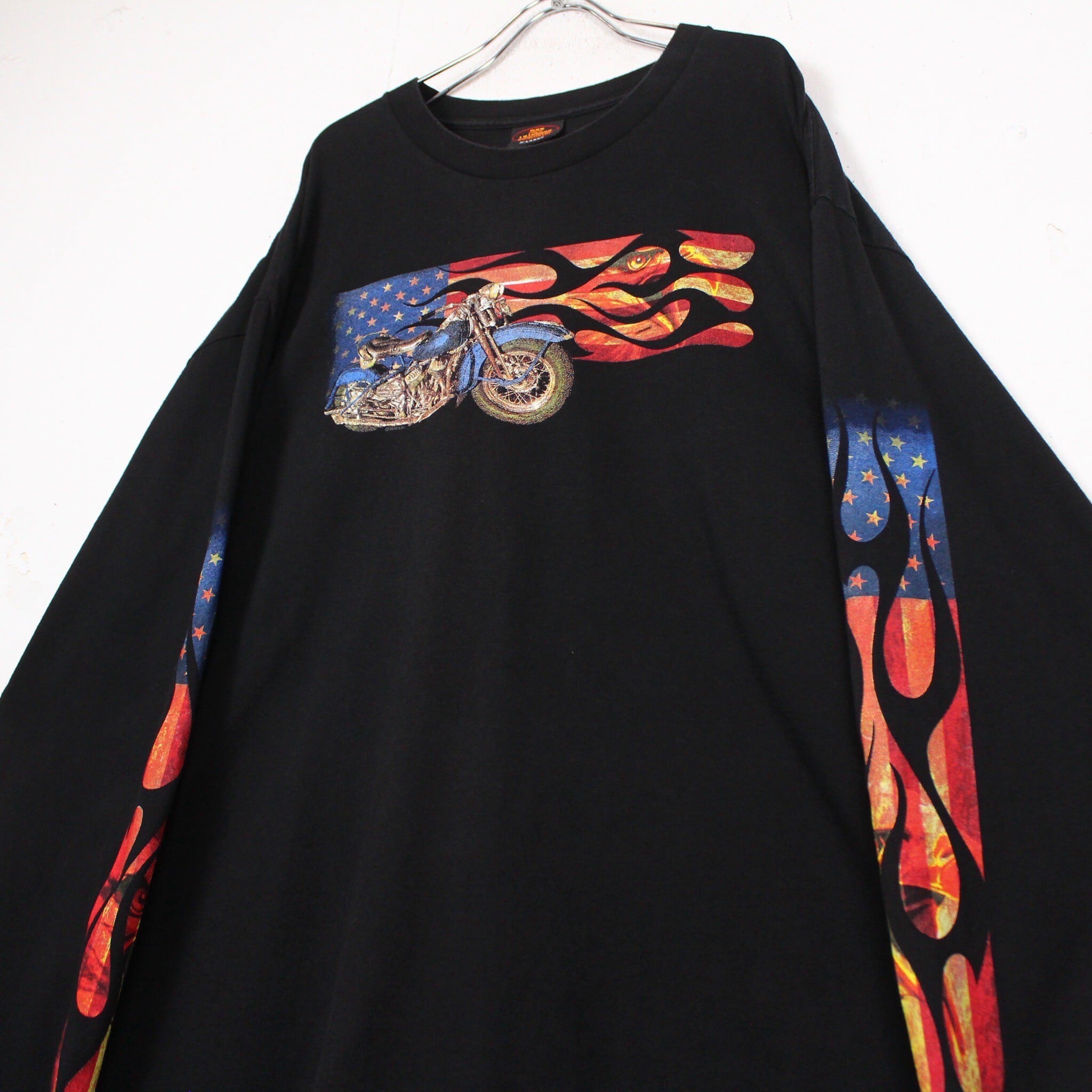 ブラックのボディにファイヤーパターンのアメリカ国旗やアメリカンバイク、ハクトウワシをプリントしたロンティー。