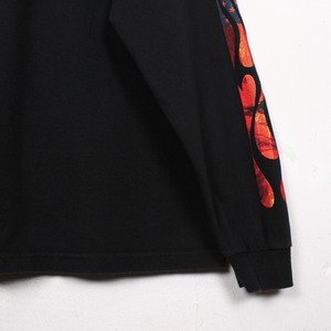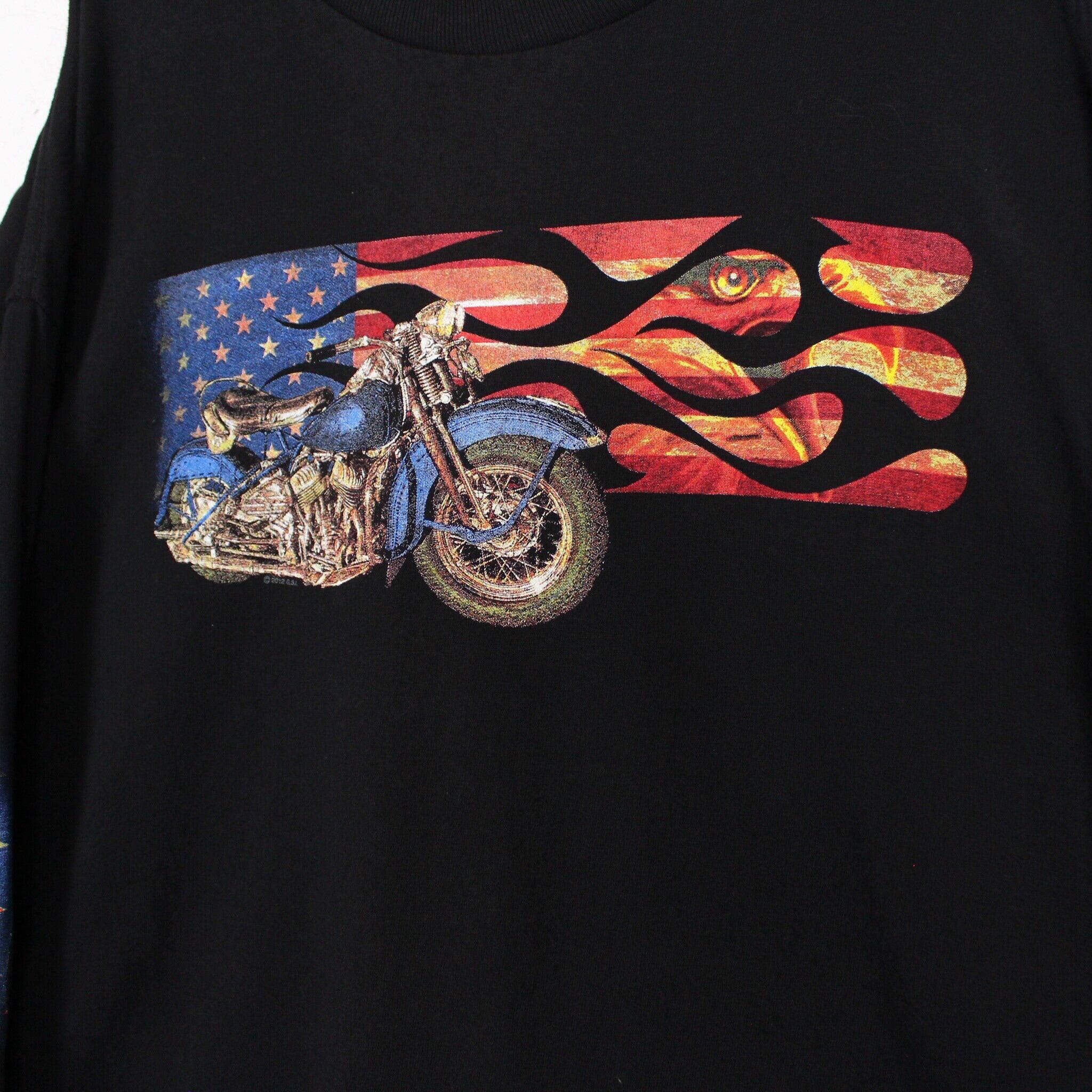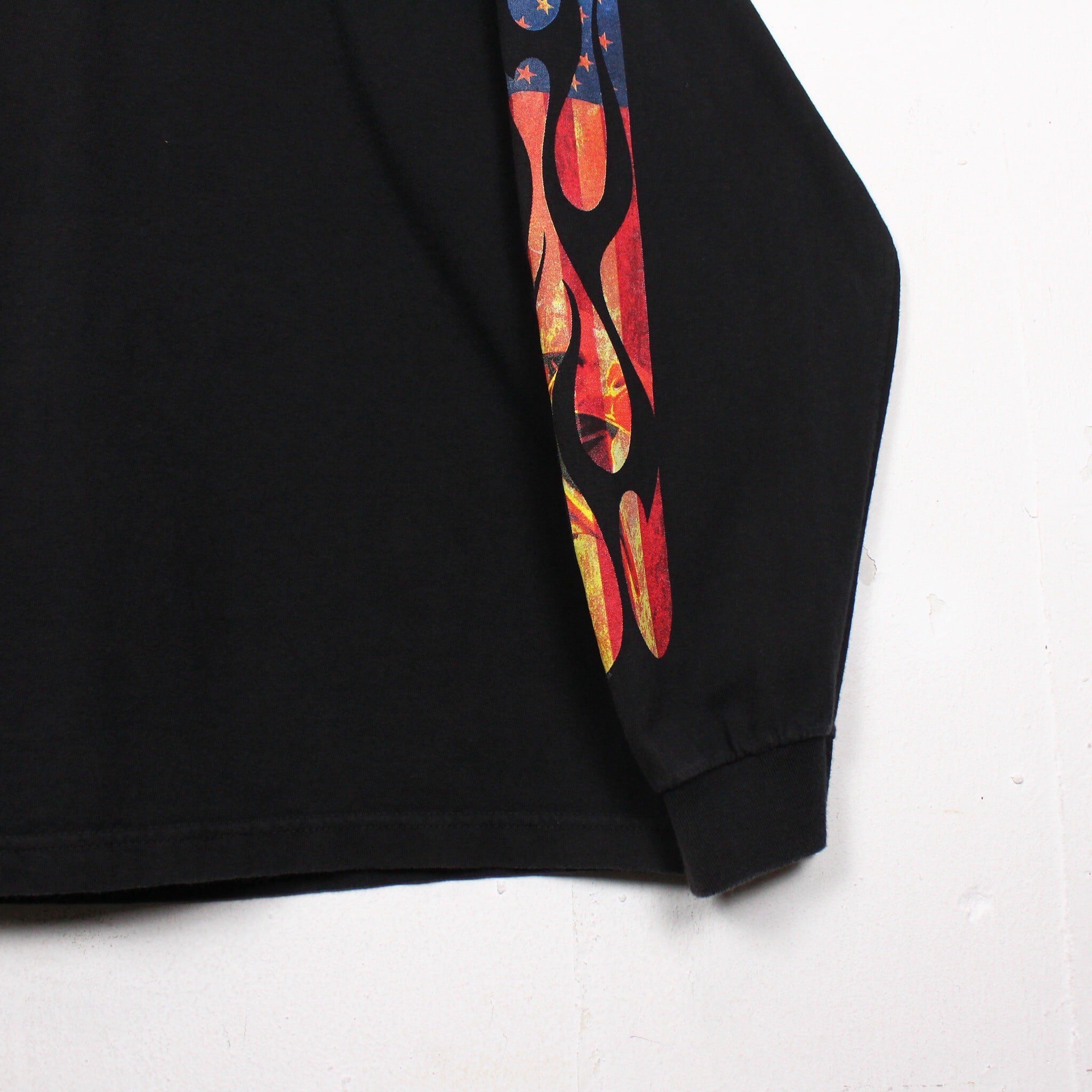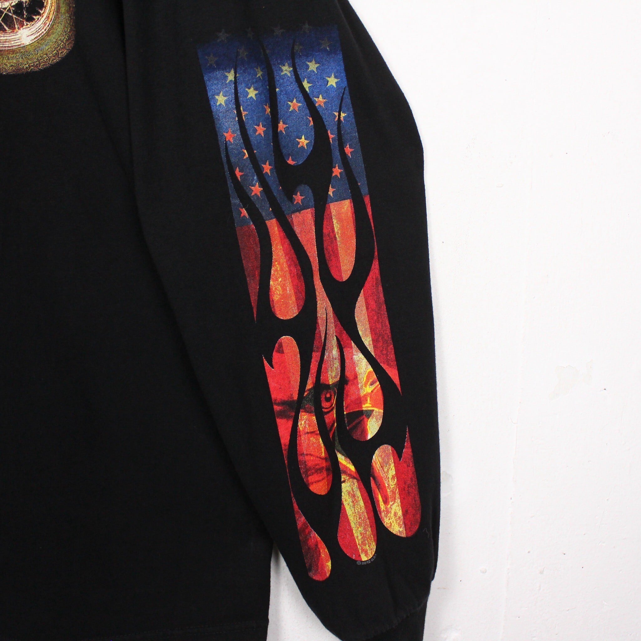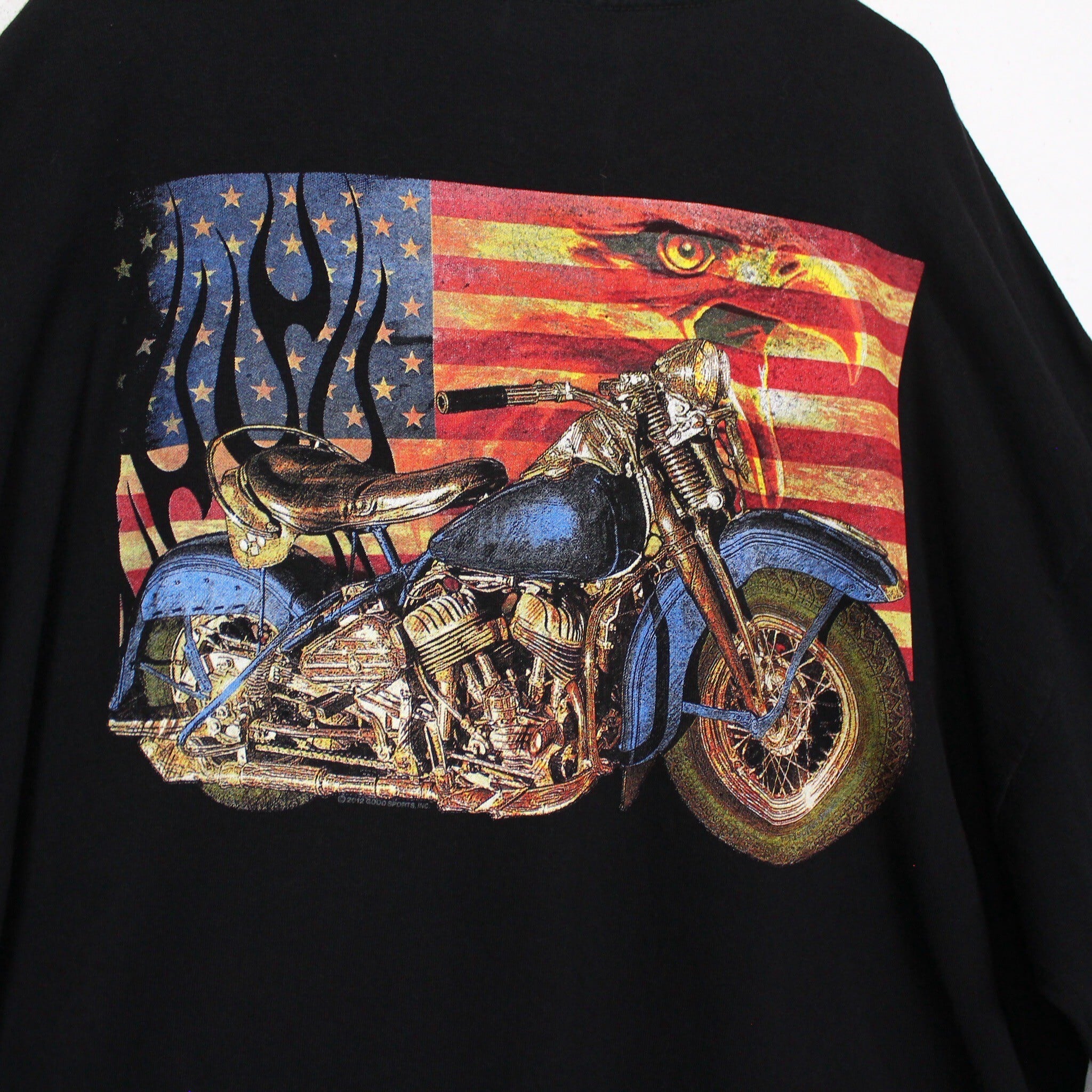ブラックのボディにファイヤーパターンのアメリカ国旗やアメリカンバイク、ハクトウワシをプリントしたロンティー。