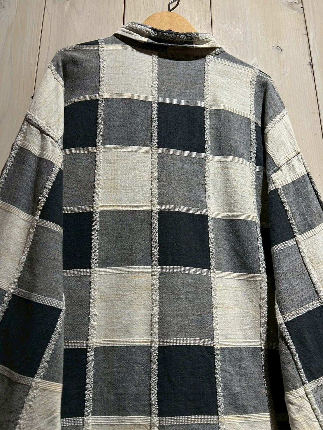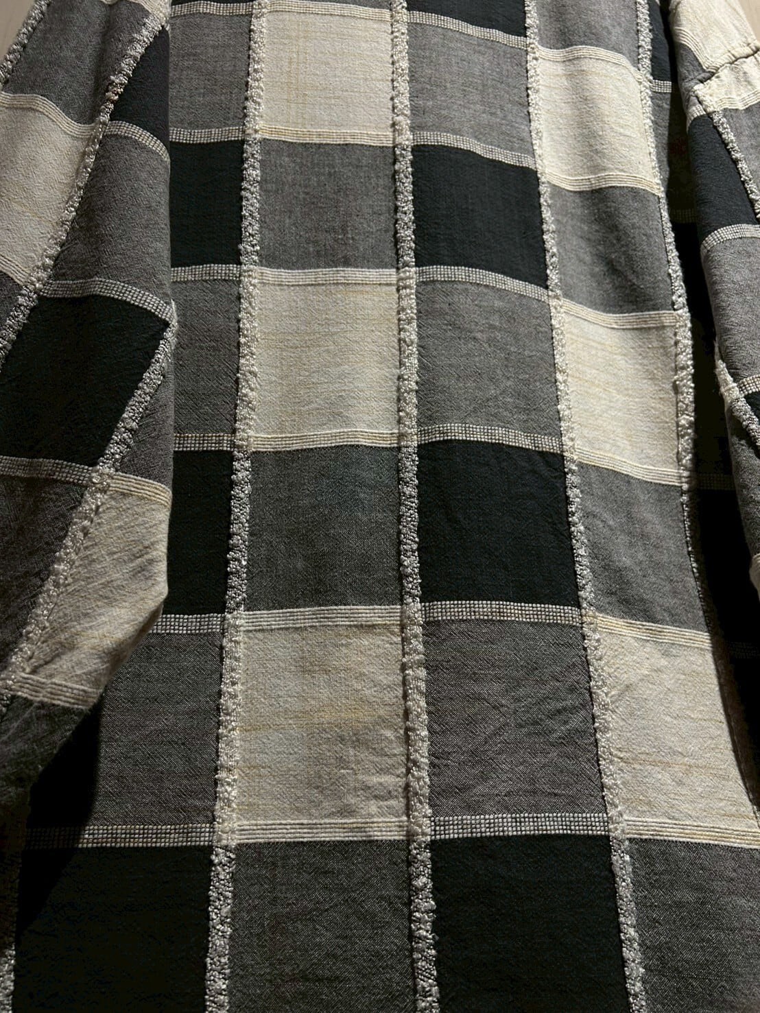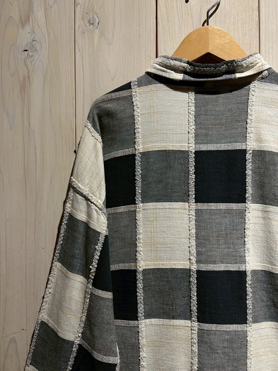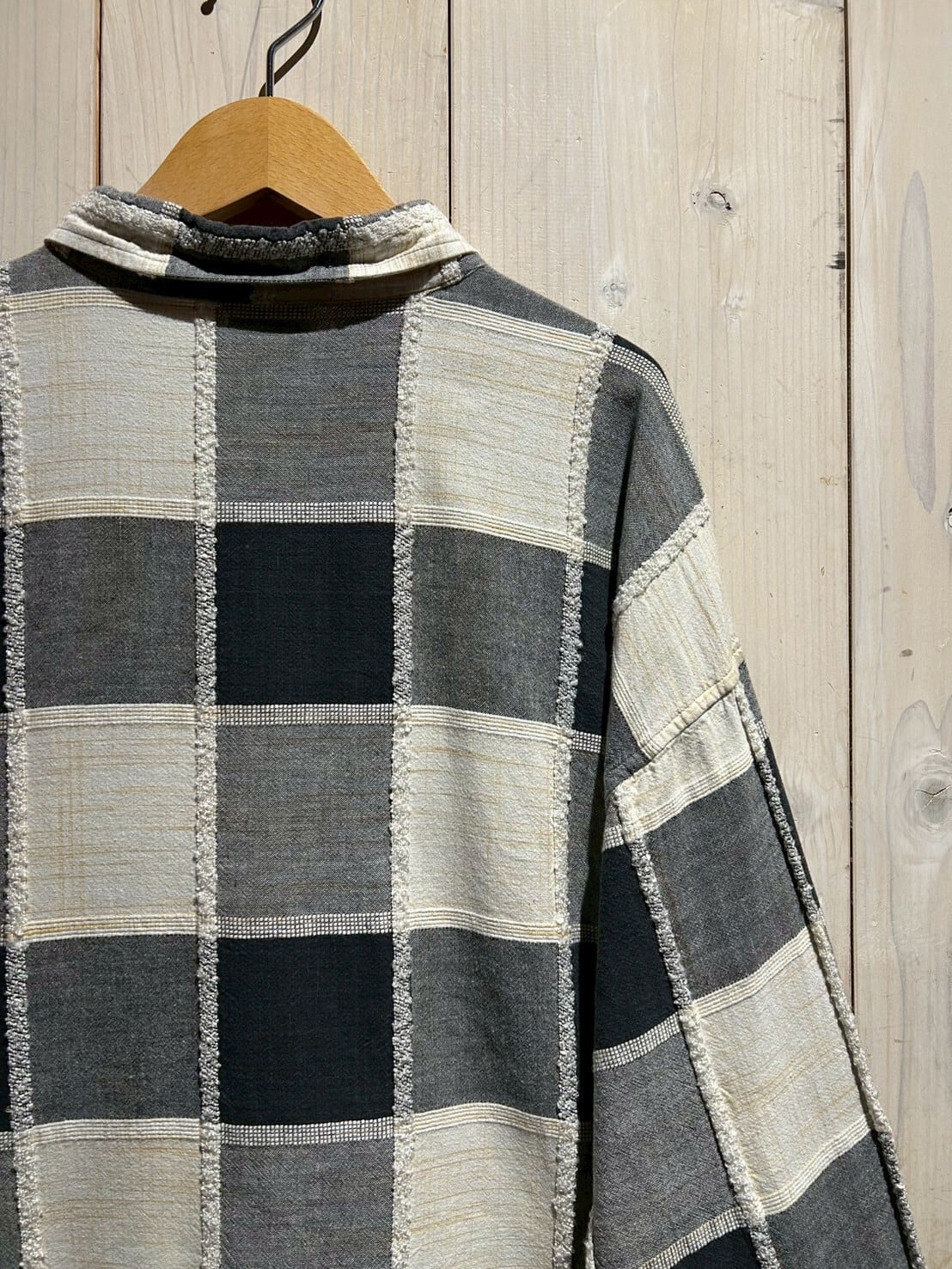 チェック柄縦列の切り替え部分にはシェニールのようにフワッとした加工が施されており立体感を演出。落ち着いた色味ですが、存在感を放つ1着へと仕上がっています。