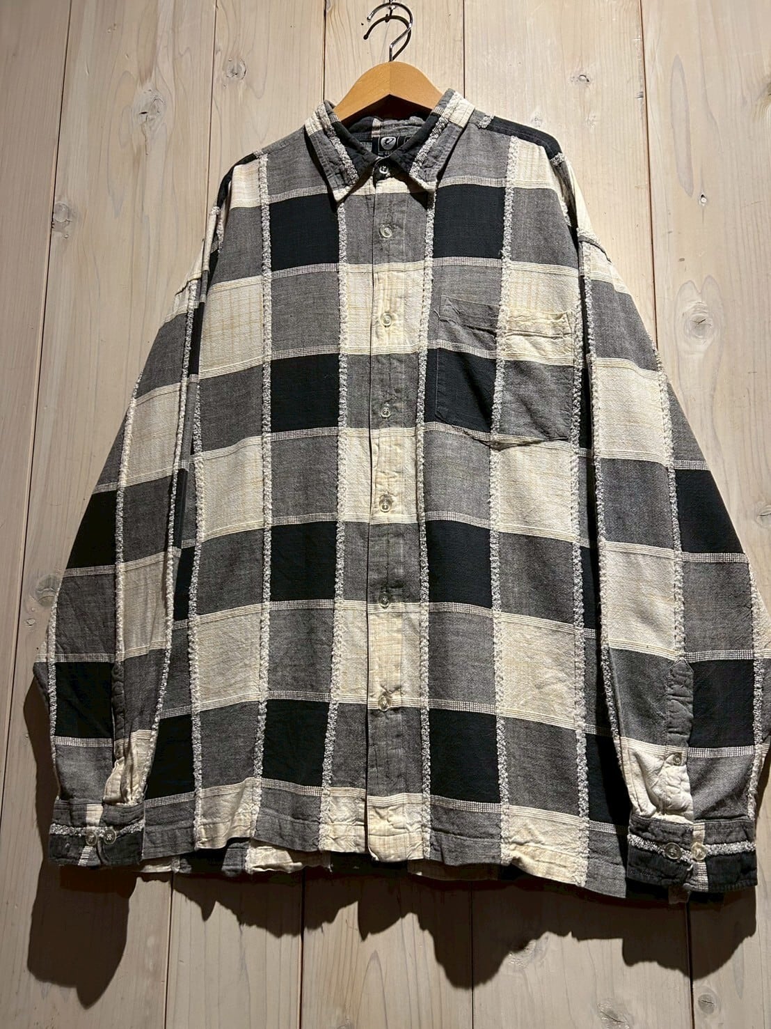 黒、グレー、オフホワイトのカラーリングでチェック柄を載せた長袖シャツ。