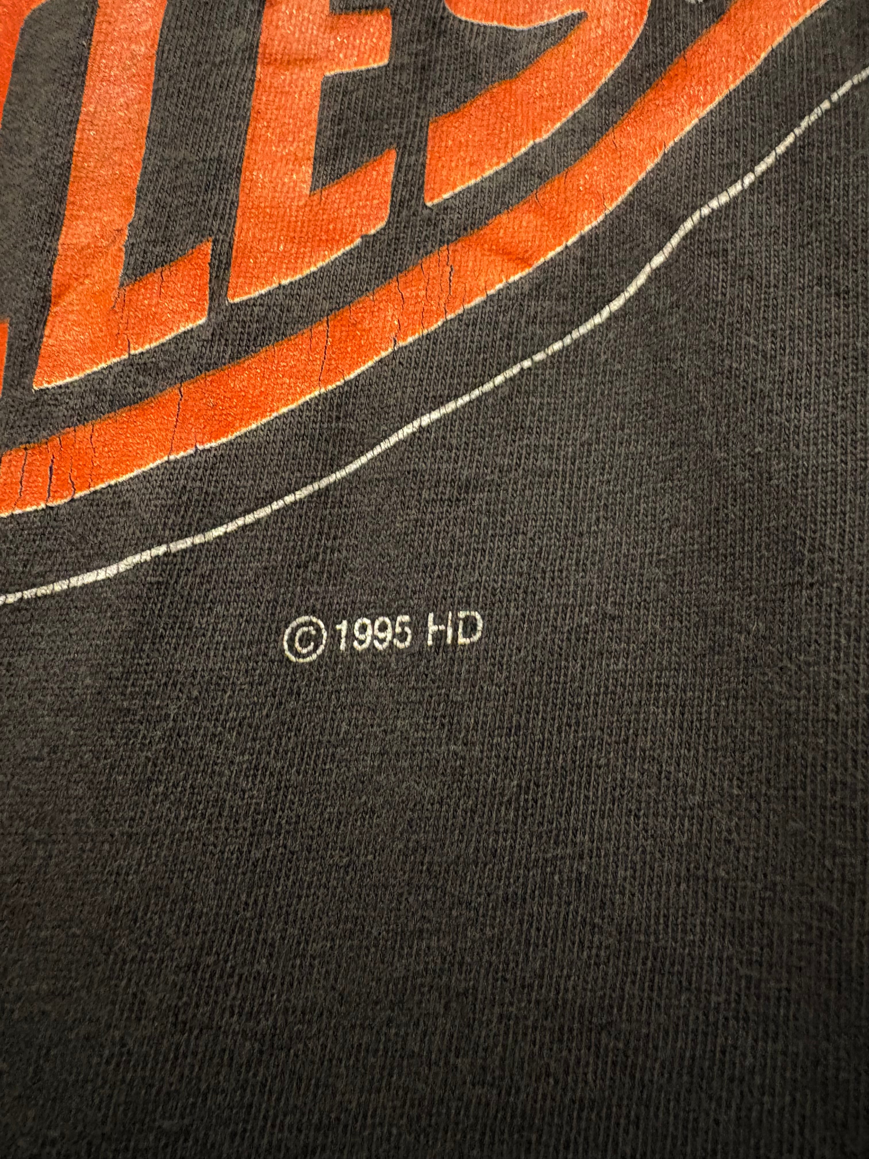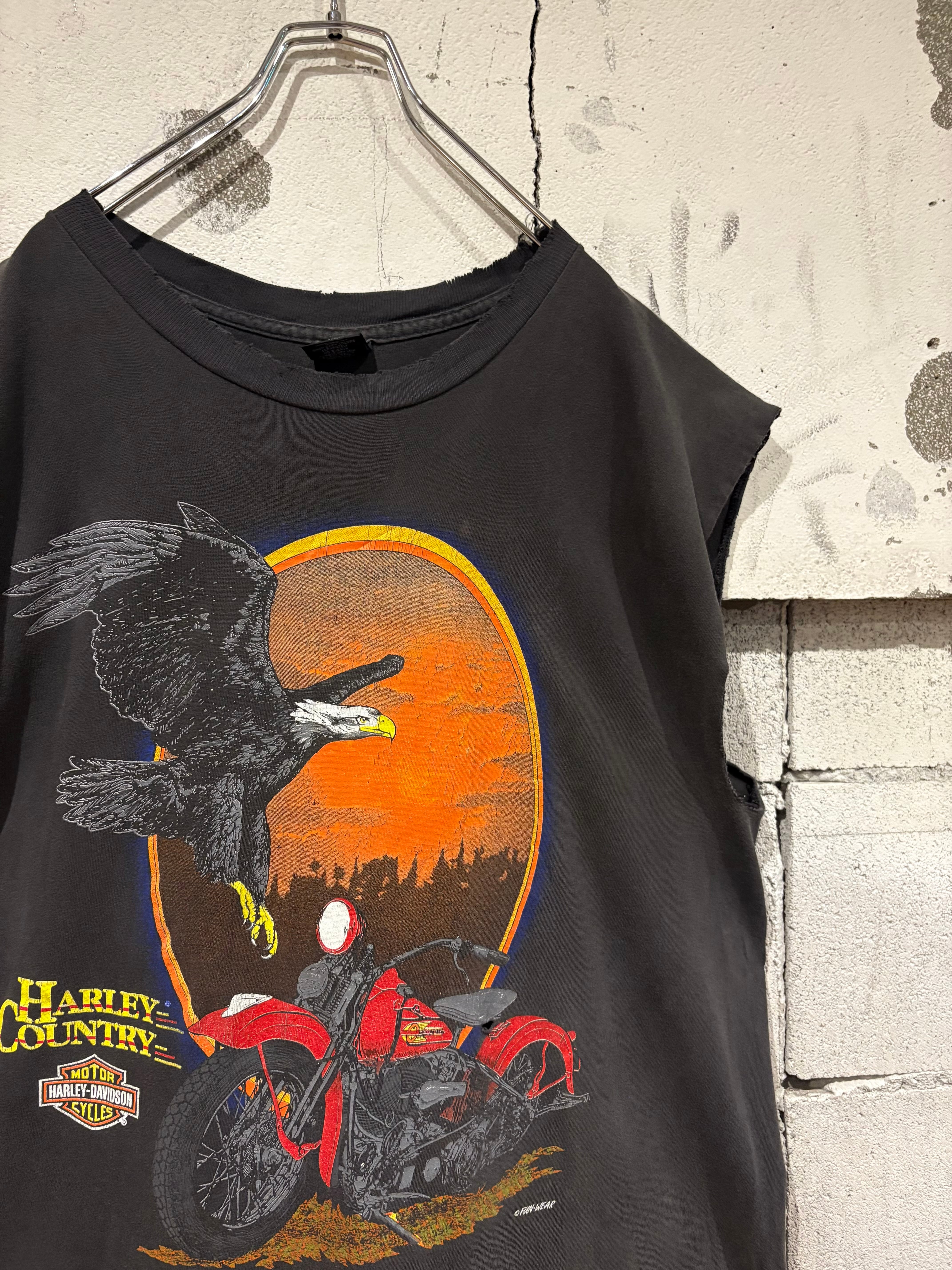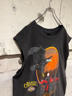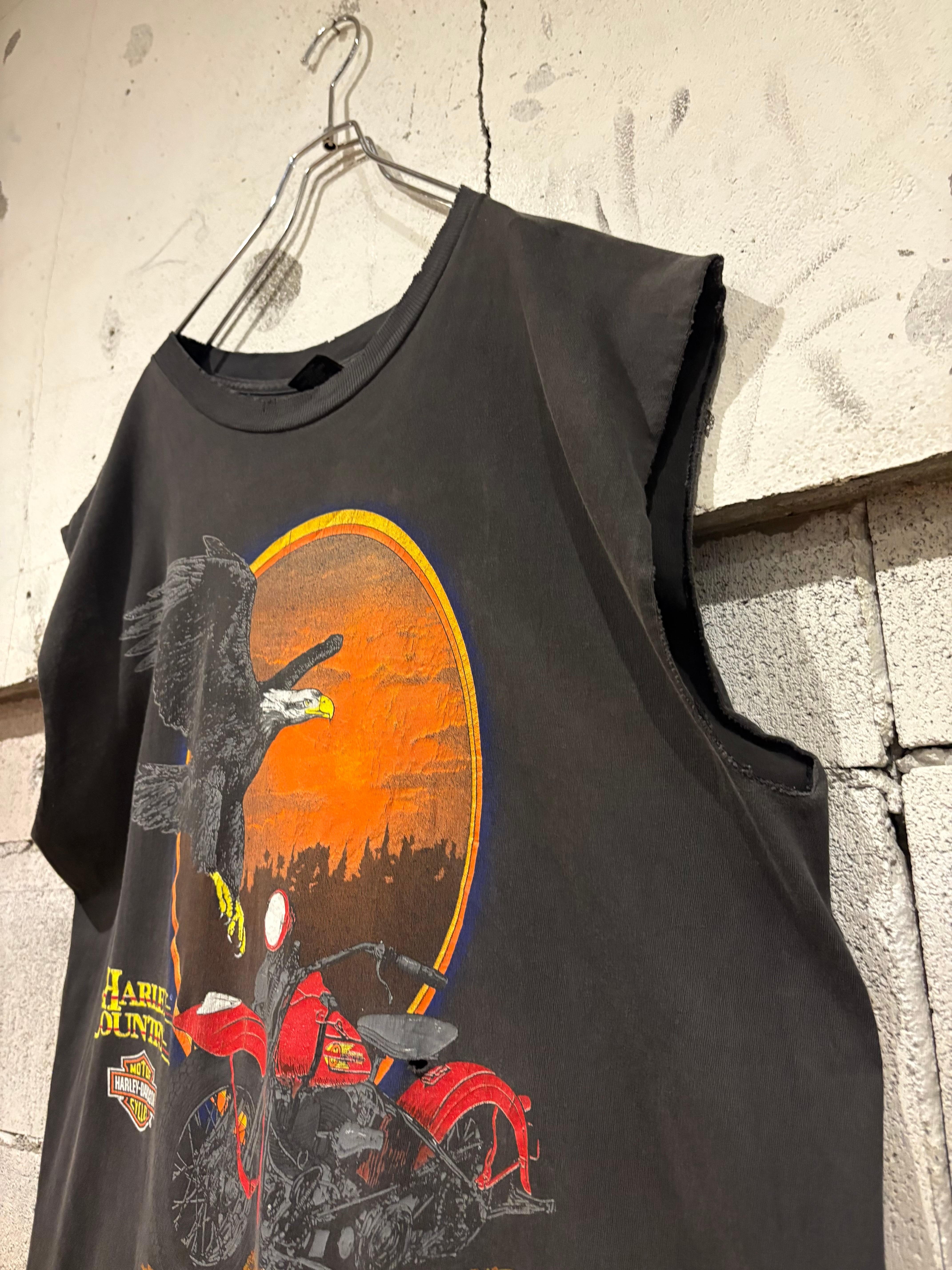1995年のコピーライト入り、90's ハーレーのTシャツに、前所有者がカットオフのカスタムを施したノースリーブの1着。