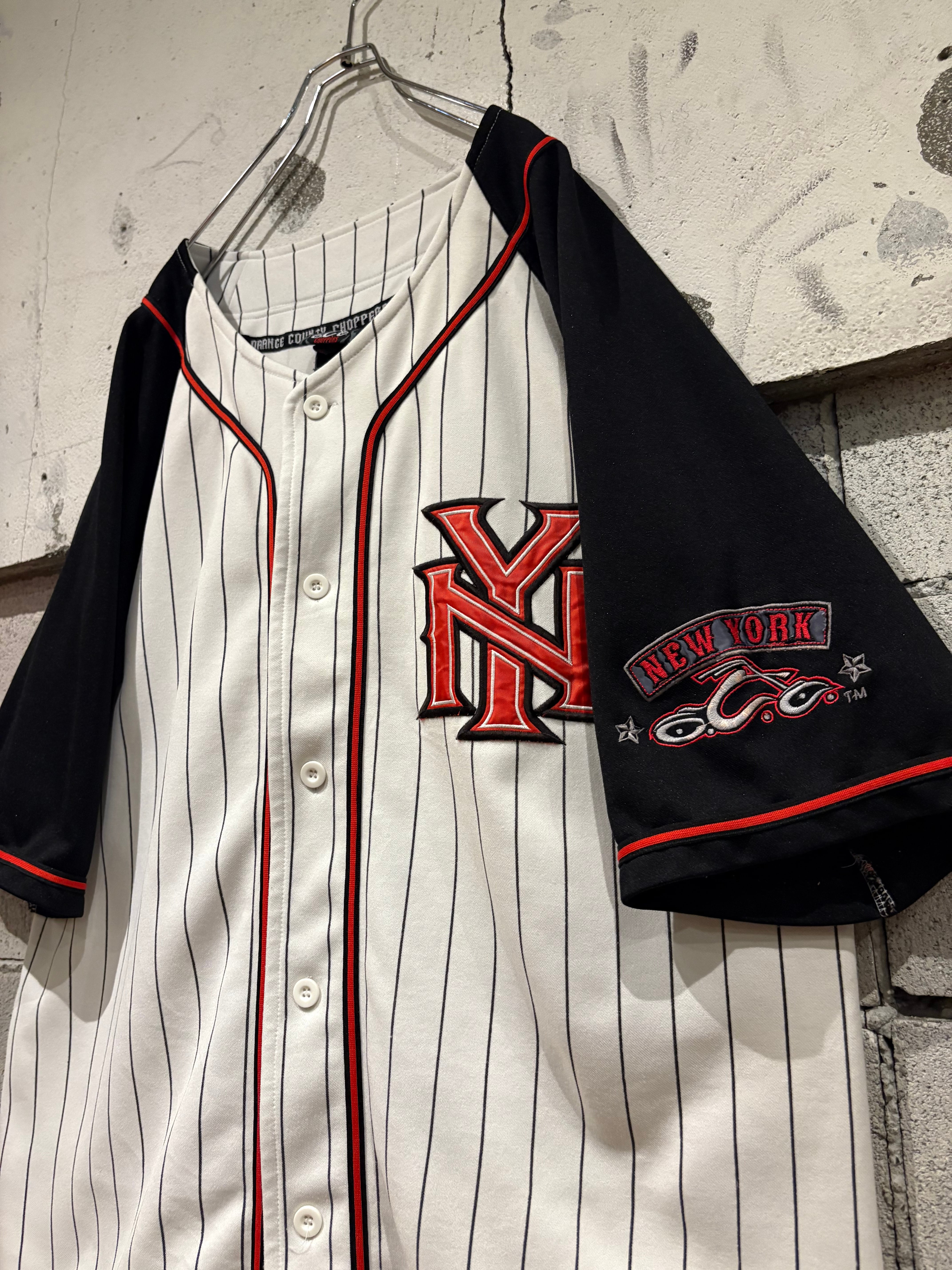 ホワイト×ブラックを切り替えたボディに、左胸には"NY"の文字、袖口や背面にブランドロゴを載せたベースボールシャツ。
