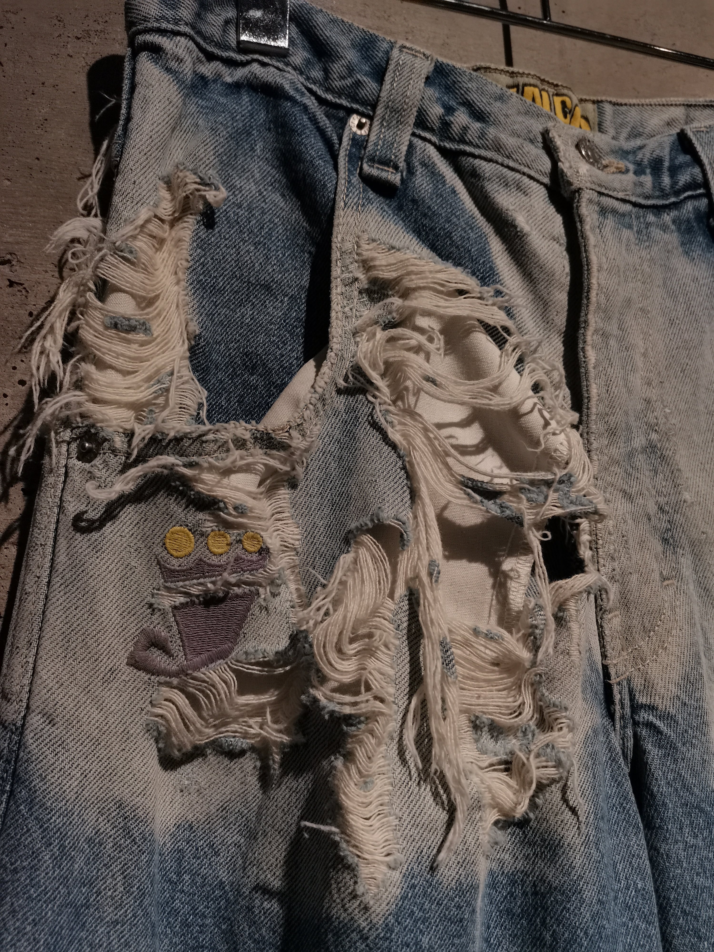退廃的かつ美しさを感じさせるデザインはさることながら、ウエストから裾まで超ワイドにズドンと落ちる、"JNCO"ならではシルエットも最高。着用時の裾に溜まりの生み出るフォルムはやはりいつ見ても格好良いですね、、、