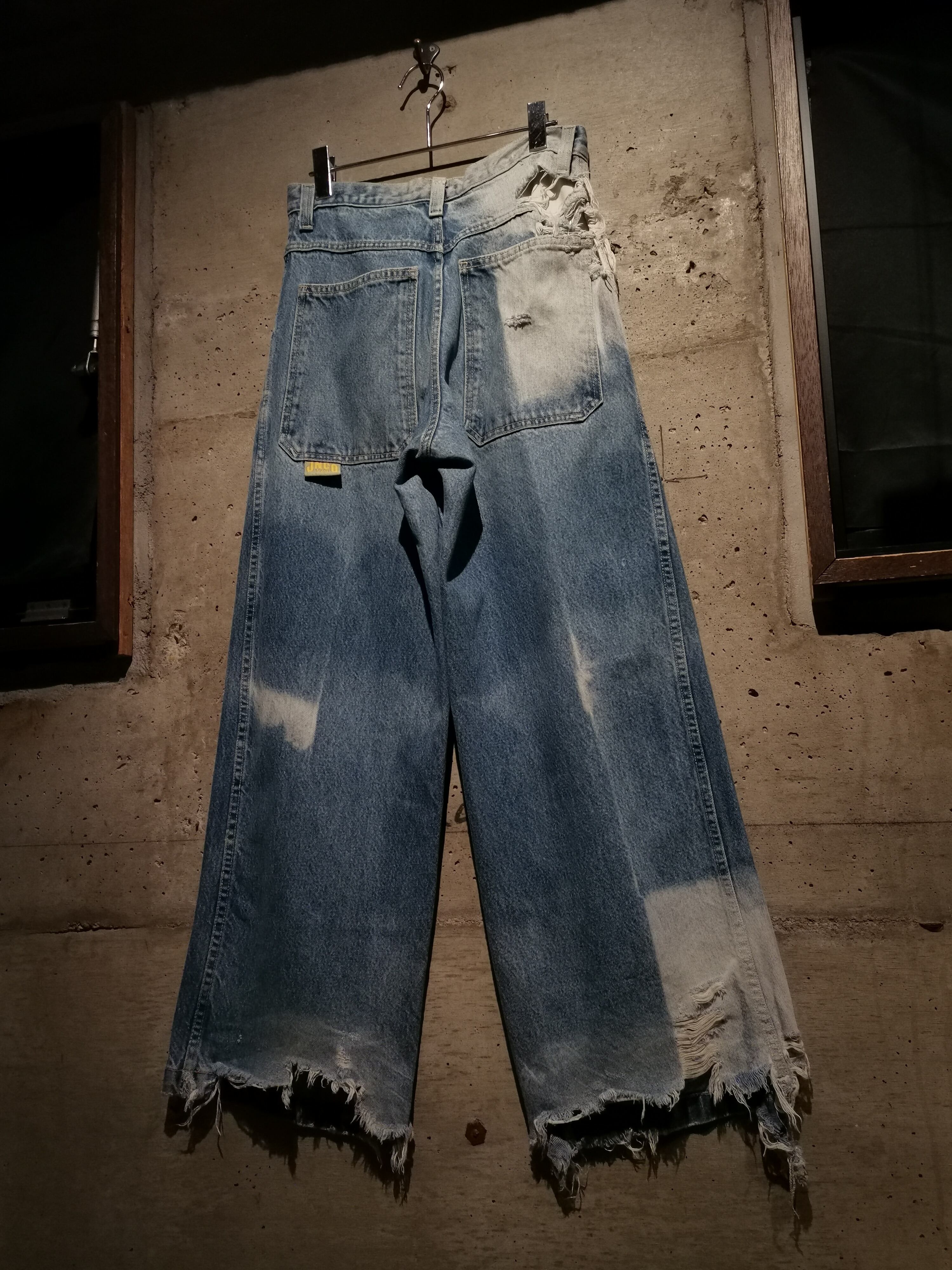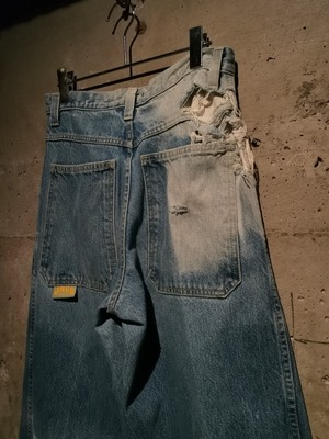 アイスブルーのデニムボディに、大胆なダメージ×ブリーチによるデザインが効いた、抜群の雰囲気を醸し出すバギージーンズ。