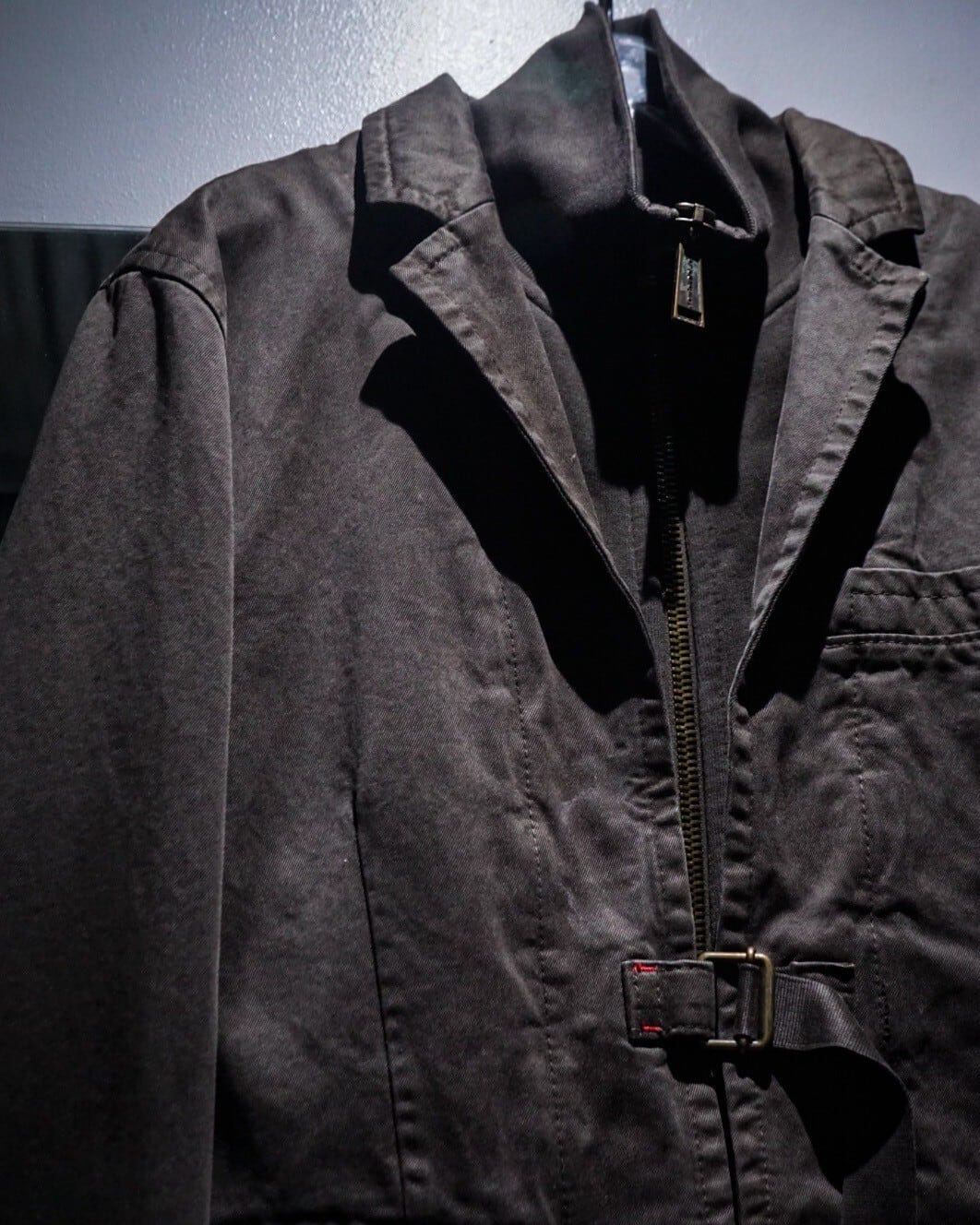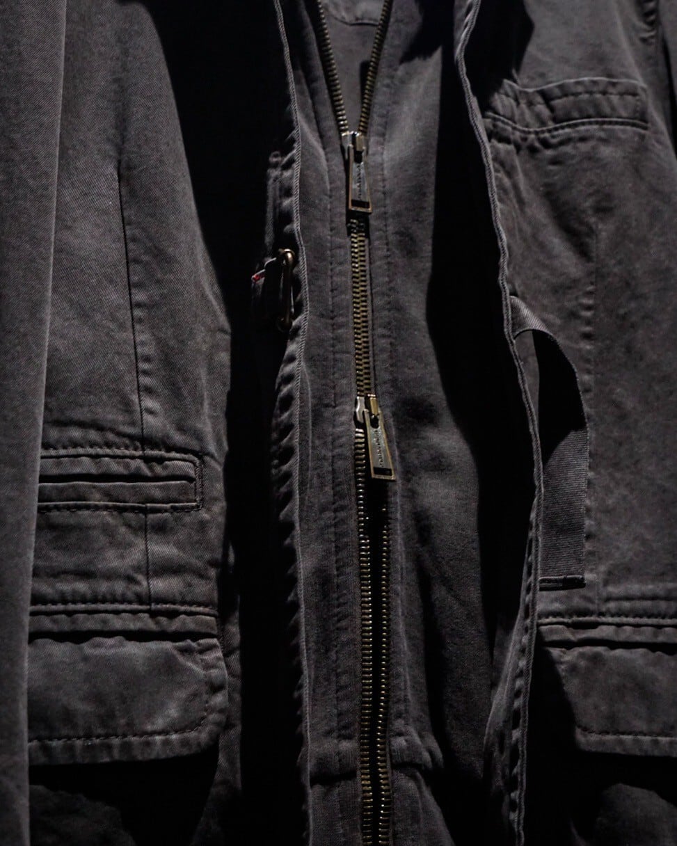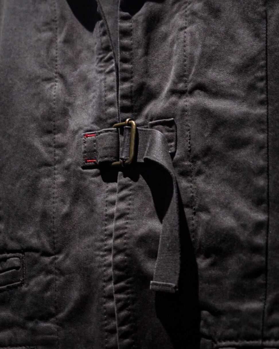 前立て部分はベルトとハイネックのジップからなる二重構造となっており、比翼とはまた異なる特有の雰囲気を放つ1着。