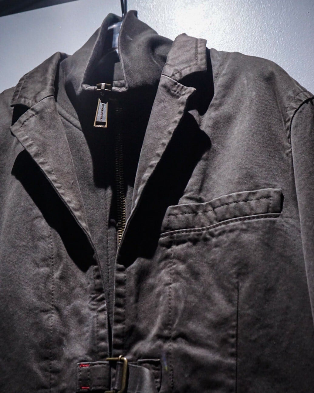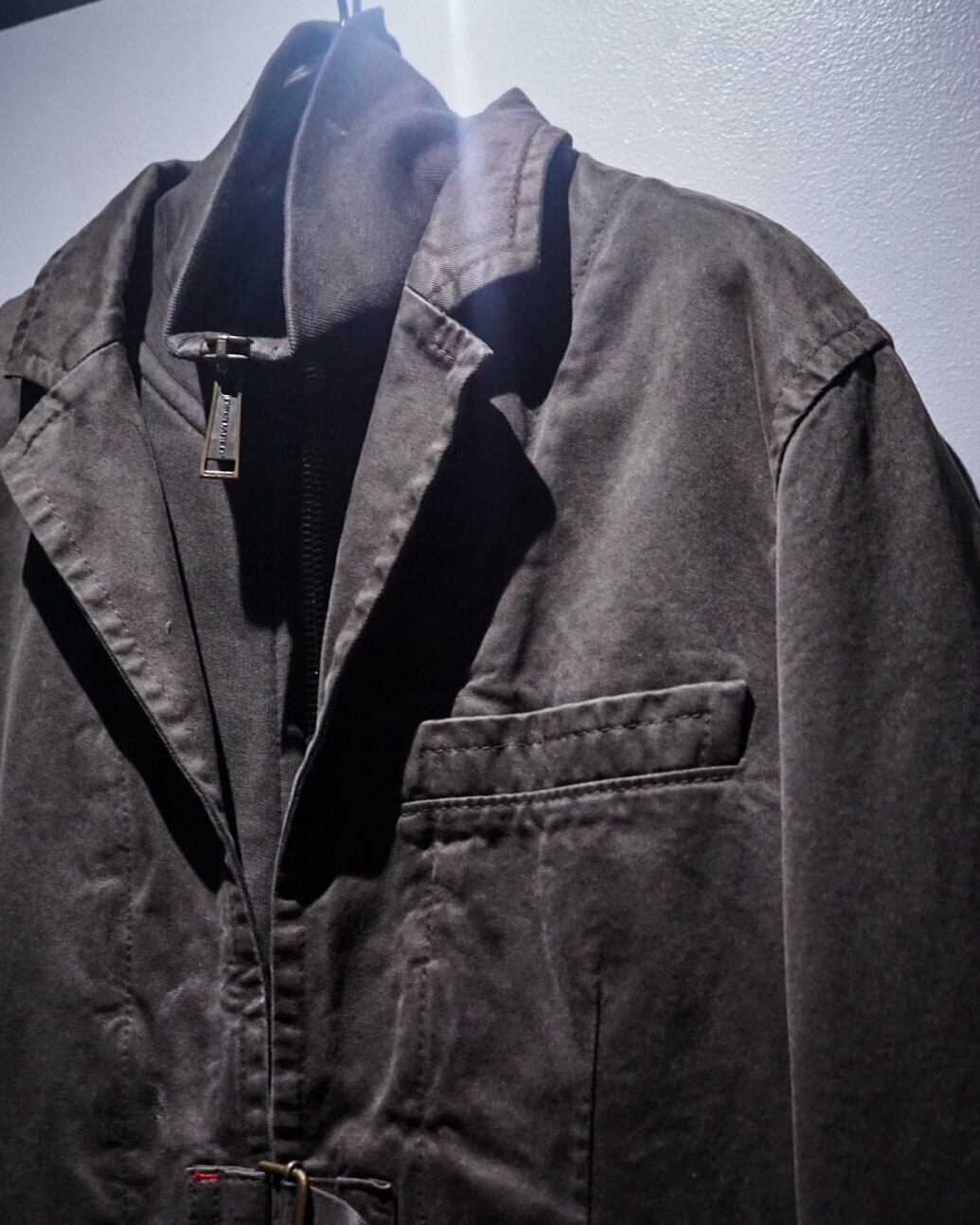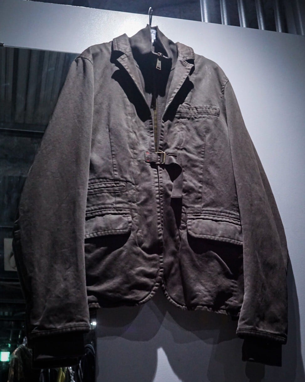 前立て部分はベルトとハイネックのジップからなる二重構造となっており、比翼とはまた異なる特有の雰囲気を放つ1着。