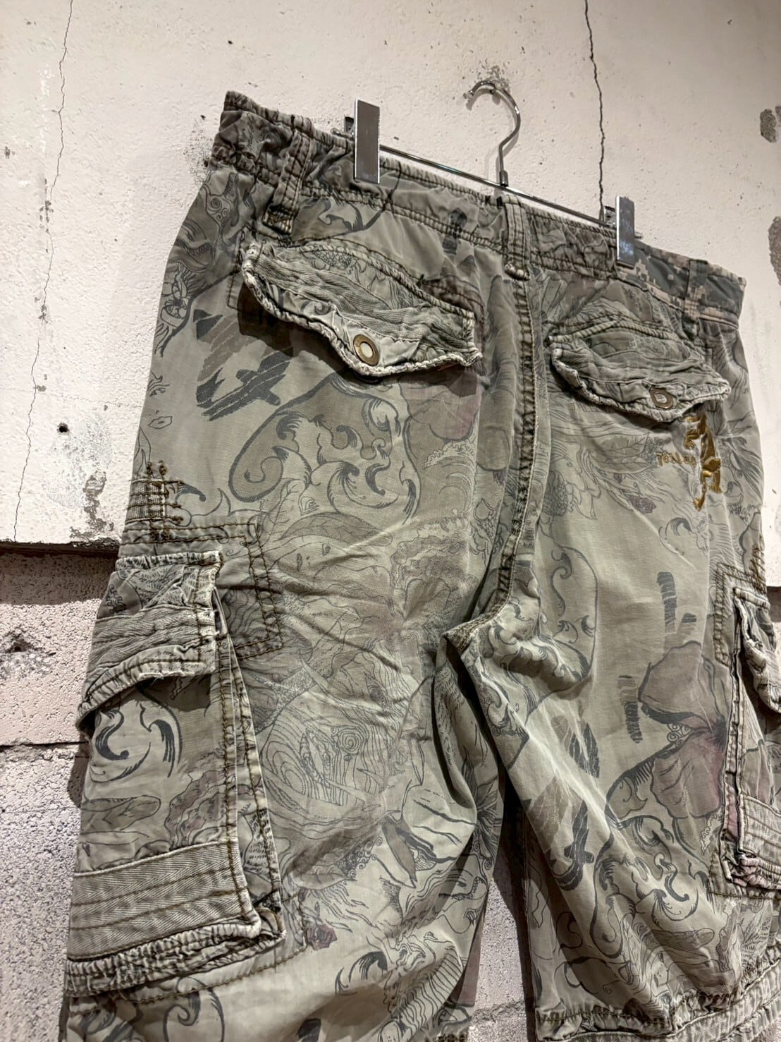 ヘリンボーン織りによって仕上げられたボディに、植物や顔などをモチーフとしたアート調のデザインをカモフラージュ風にボディ全体に落とし込まれたカーゴショーツ。