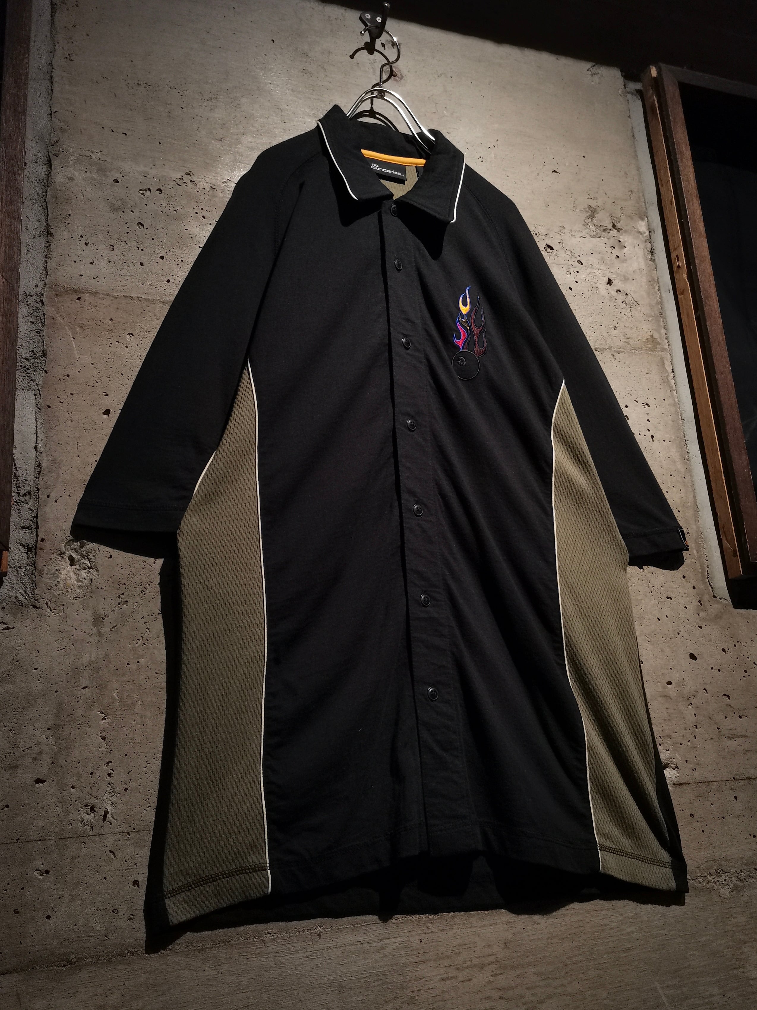 左胸にはエイトボールとカラフルなファイヤーパターンの刺繍ワッペンを施したデザイン。切り替え部分にはパイピングを施すことでメリハリのあるデザインに仕上がっています。