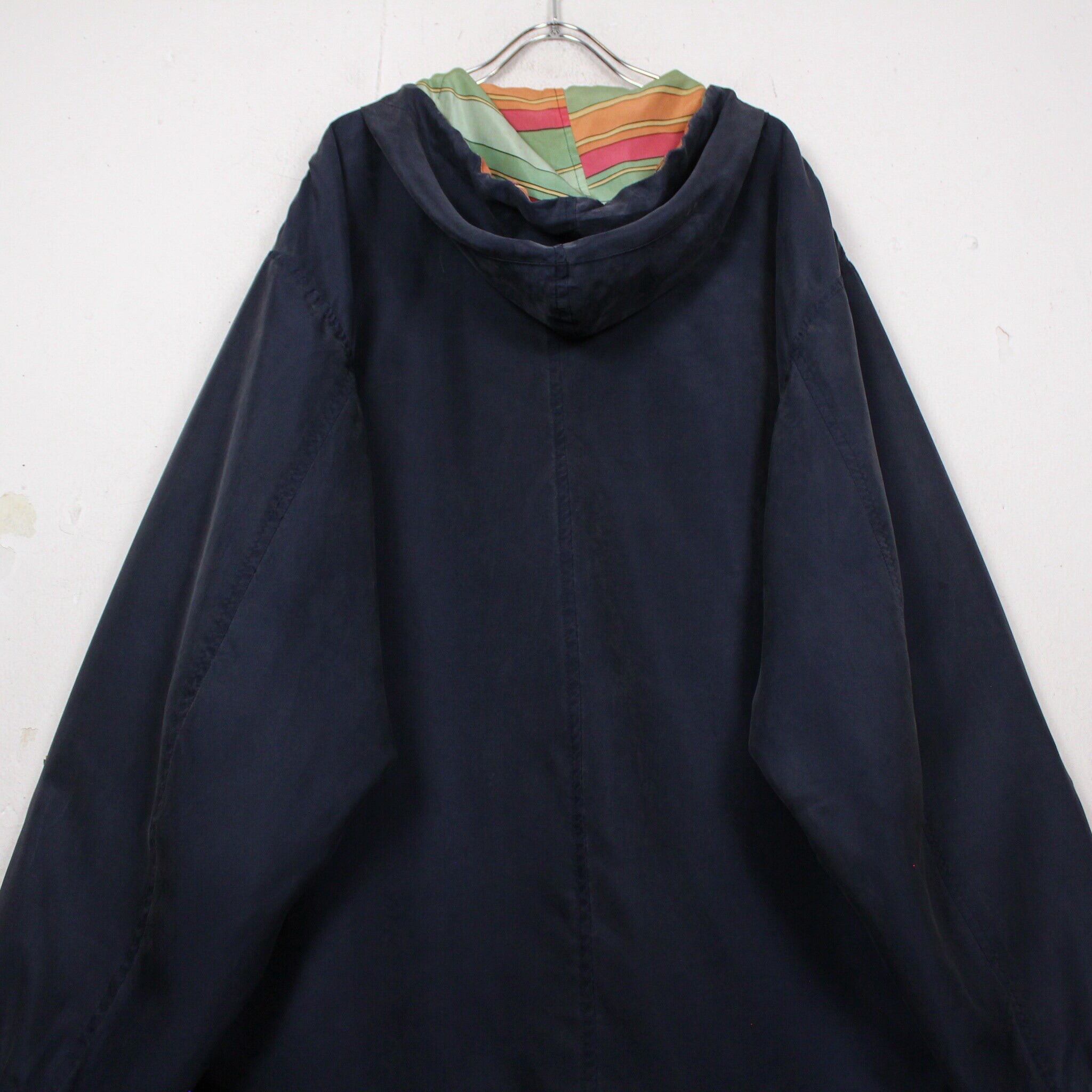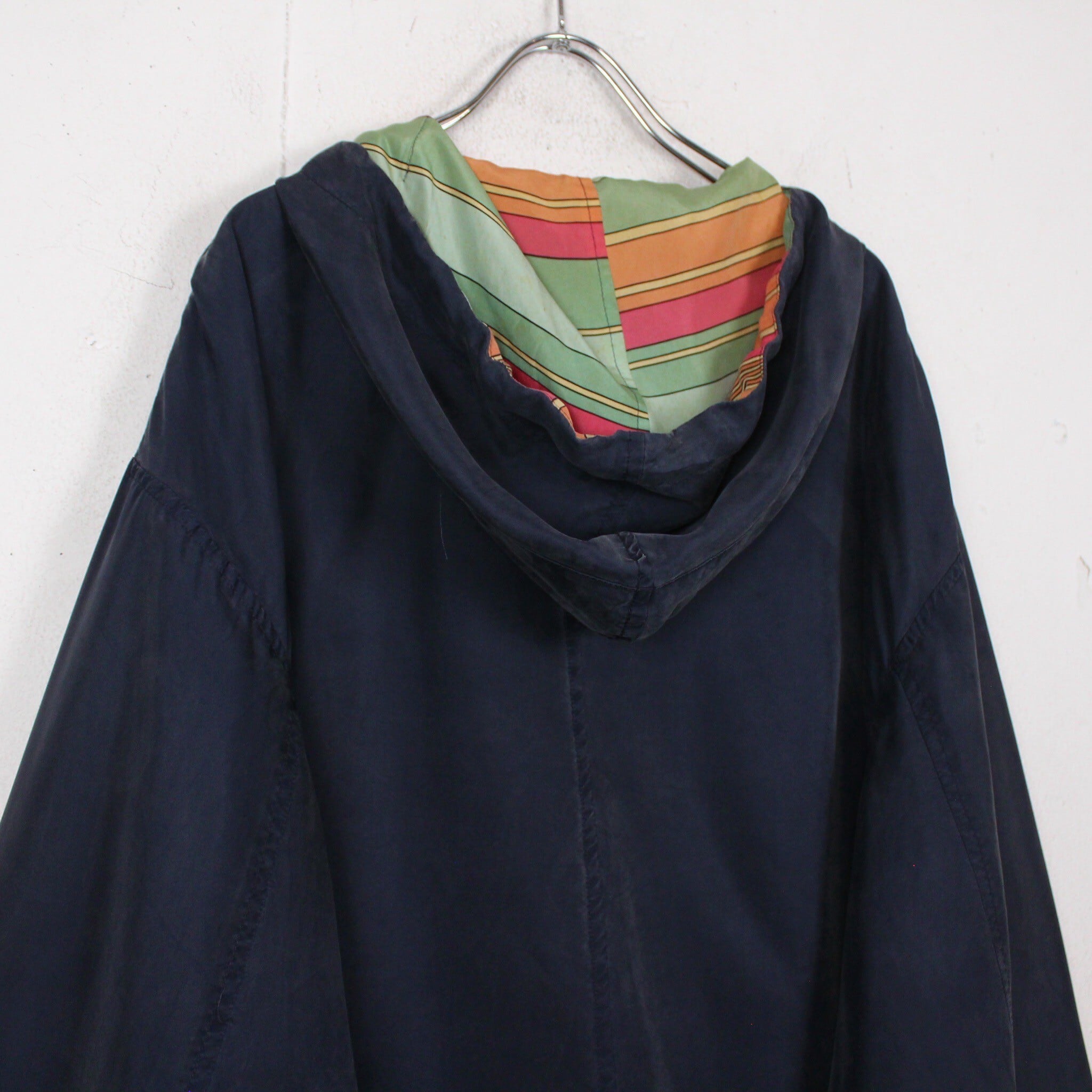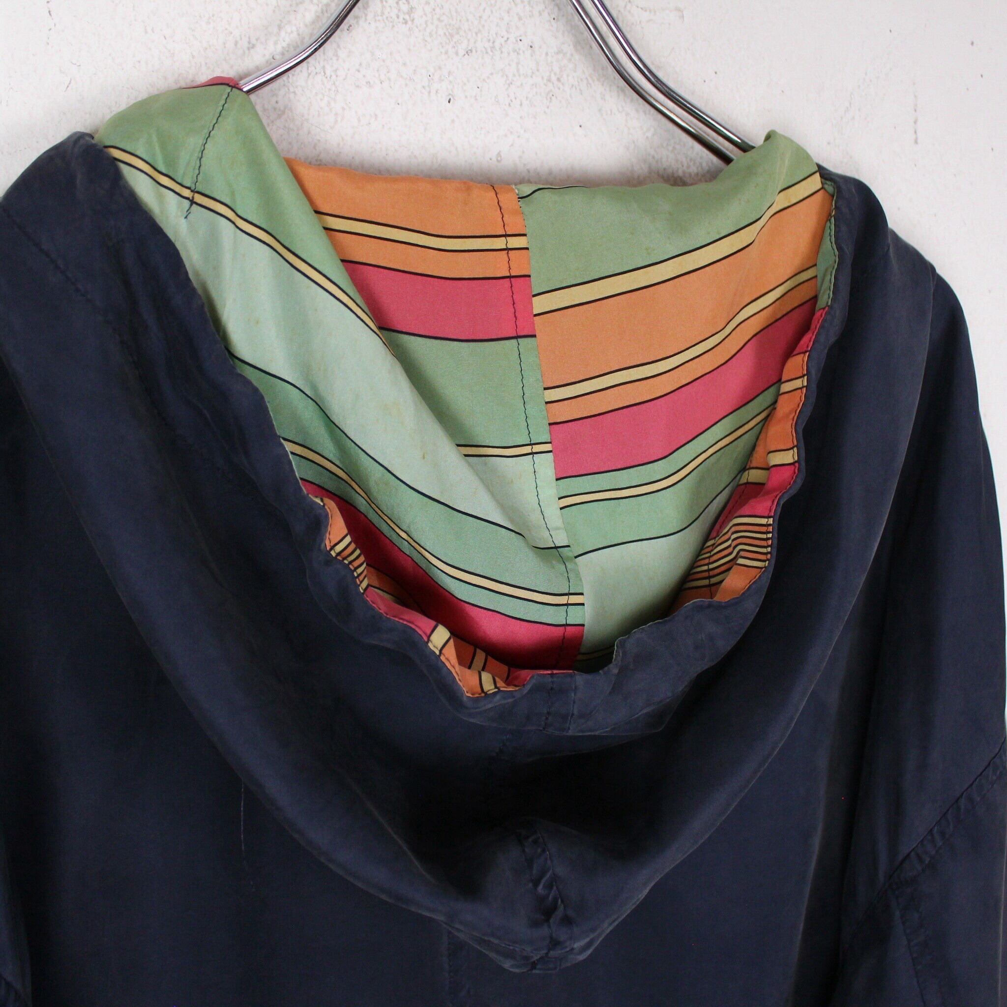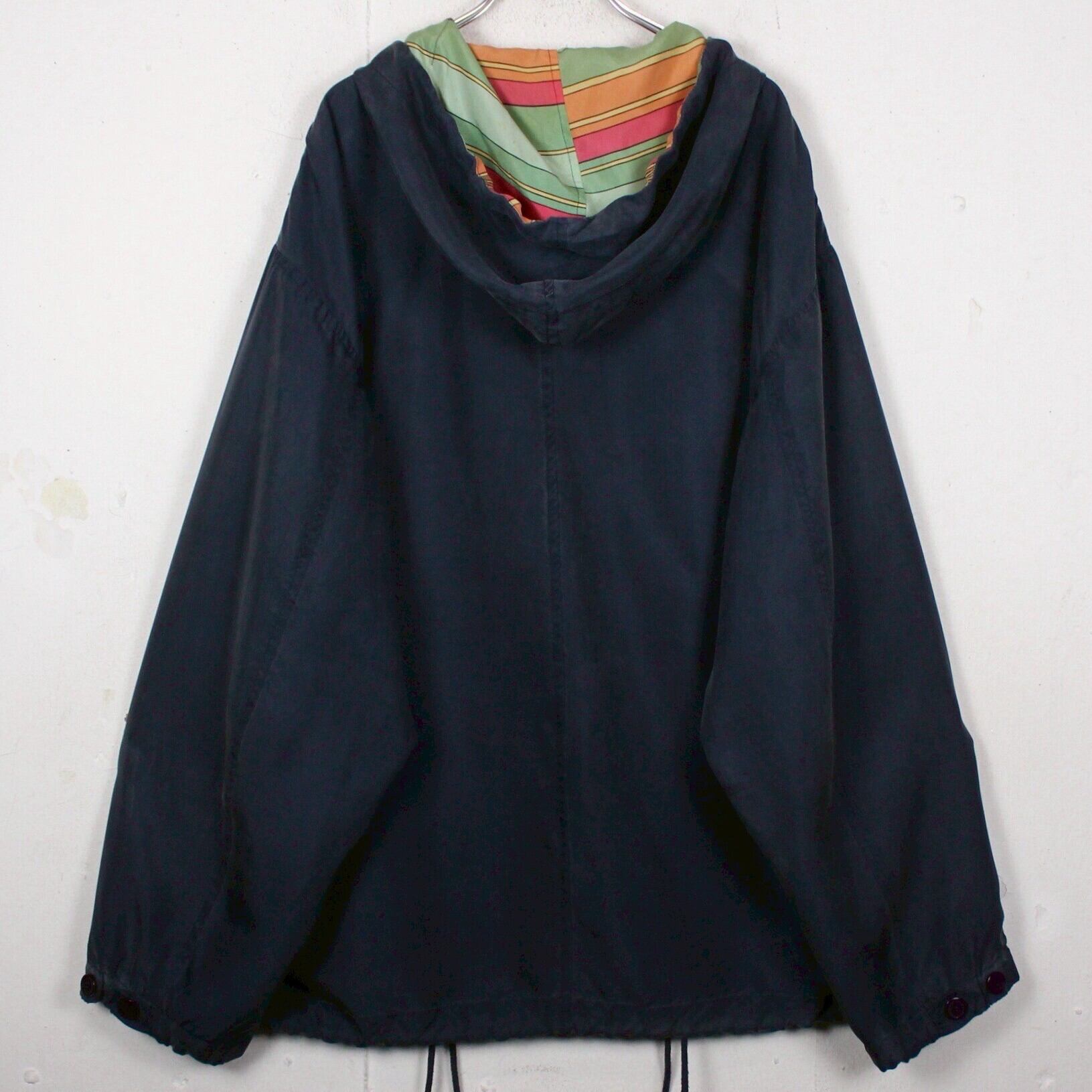 ネイビーカラーのボディに、フード裏に配されたマルチストライプの掛け合わせも非常に良いですね。