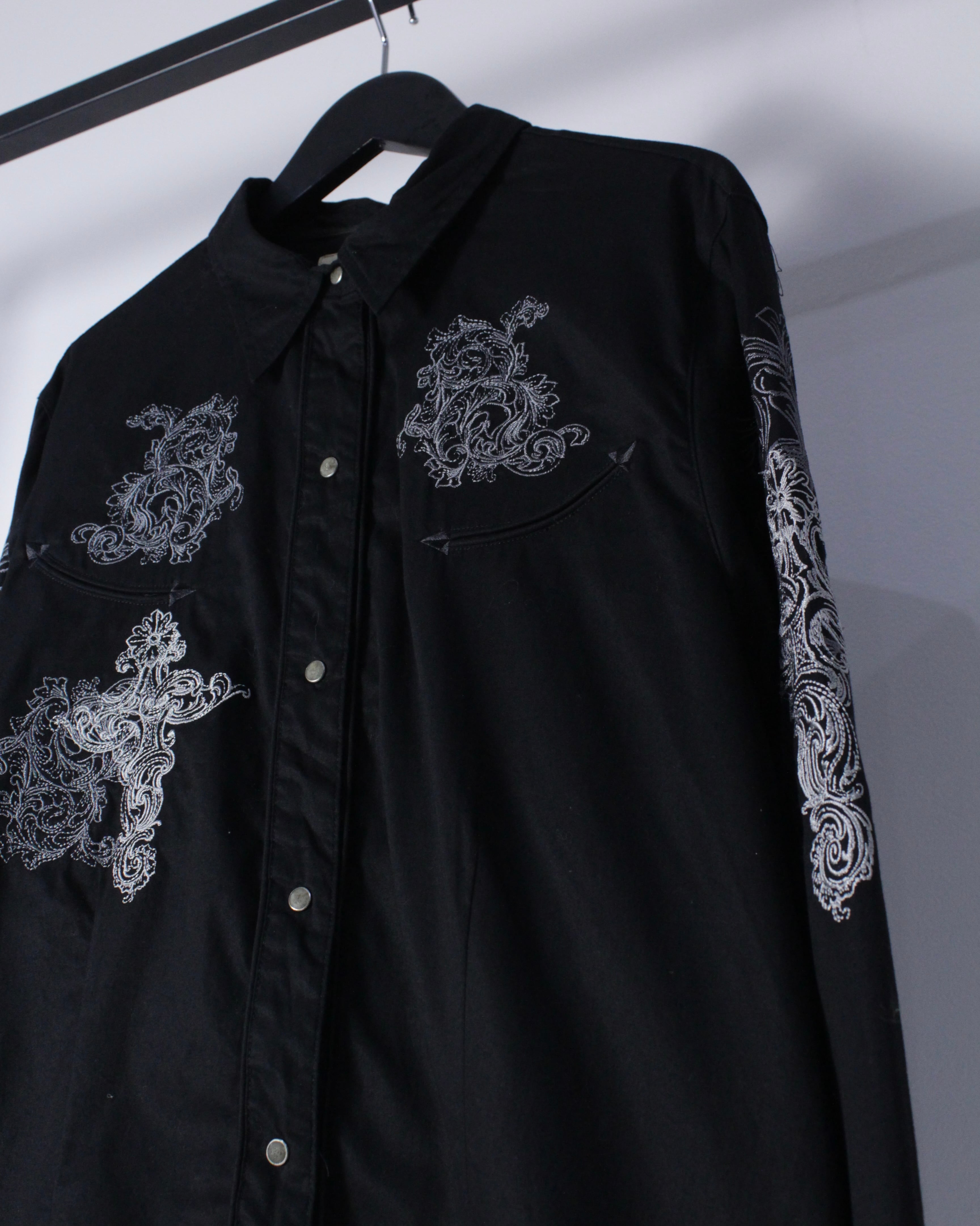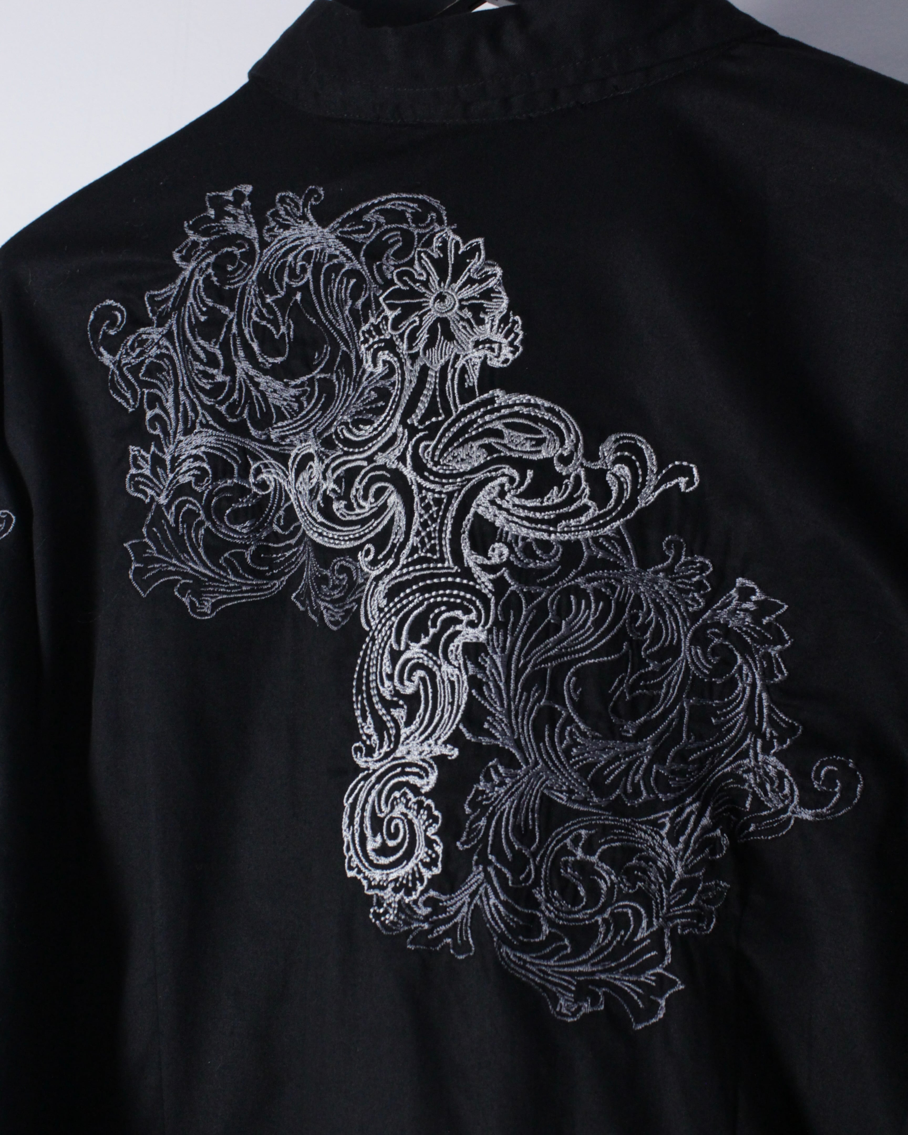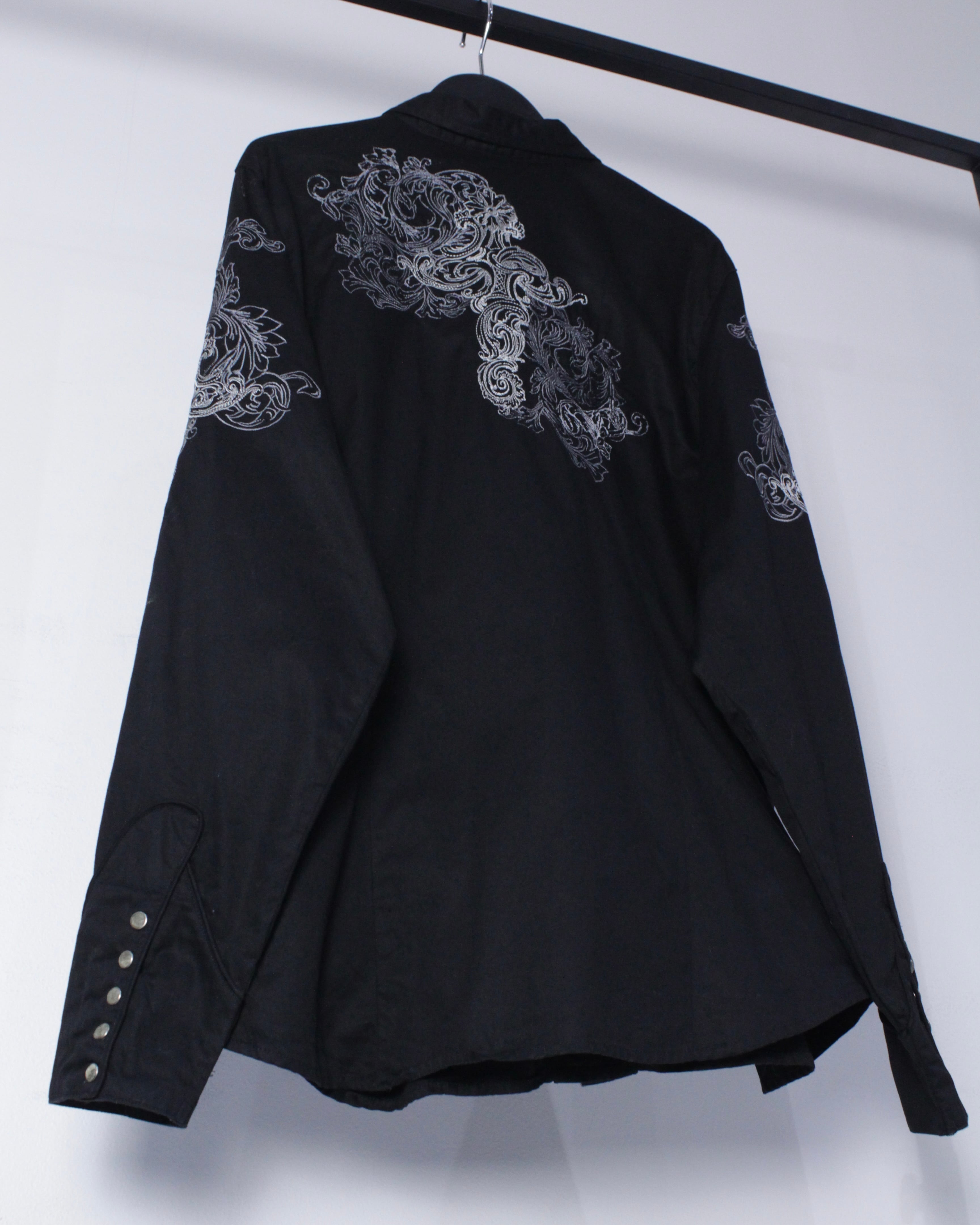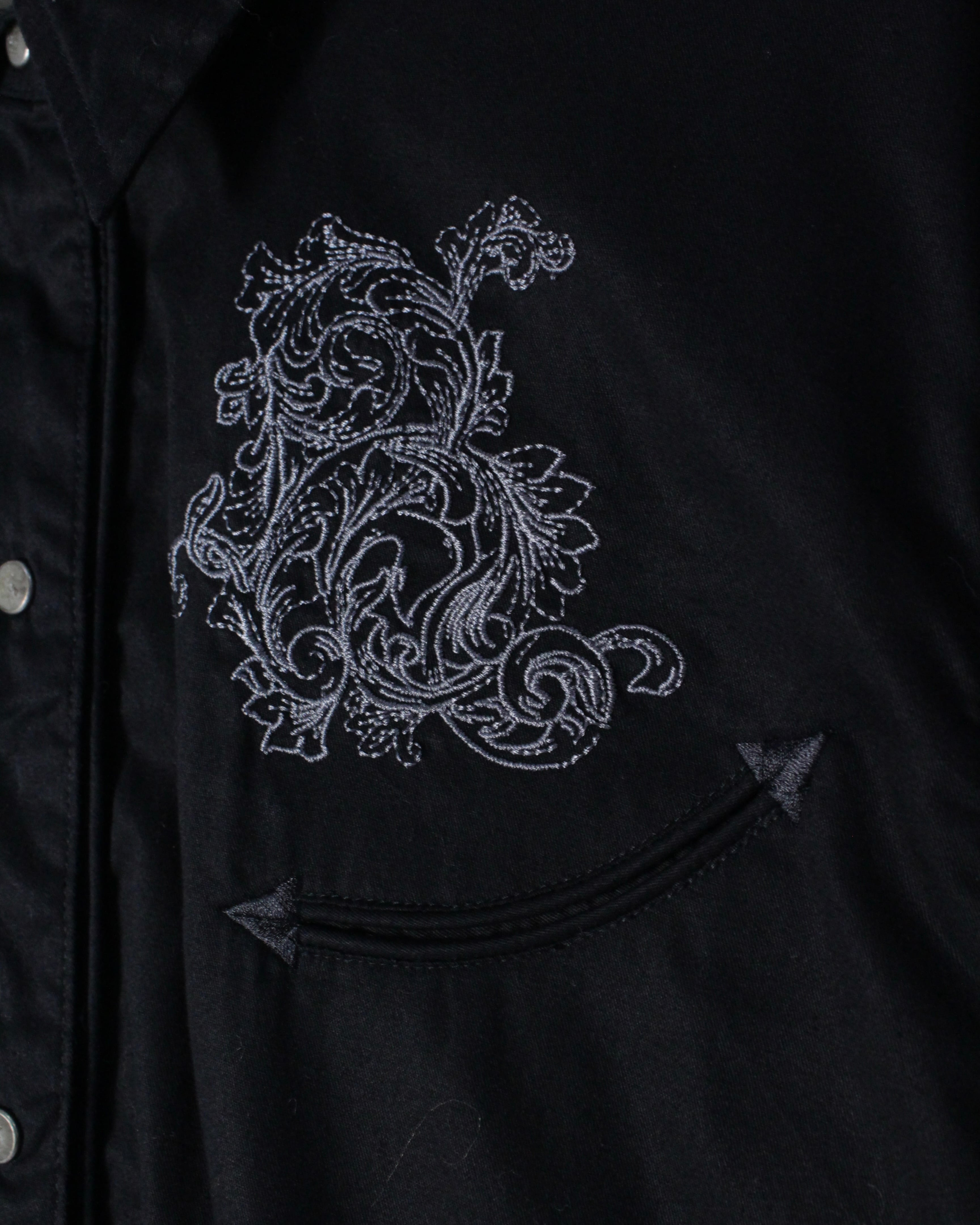 柔らかなコシのあるブラックのボディに、クロスモチーフのゴシックな刺繍を刻んだウエスタンシャツ。
