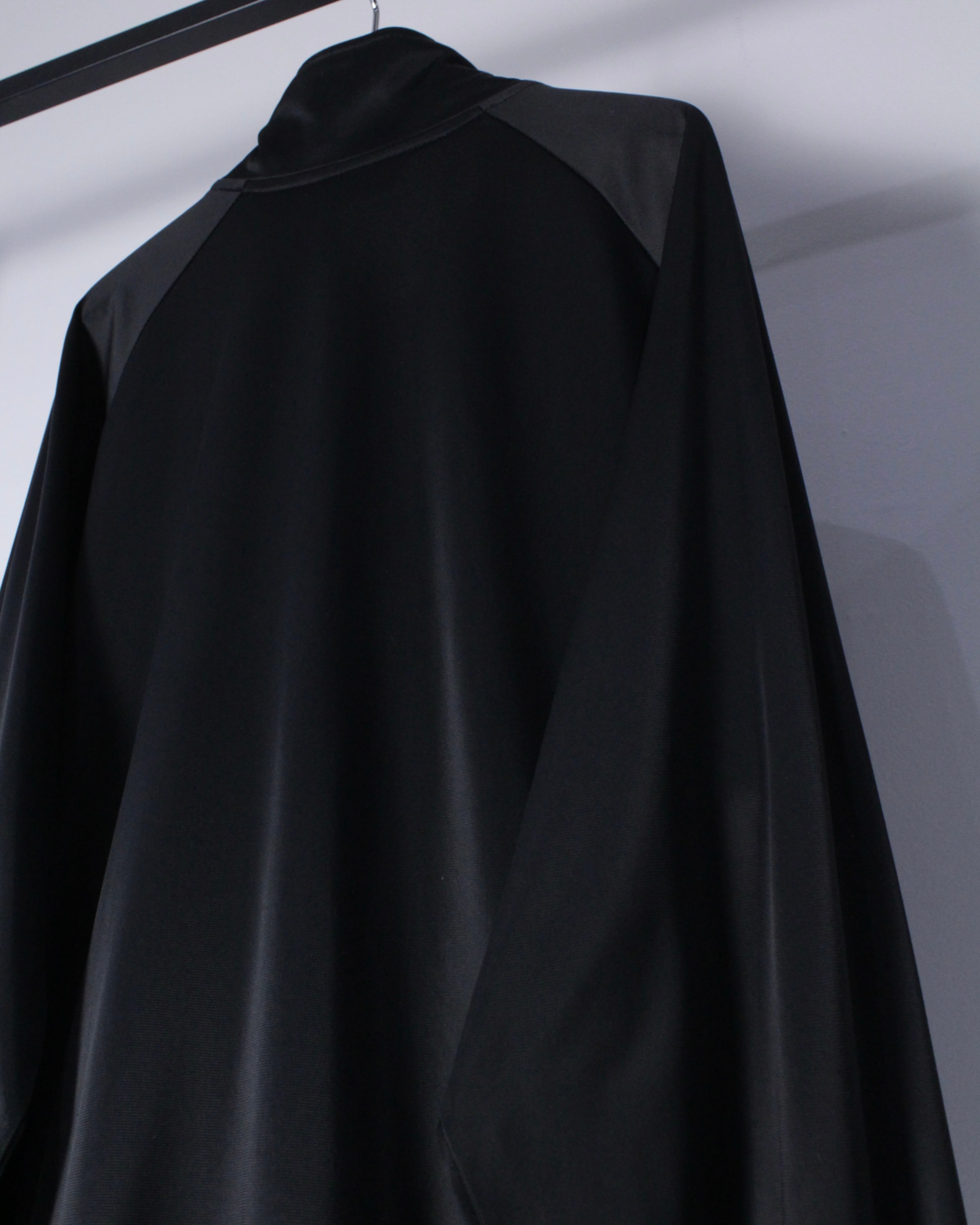 光沢のあるブラックのジャージ素材をベースに、バイアス柄を切り替えて載せた1着。
