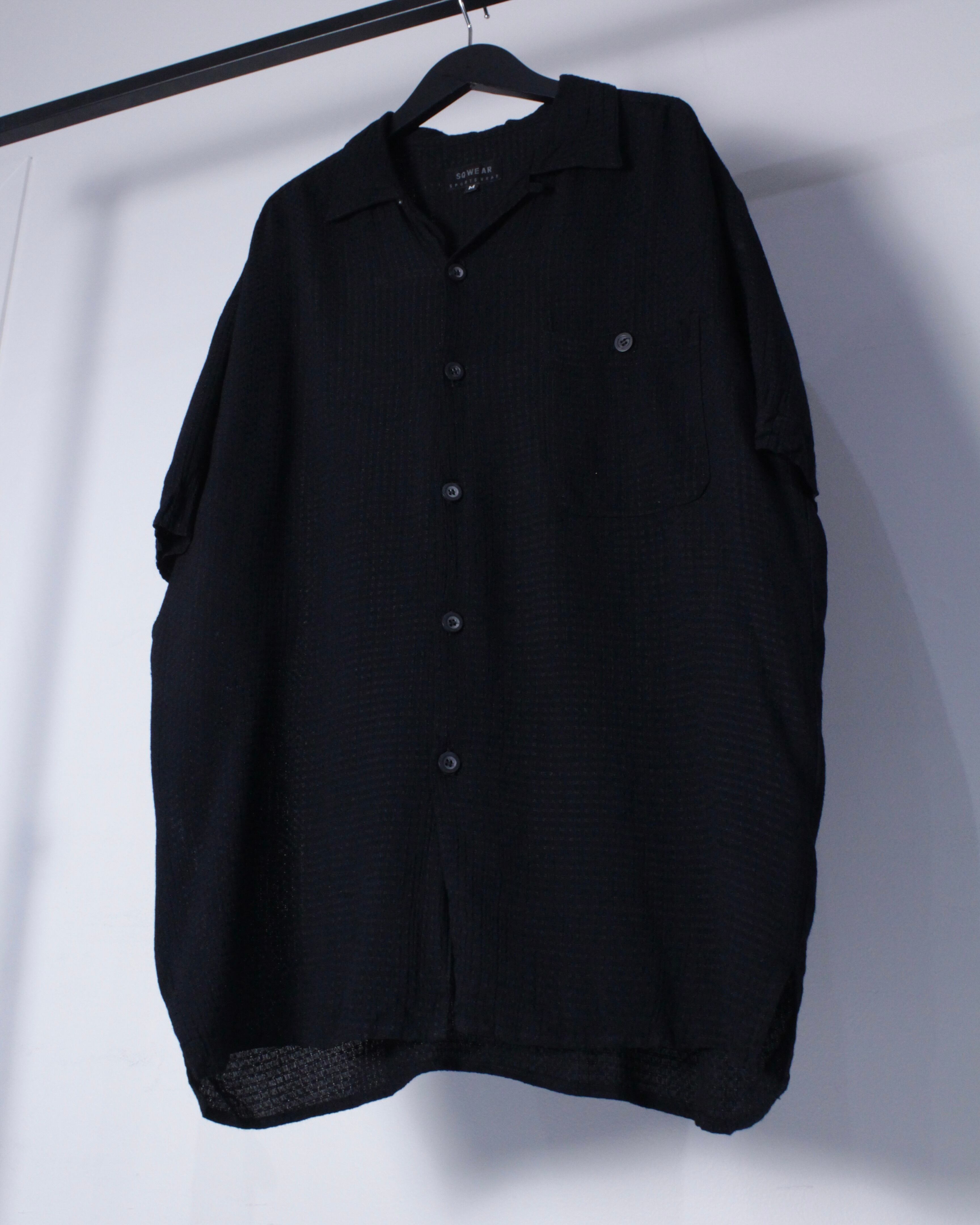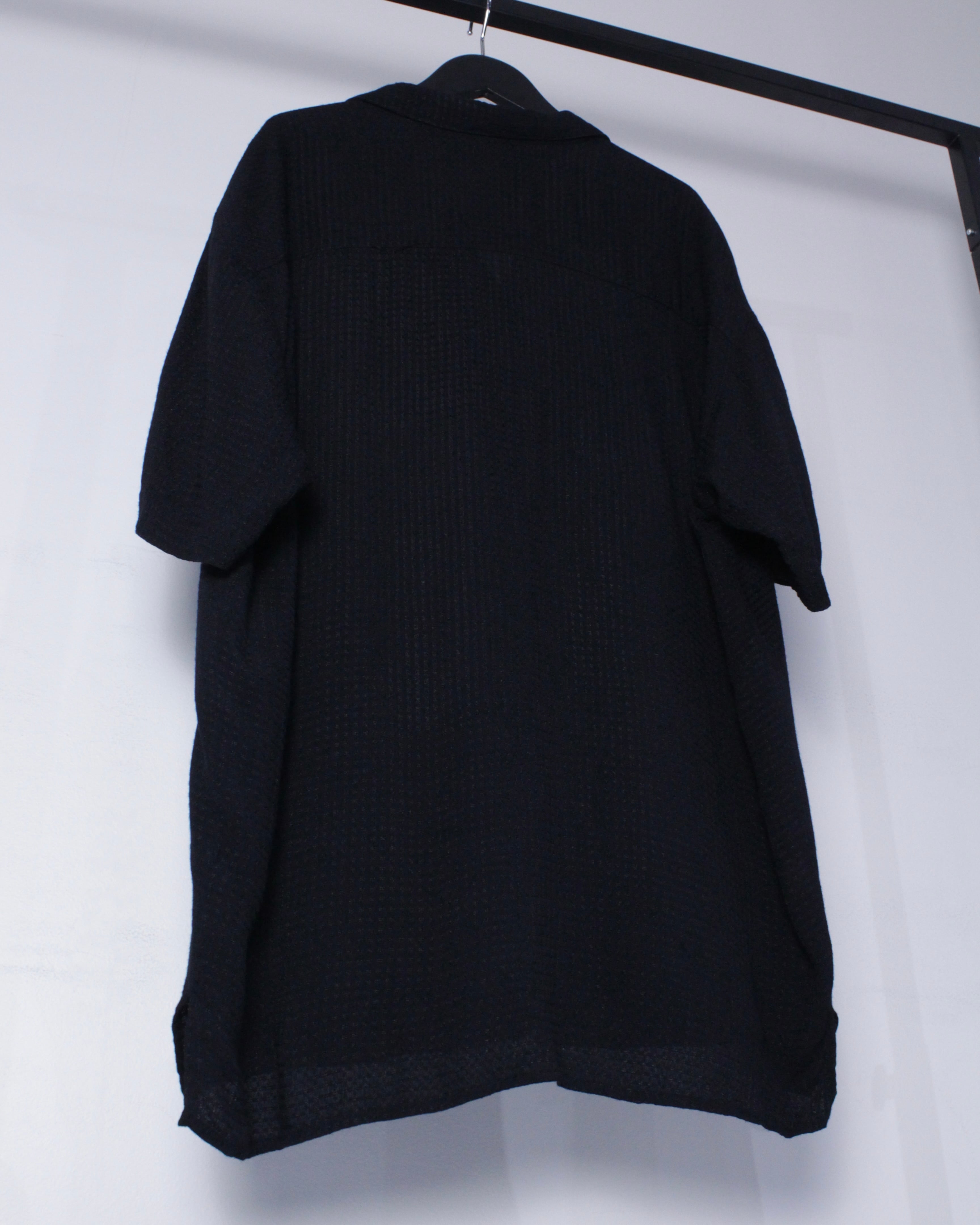 ブラックのボディをベースに、織りでブロック状に柄模様が載せられた半袖オープンカラーシャツ。