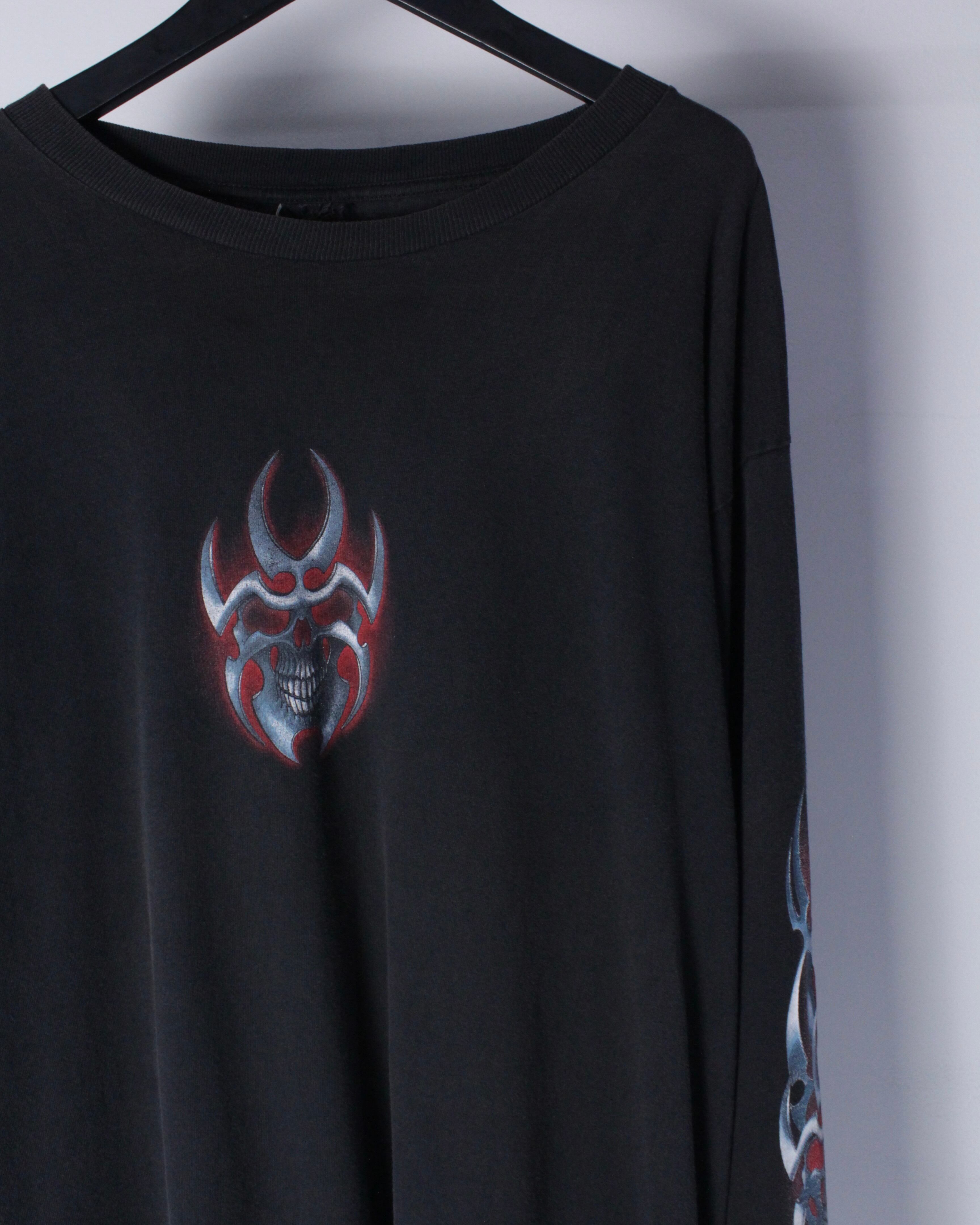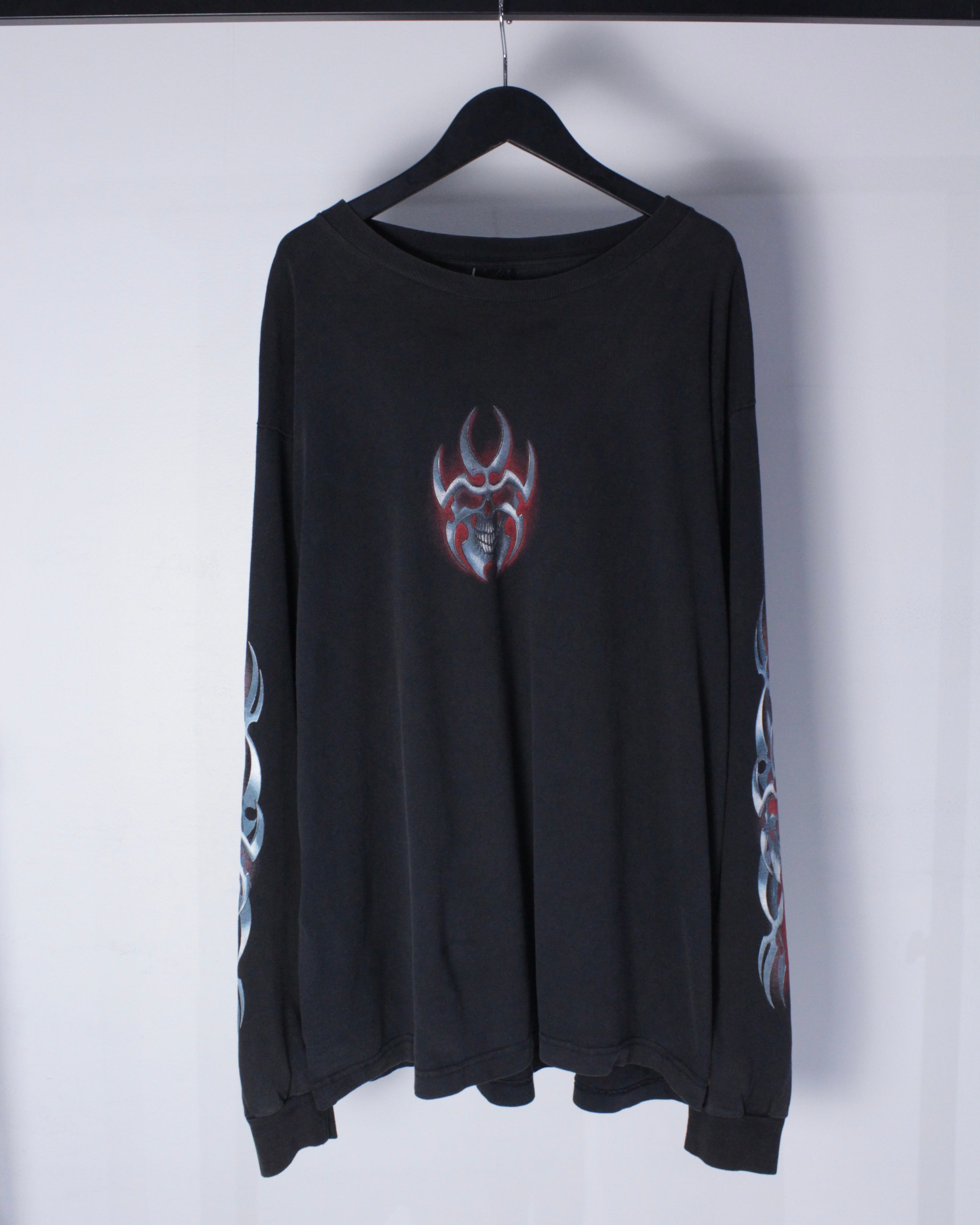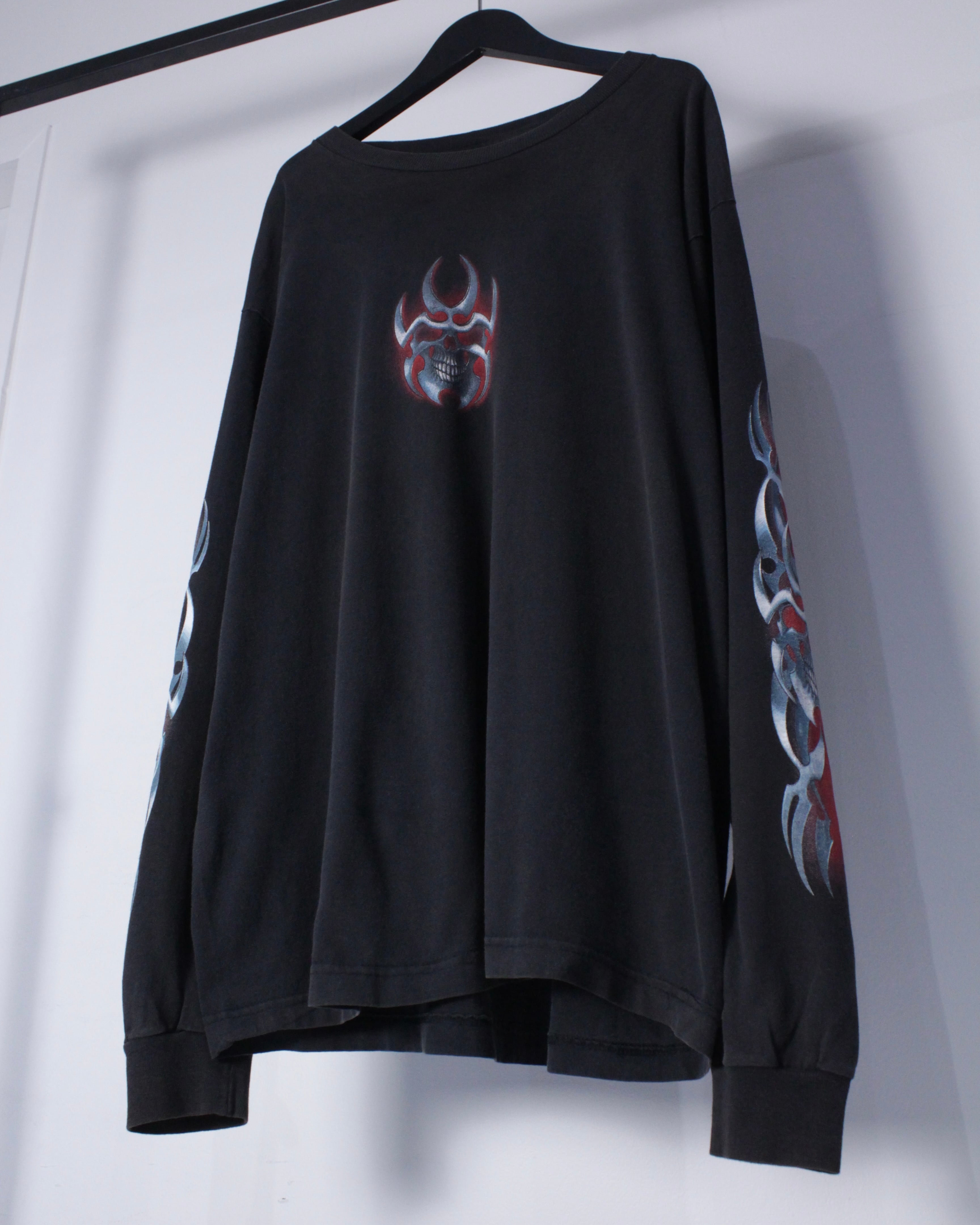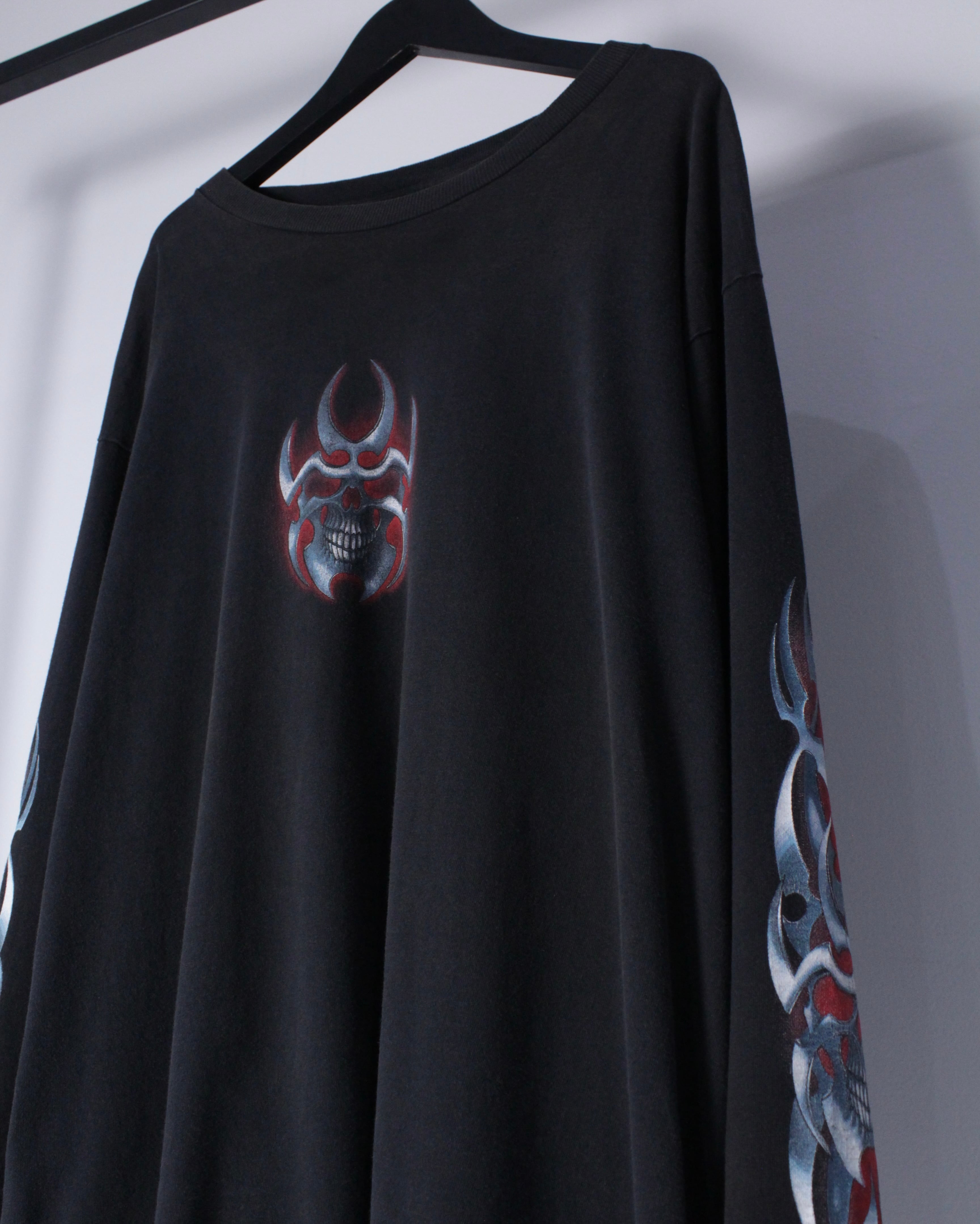 フェードブラックのボディに、フロント、アームにトライバルなスカル風のデザインをプリントで載せたロンT。