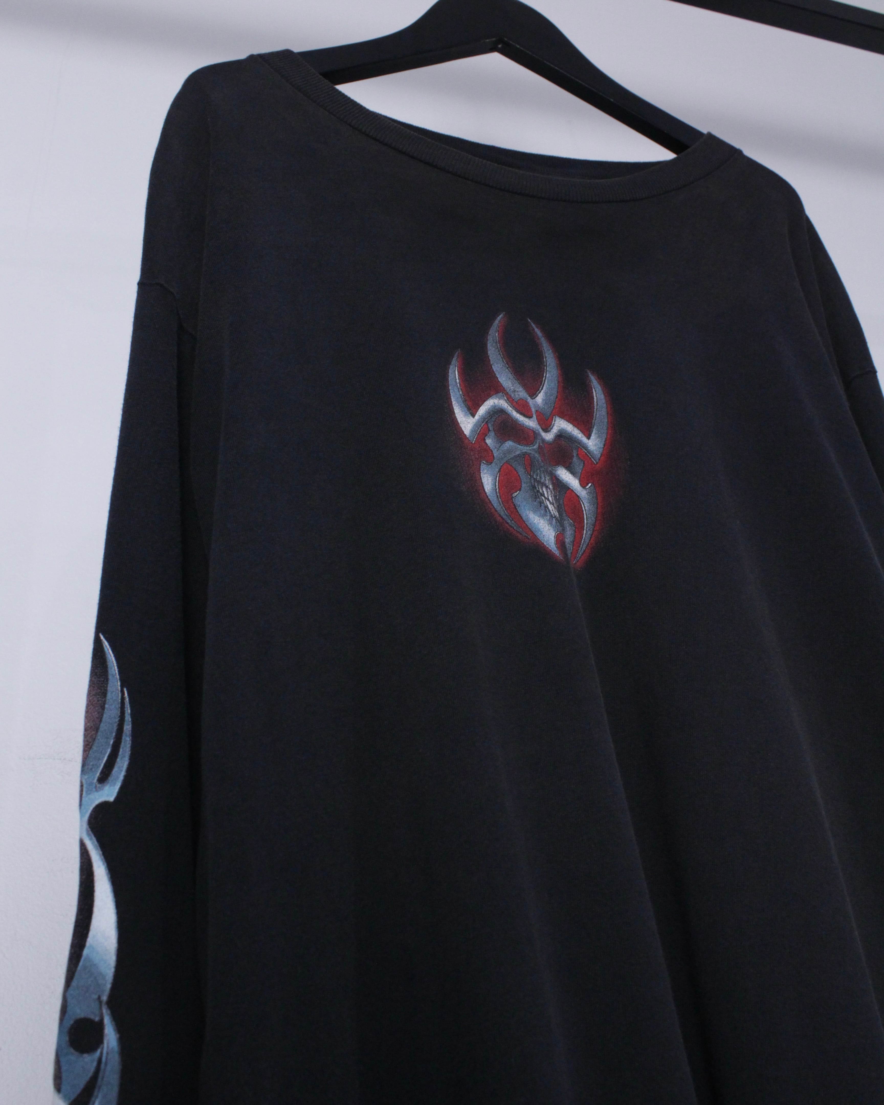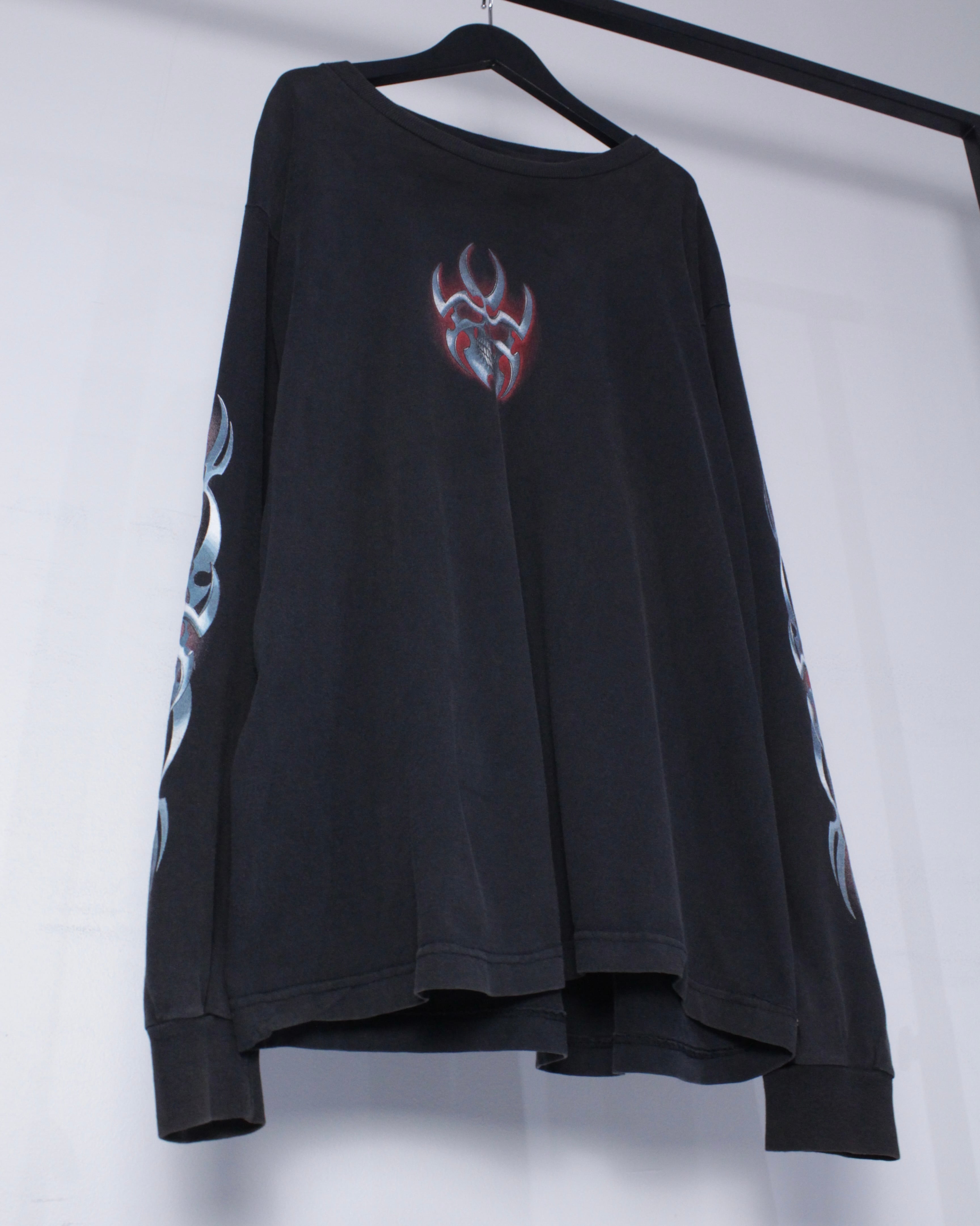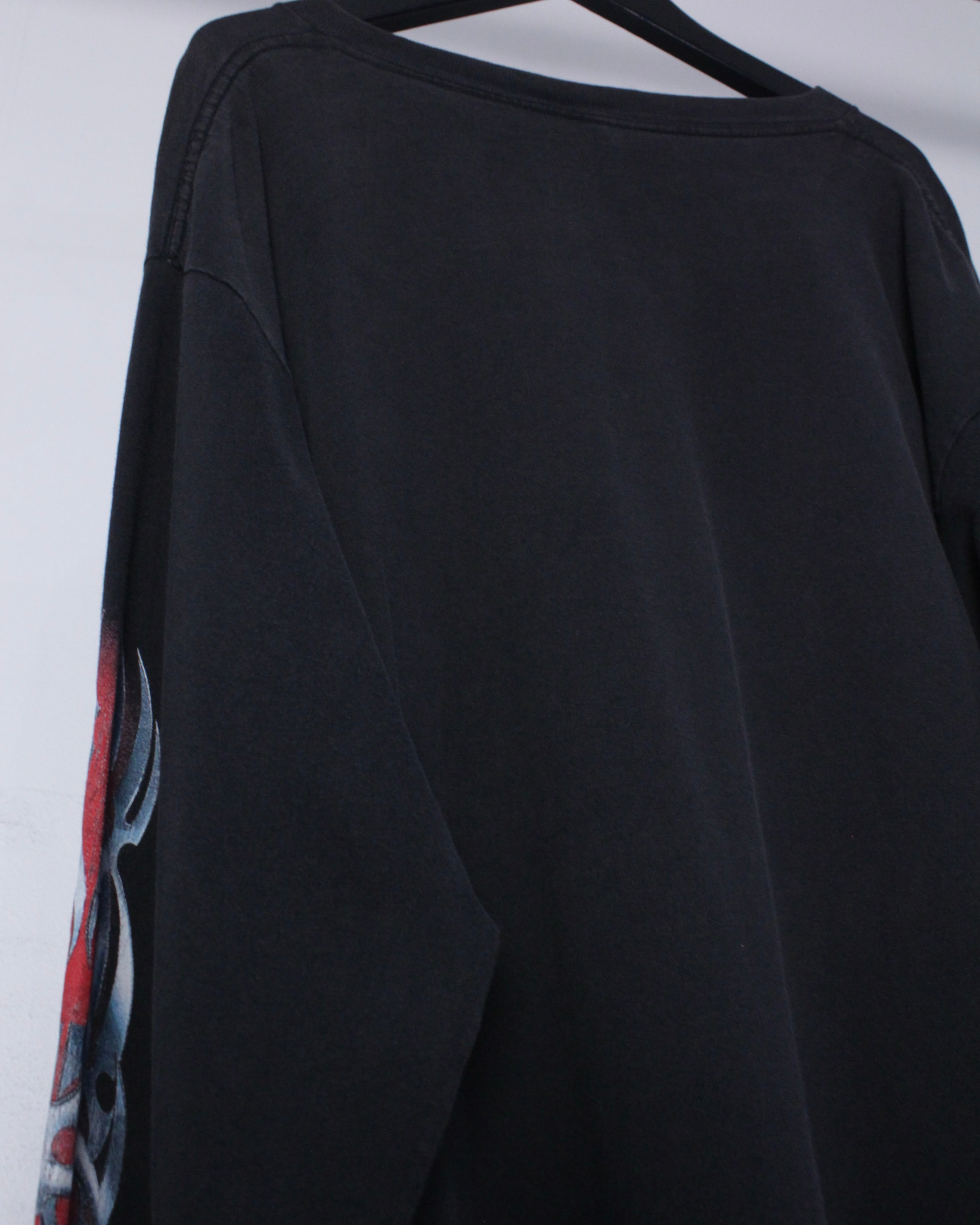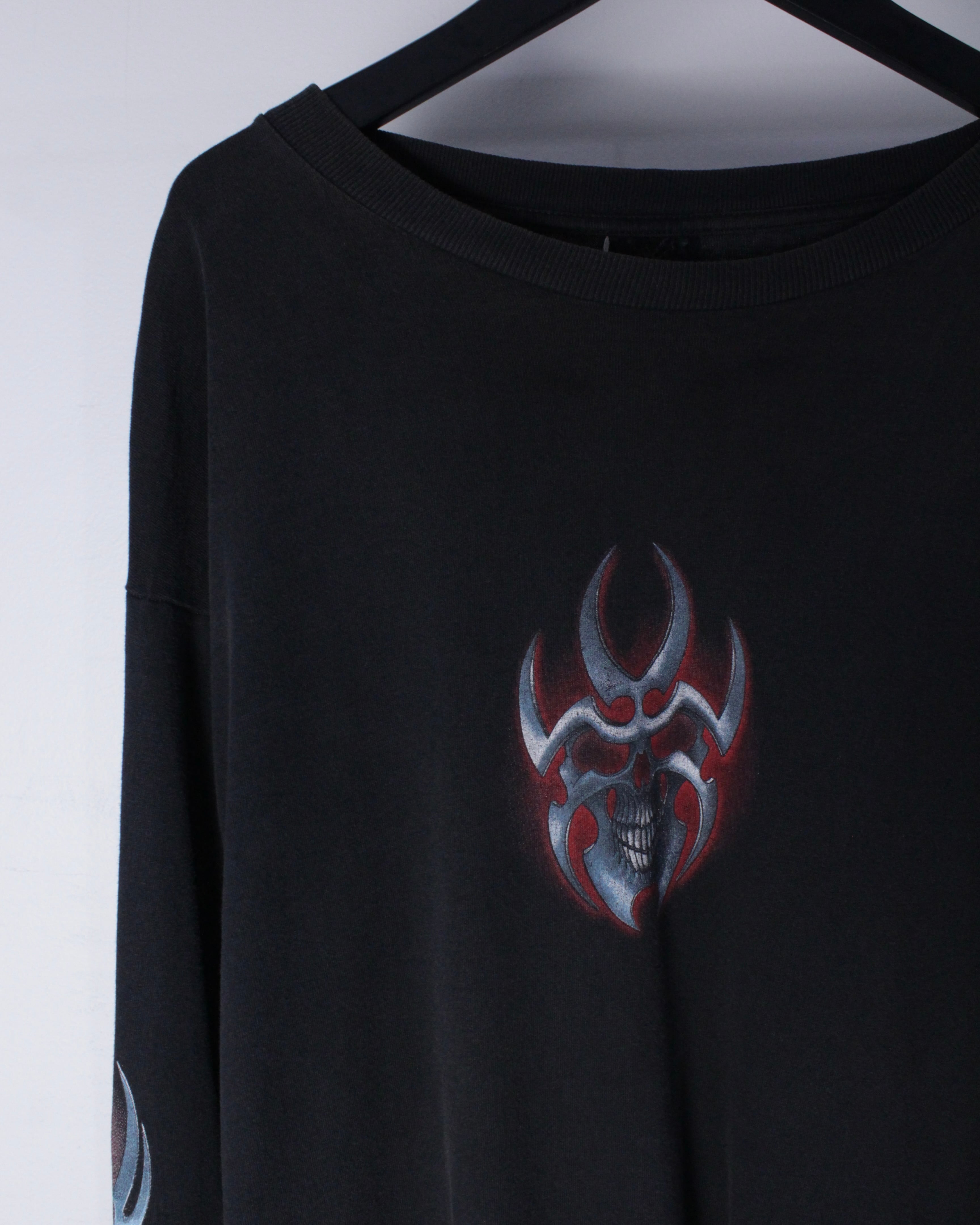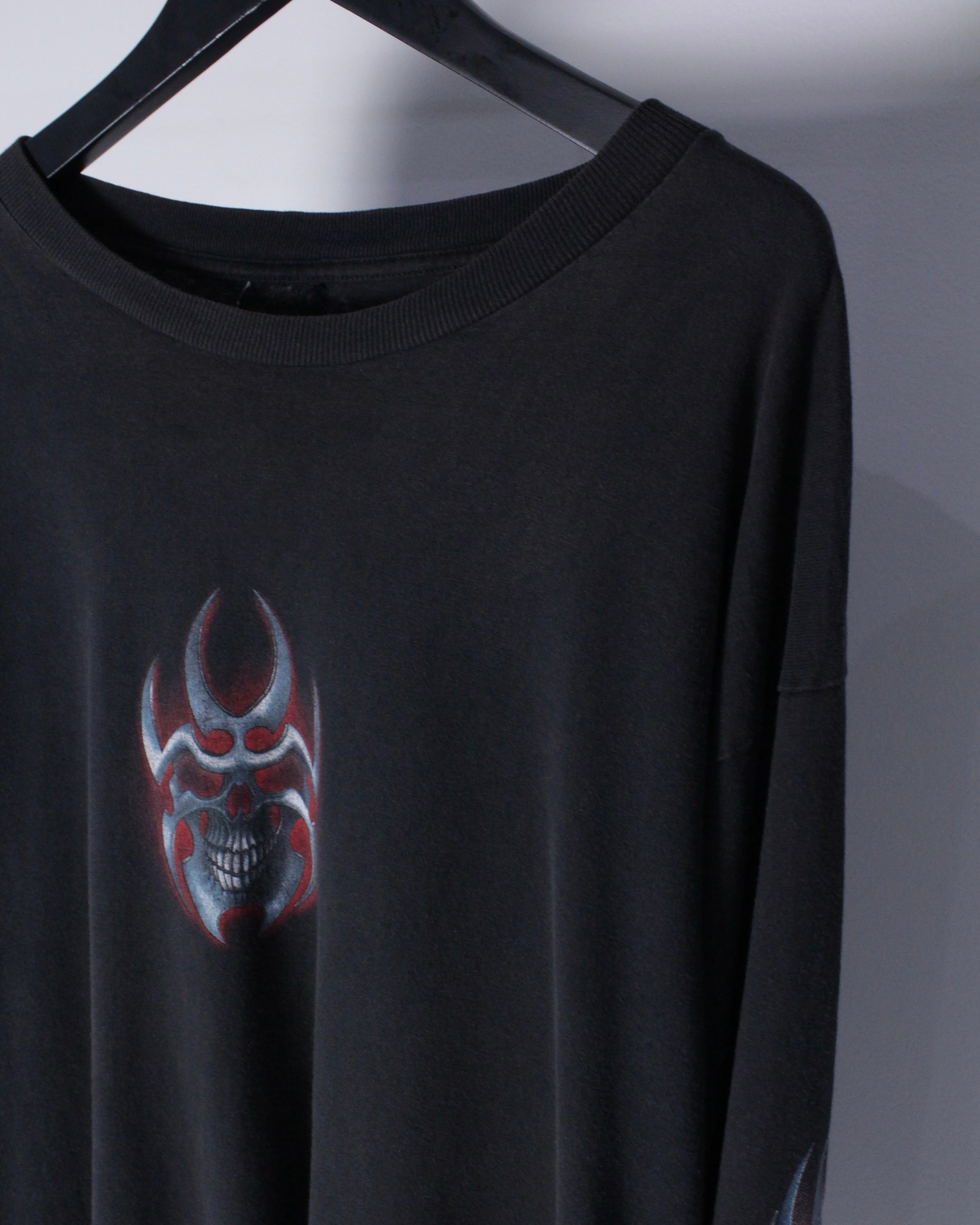 フェードブラックのボディに、フロント、アームにトライバルなスカル風のデザインをプリントで載せたロンT。